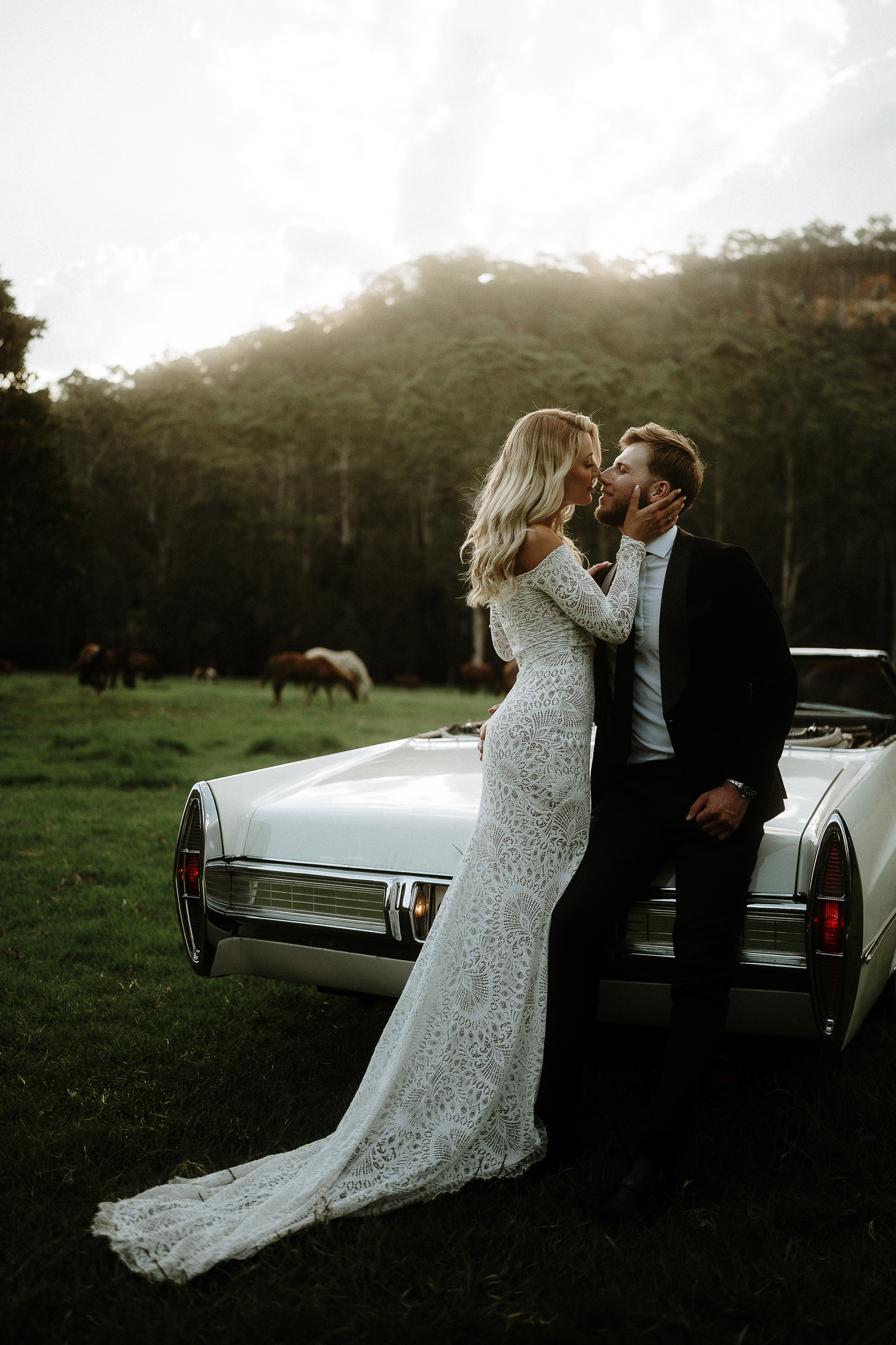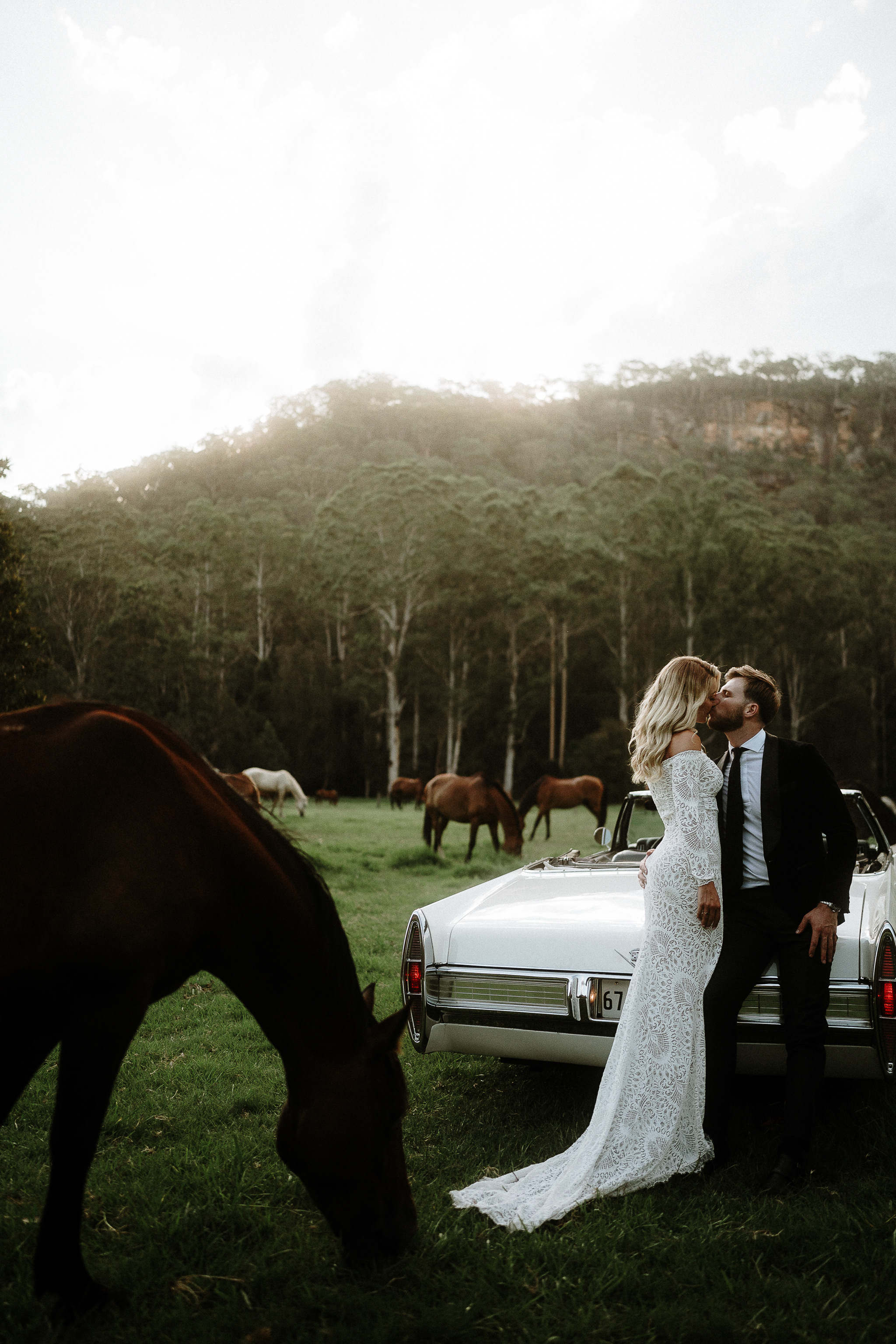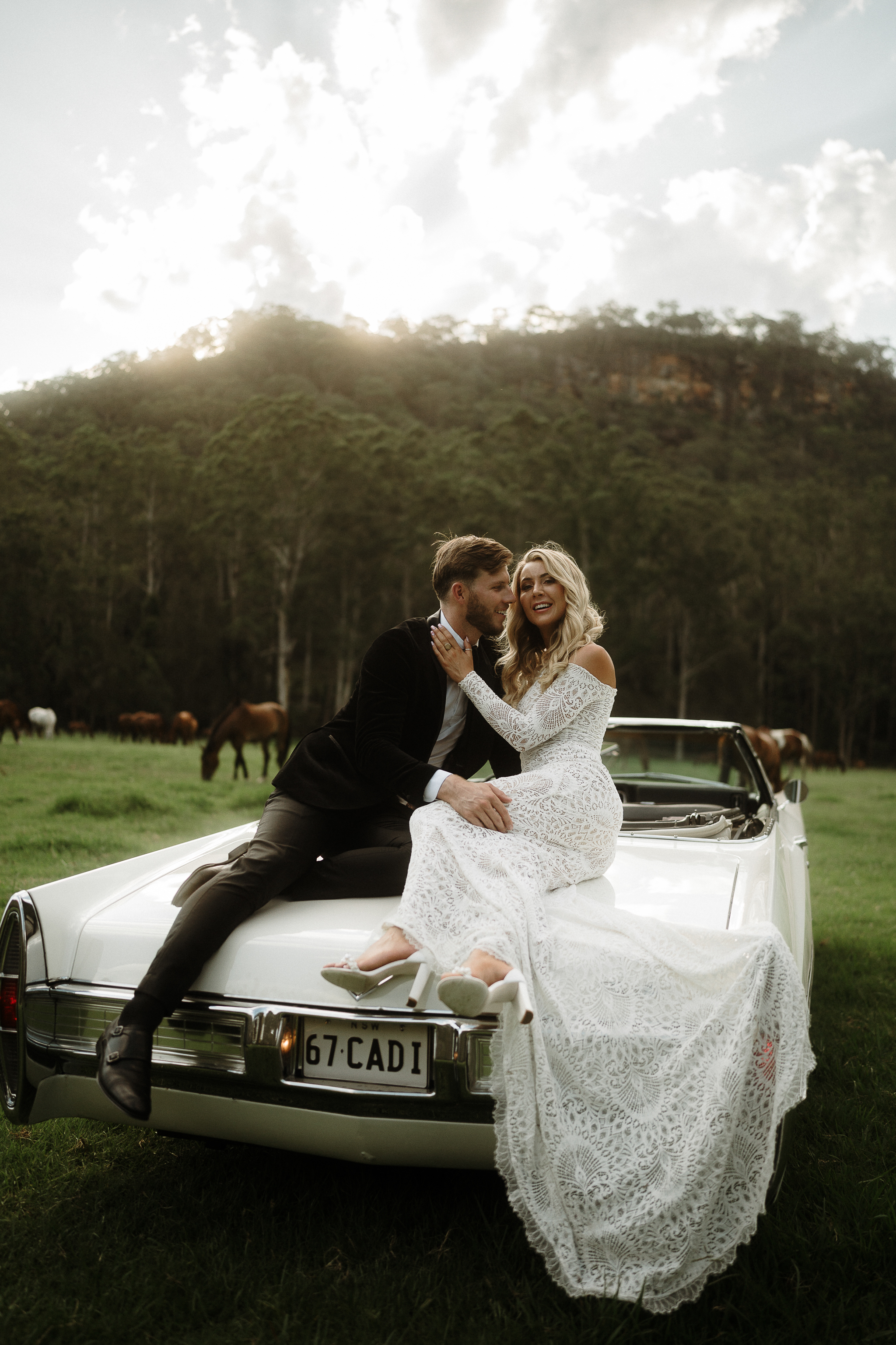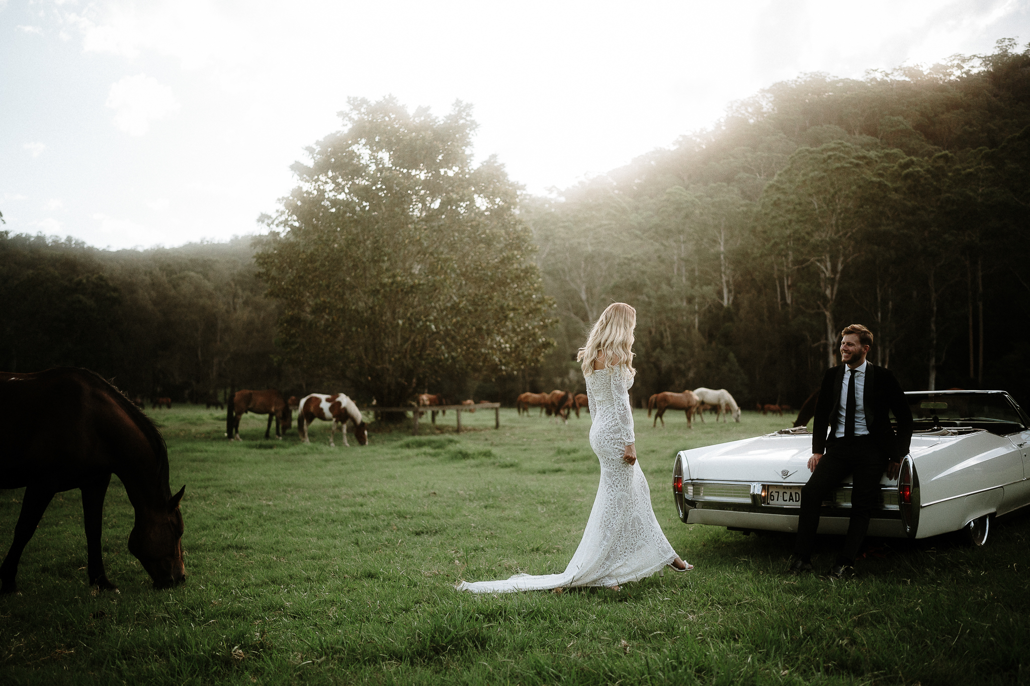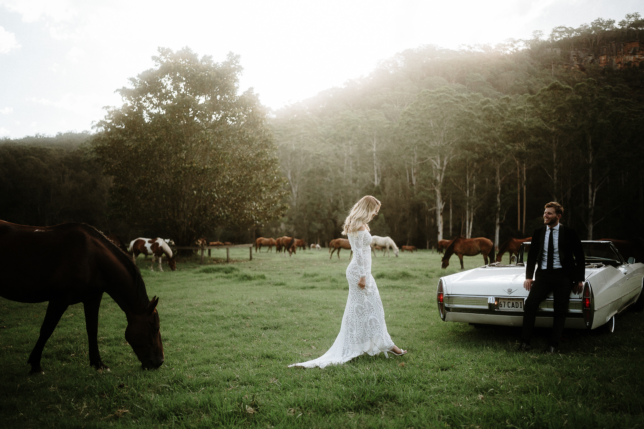 This beautiful photoshoot was done in the Glenworth valley weddings venue! If you are interested in shooting with horses and a beautiful landscape near Sydney, this is the place to be! All the things you see in this photoshoot, the car, dresses, suits, shoes, cake, champagne tower and the beautiful couple have all helped this shoot to achieve this beautiful look! I will post them all below as I highly recommend using these vendors! Car: @caddychicevents/ Bow dress: @kwhbridal/ Lace dresses: @grace_loves_lace/ Suits: @thdr_co/ Bridal shoes: @harloau/ Cake: @_sammiecakes