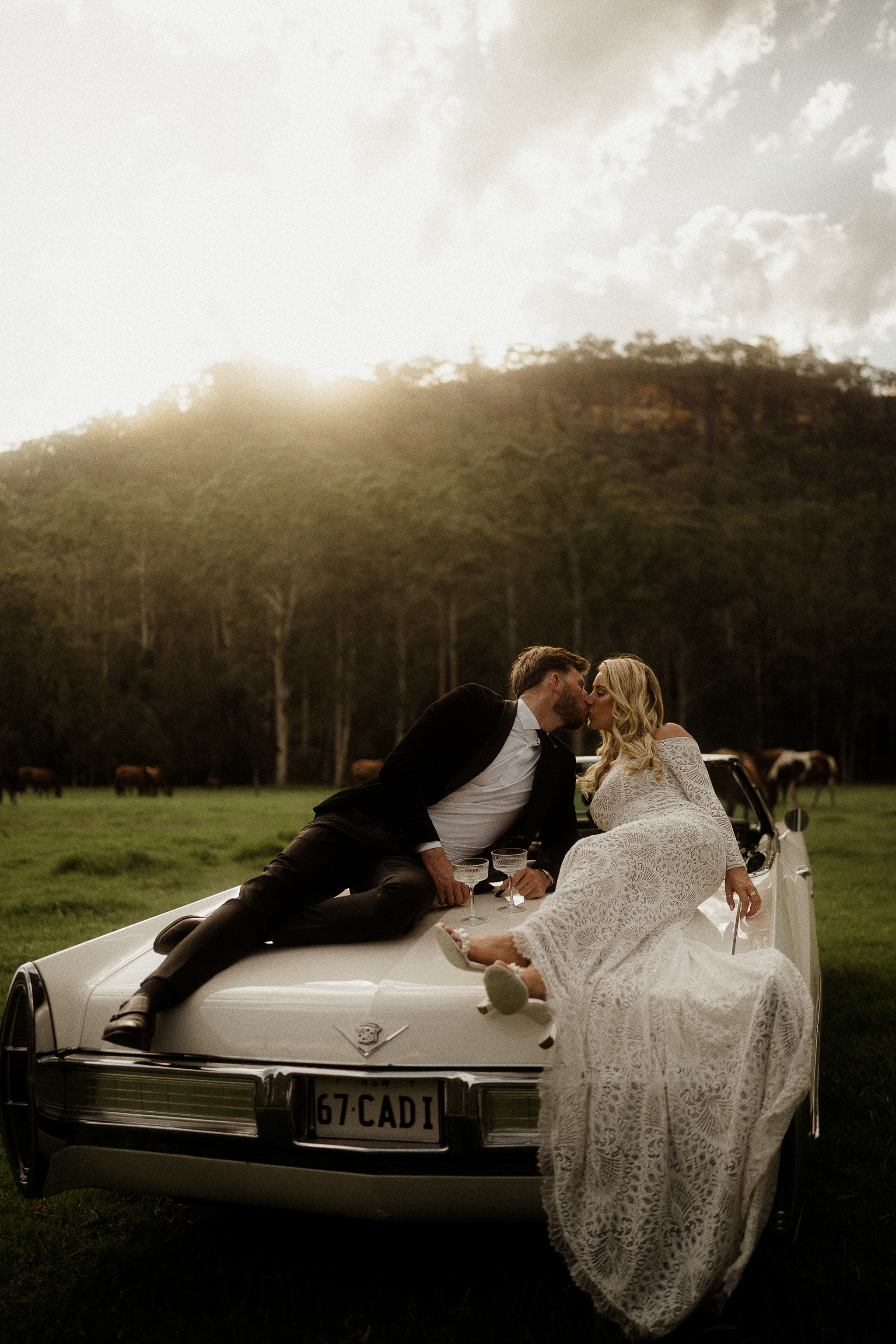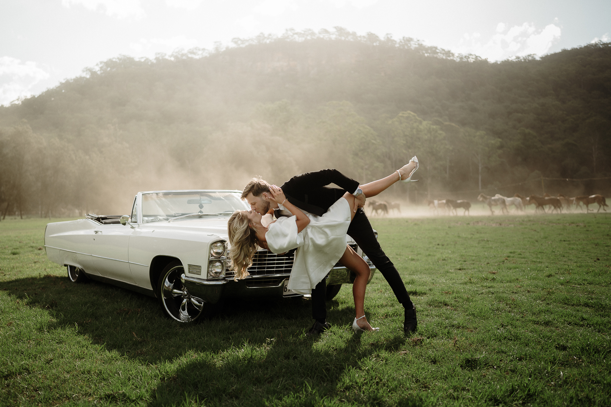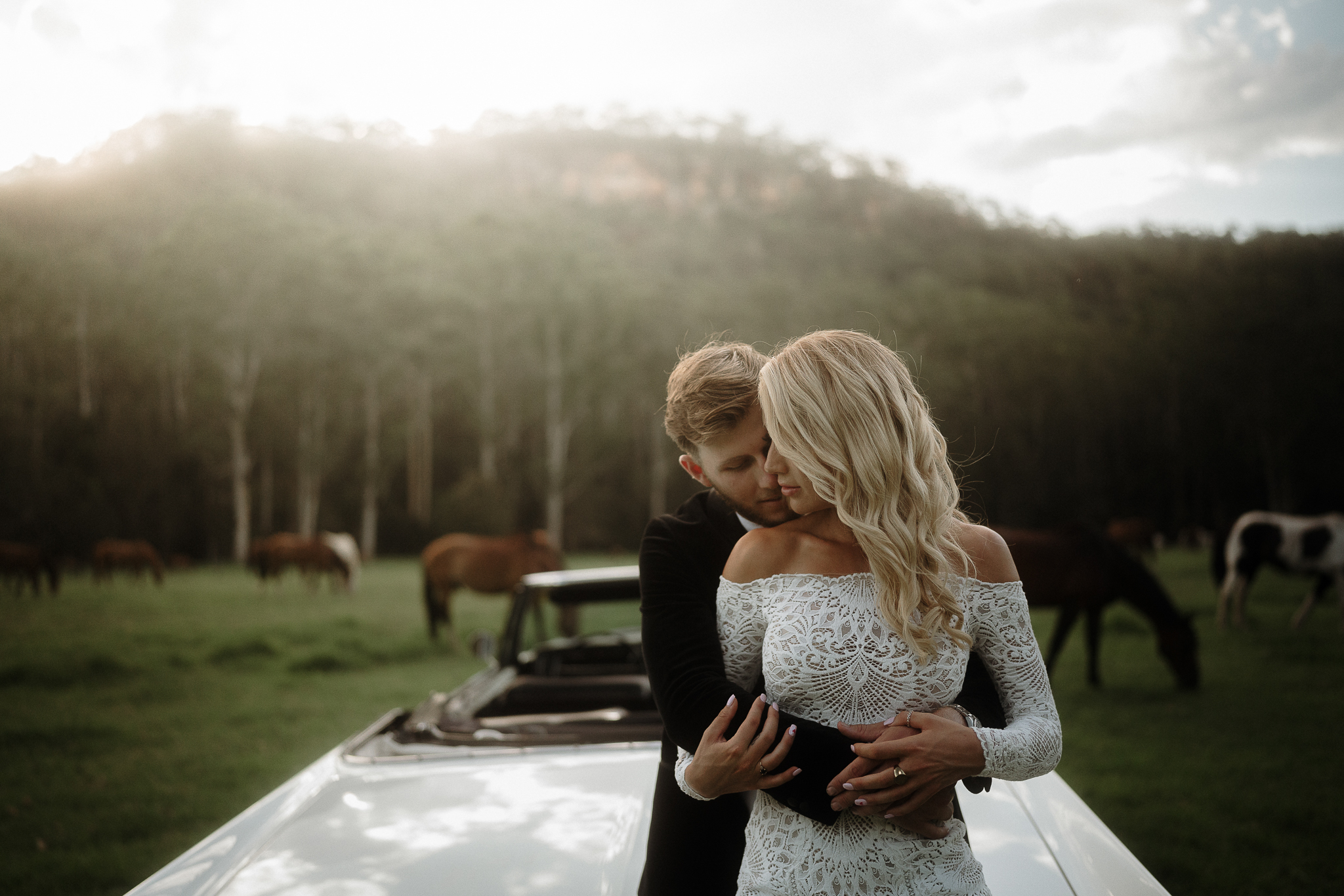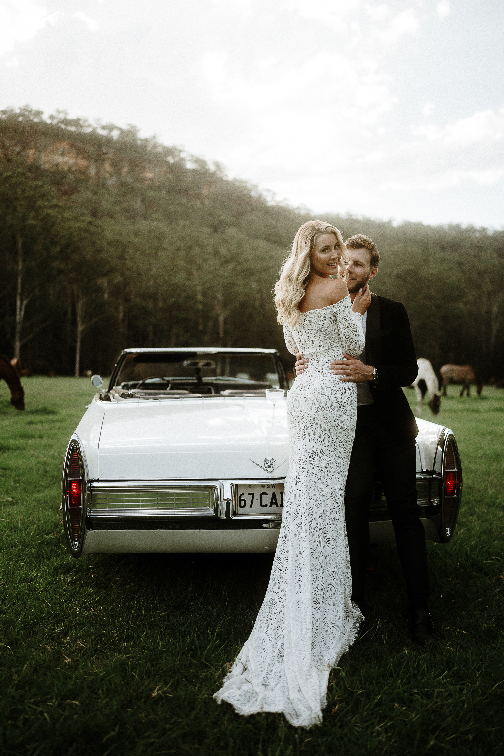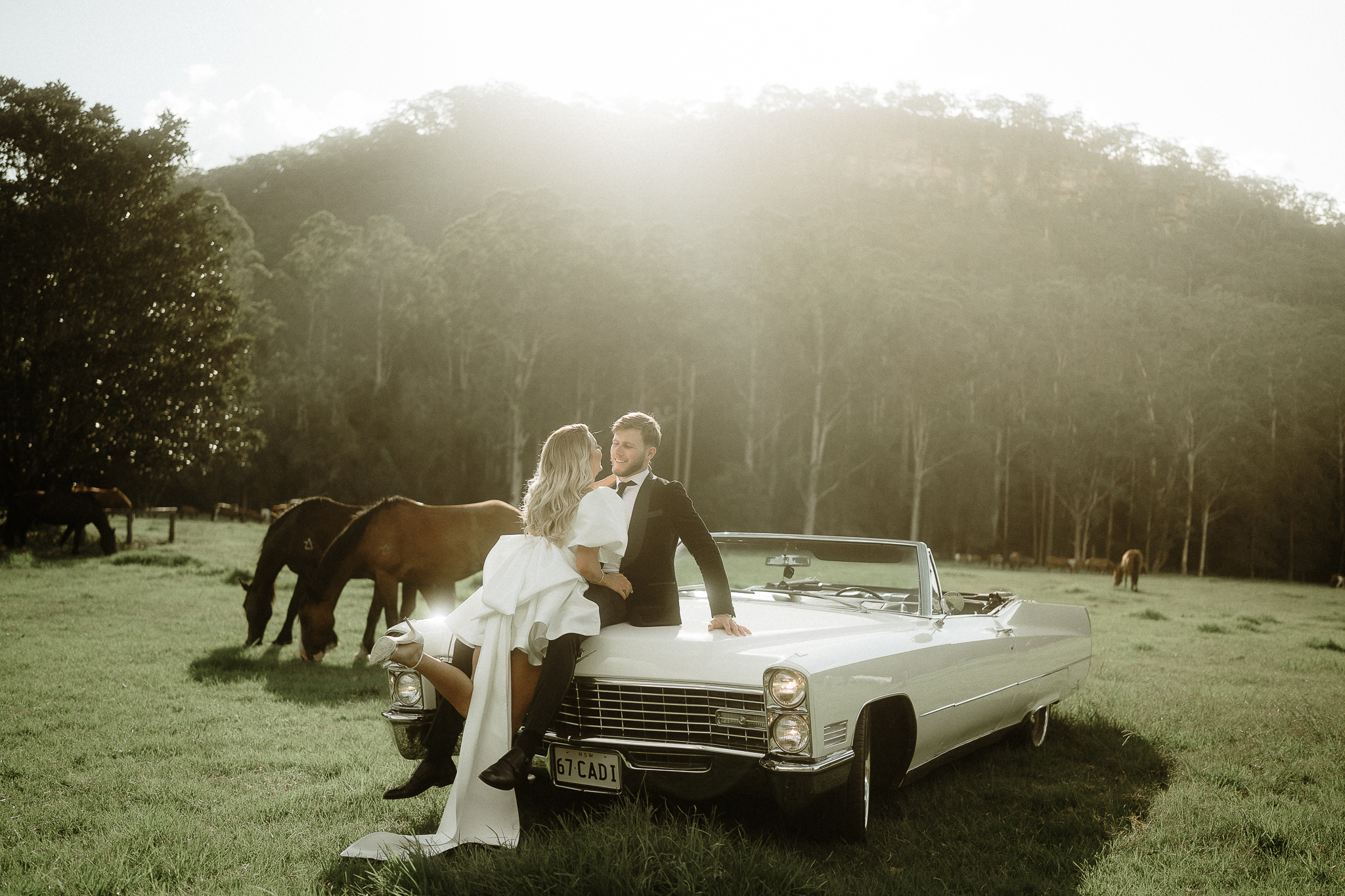 This beautiful photoshoot was done in the Glenworth valley weddings venue! If you are interested in shooting with horses and a beautiful landscape near Sydney, this is the place to be! All the things you see in this photoshoot, the car, dresses, suits, shoes, cake, champagne tower and the beautiful couple have all helped this shoot to achieve this beautiful look! I will post them all below as I highly recommend using these vendors! Car: @caddychicevents/ Bow dress: @kwhbridal/ Lace dresses: @grace_loves_lace/ Suits: @thdr_co/ Bridal shoes: @harloau/ Cake: @_sammiecakes