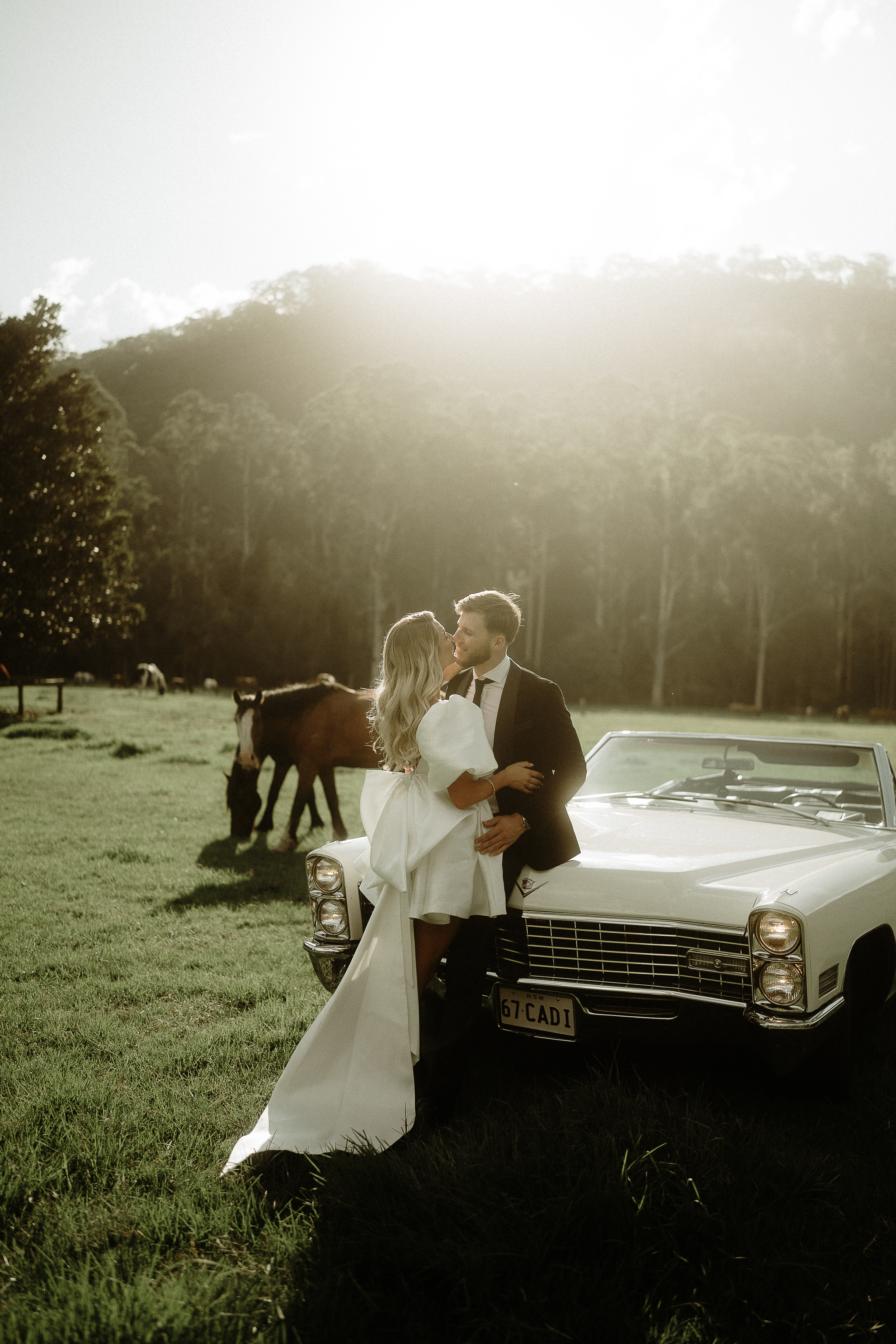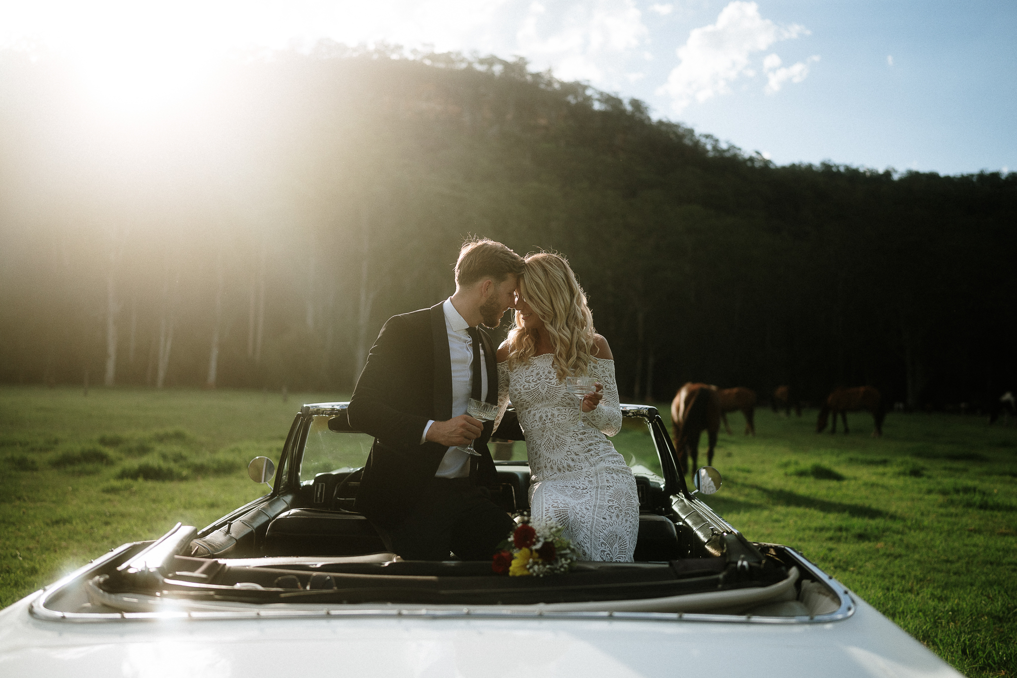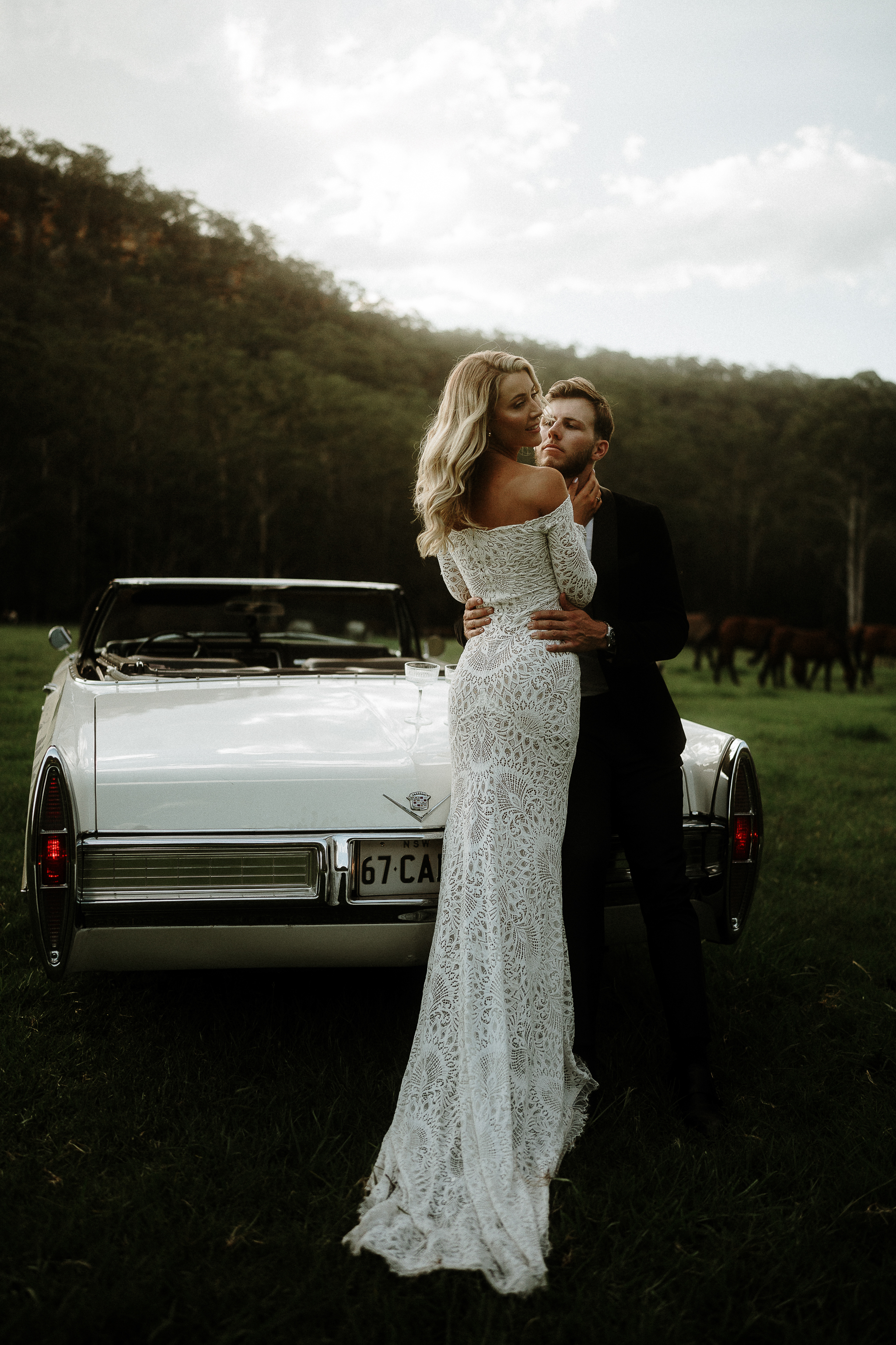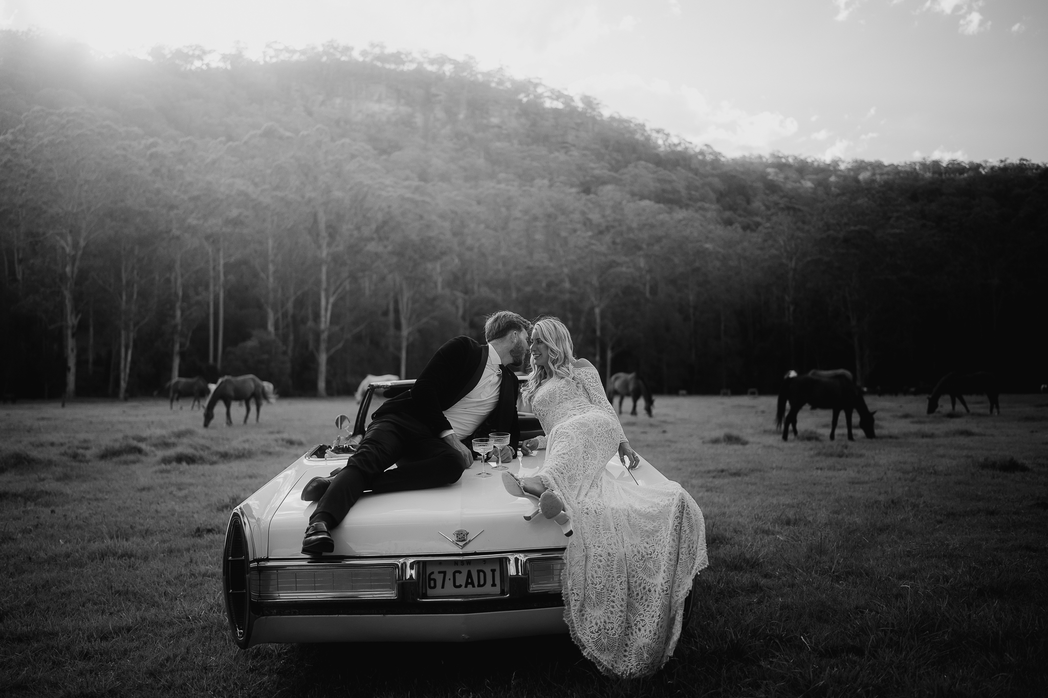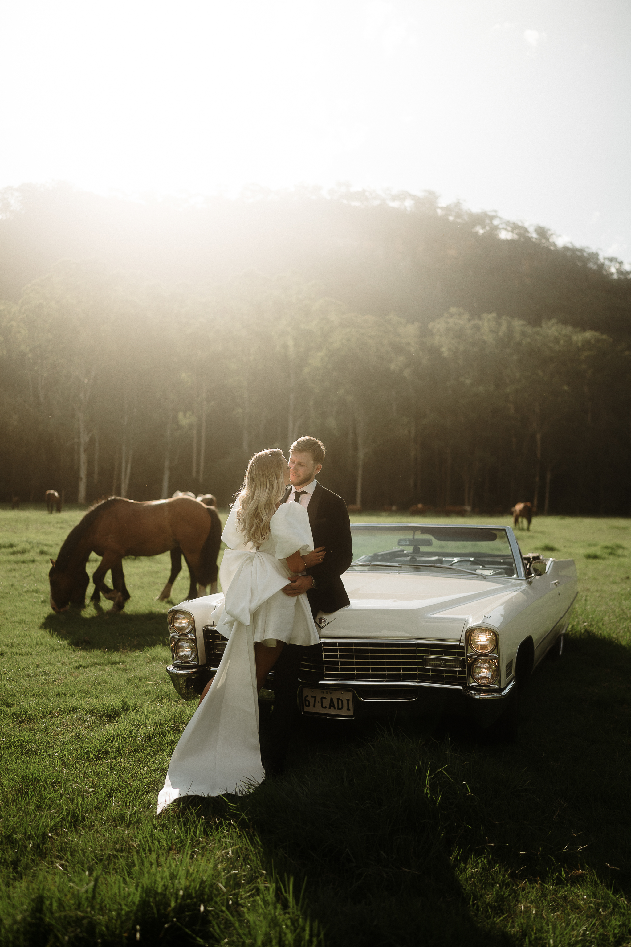 This beautiful photoshoot was done in the Glenworth valley weddings venue! If you are interested in shooting with horses and a beautiful landscape near Sydney, this is the place to be! All the things you see in this photoshoot, the car, dresses, suits, shoes, cake, champagne tower and the beautiful couple have all helped this shoot to achieve this beautiful look! I will post them all below as I highly recommend using these vendors! Car: @caddychicevents/ Bow dress: @kwhbridal/ Lace dresses: @grace_loves_lace/ Suits: @thdr_co/ Bridal shoes: @harloau/ Cake: @_sammiecakes