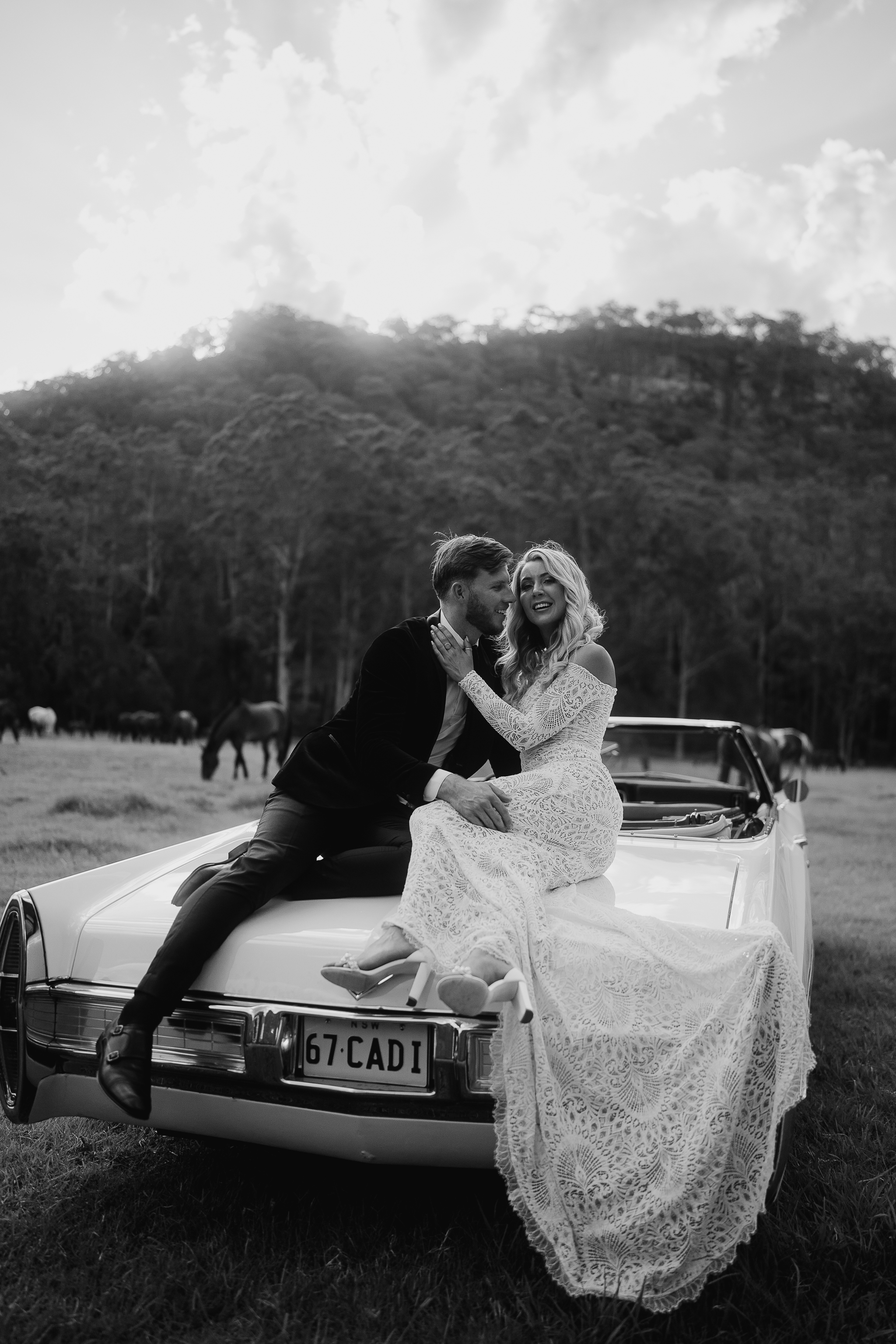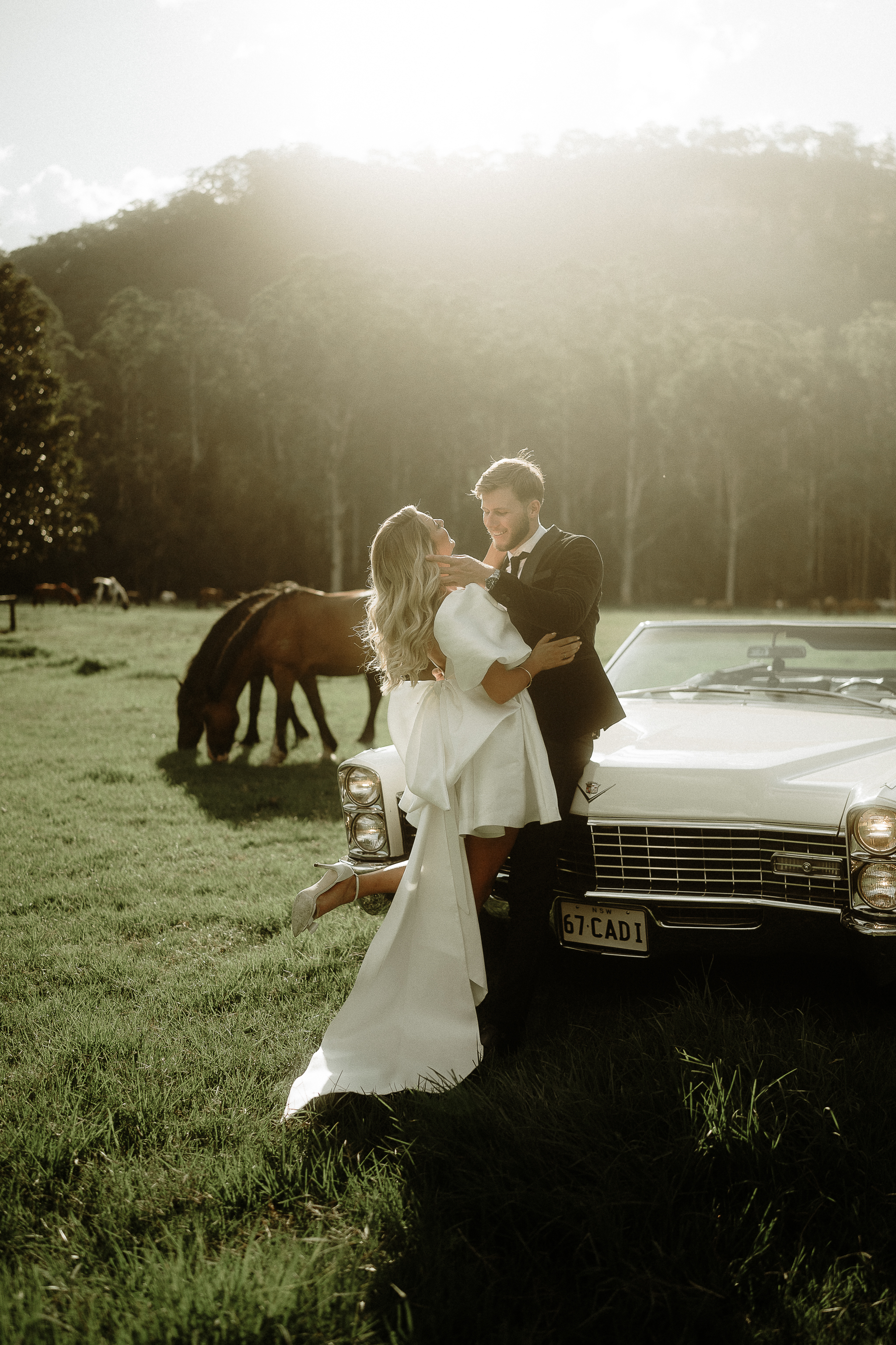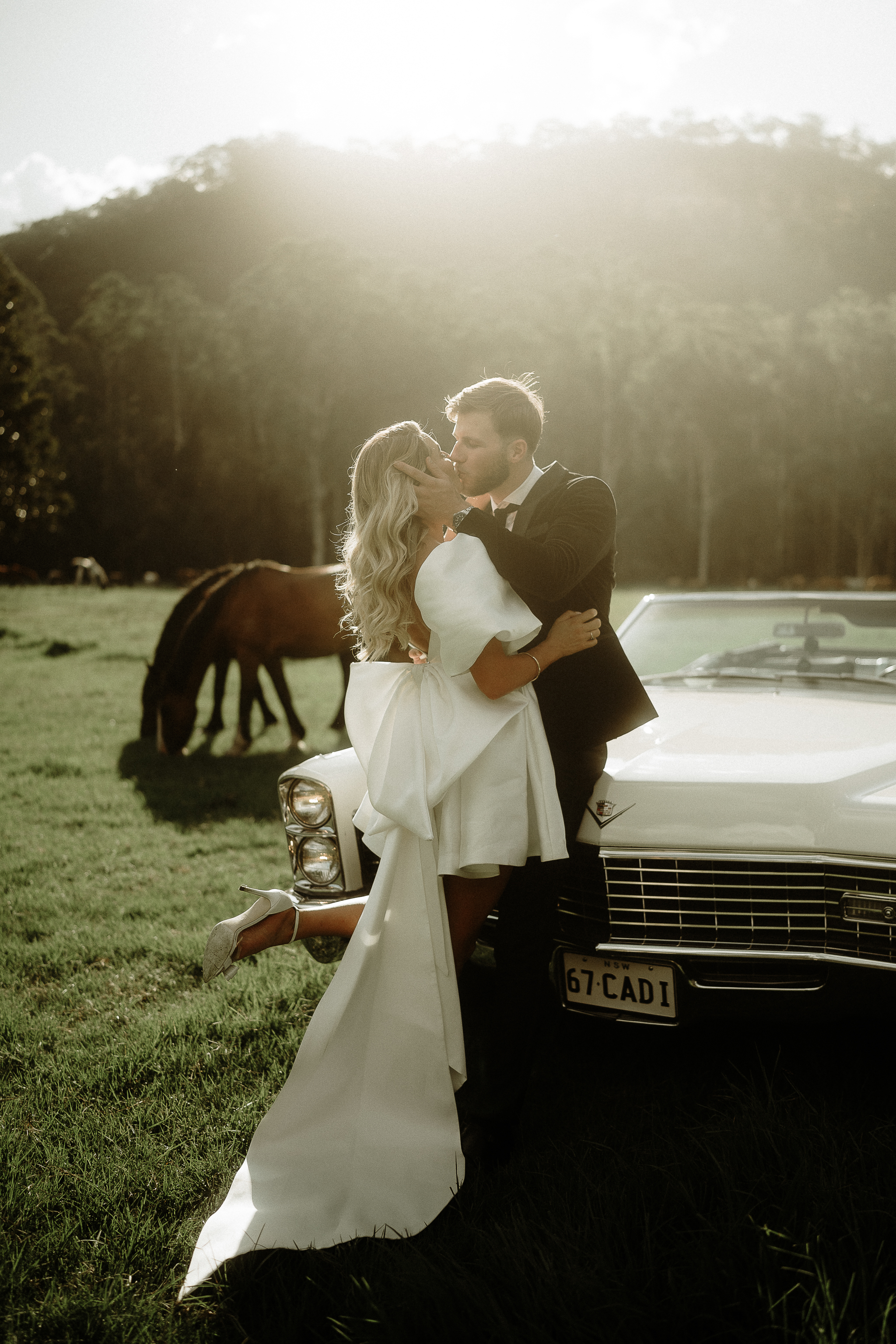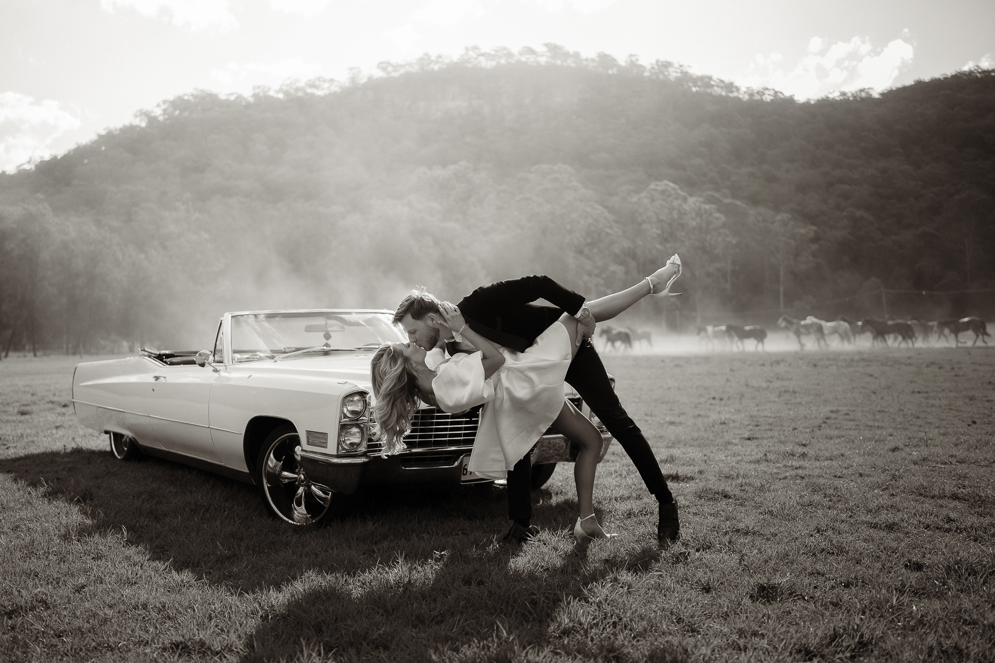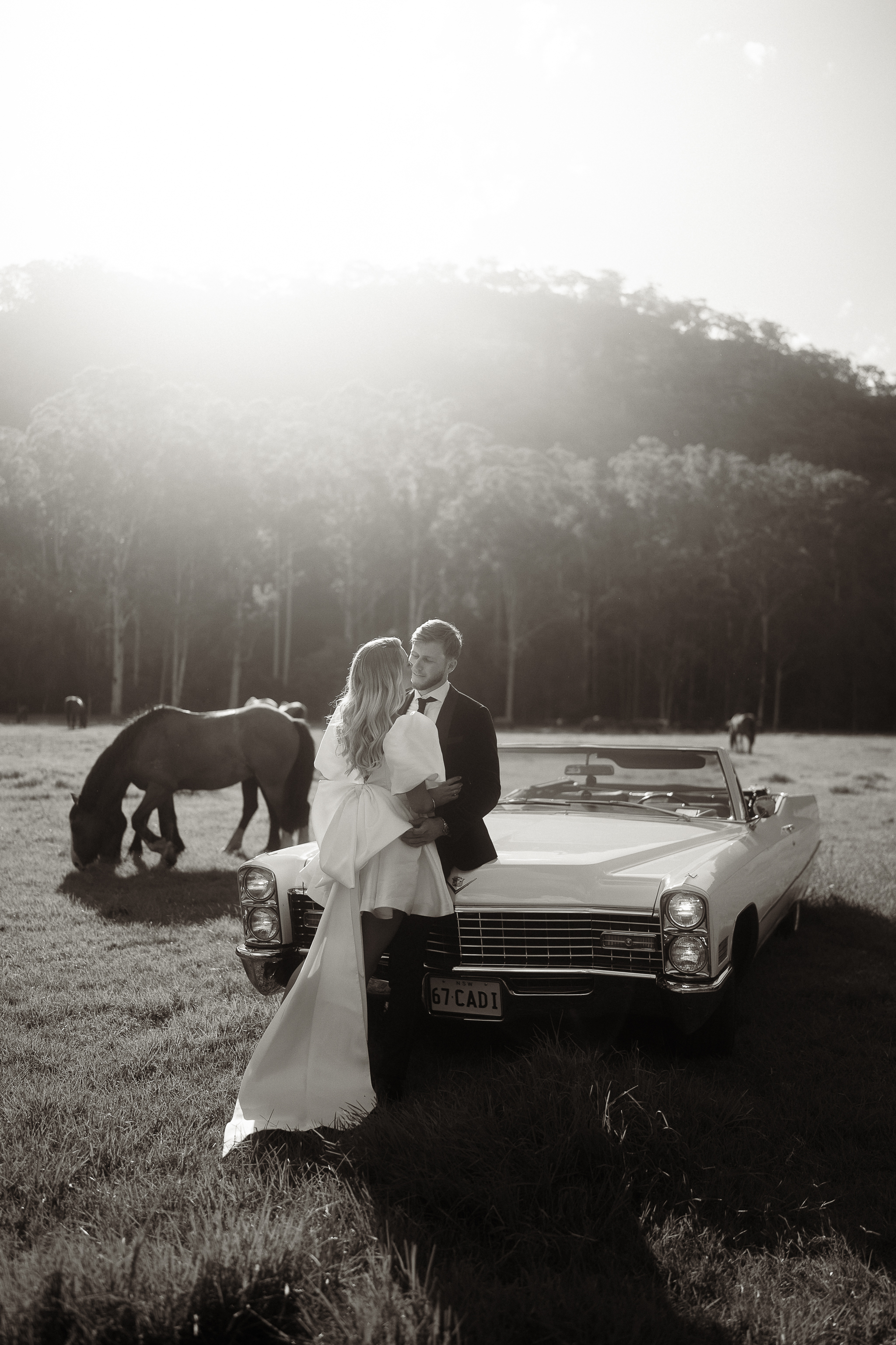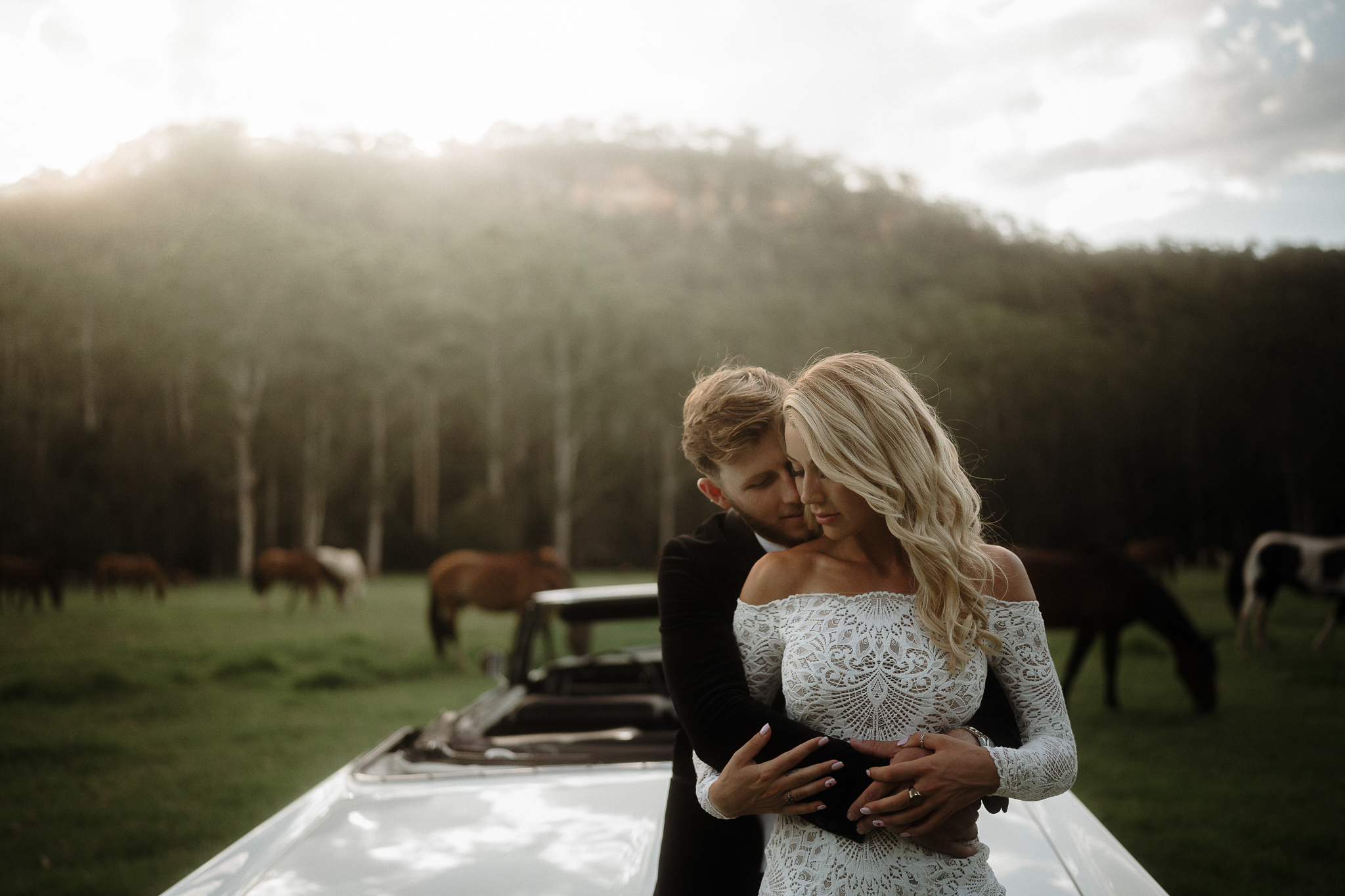 This beautiful photoshoot was done in the Glenworth valley weddings venue! If you are interested in shooting with horses and a beautiful landscape near Sydney, this is the place to be! All the things you see in this photoshoot, the car, dresses, suits, shoes, cake, champagne tower and the beautiful couple have all helped this shoot to achieve this beautiful look! I will post them all below as I highly recommend using these vendors! Car: @caddychicevents/ Bow dress: @kwhbridal/ Lace dresses: @grace_loves_lace/ Suits: @thdr_co/ Bridal shoes: @harloau/ Cake: @_sammiecakes