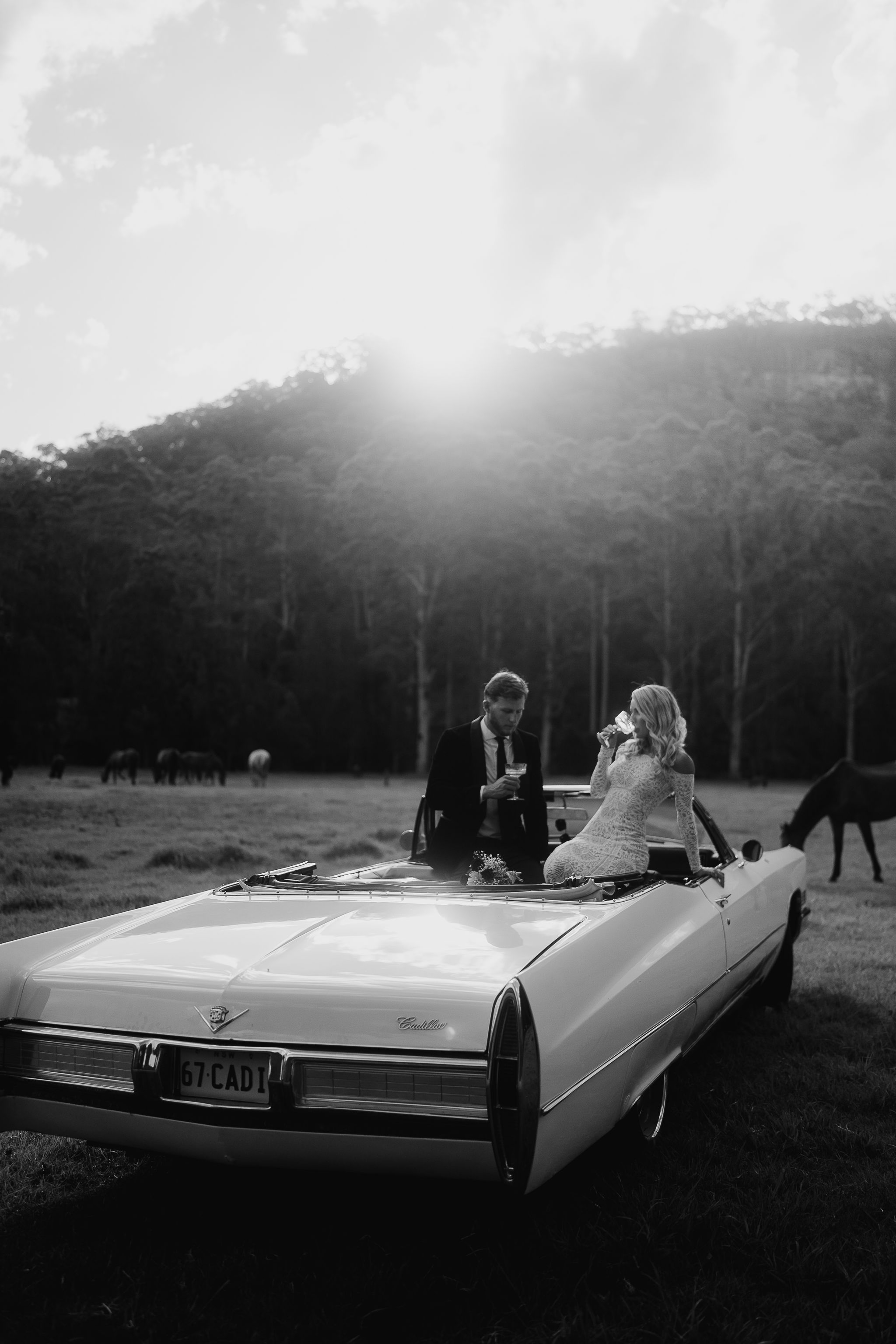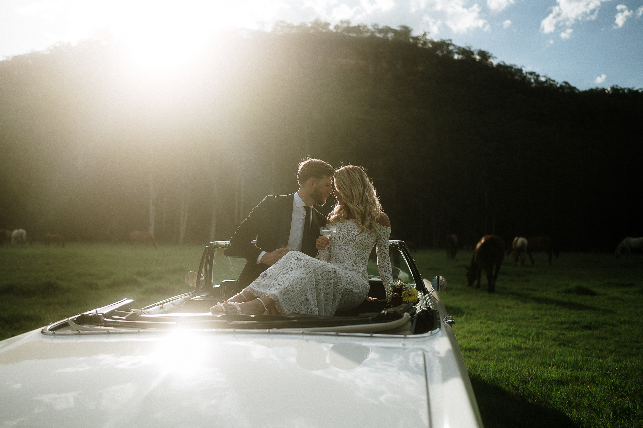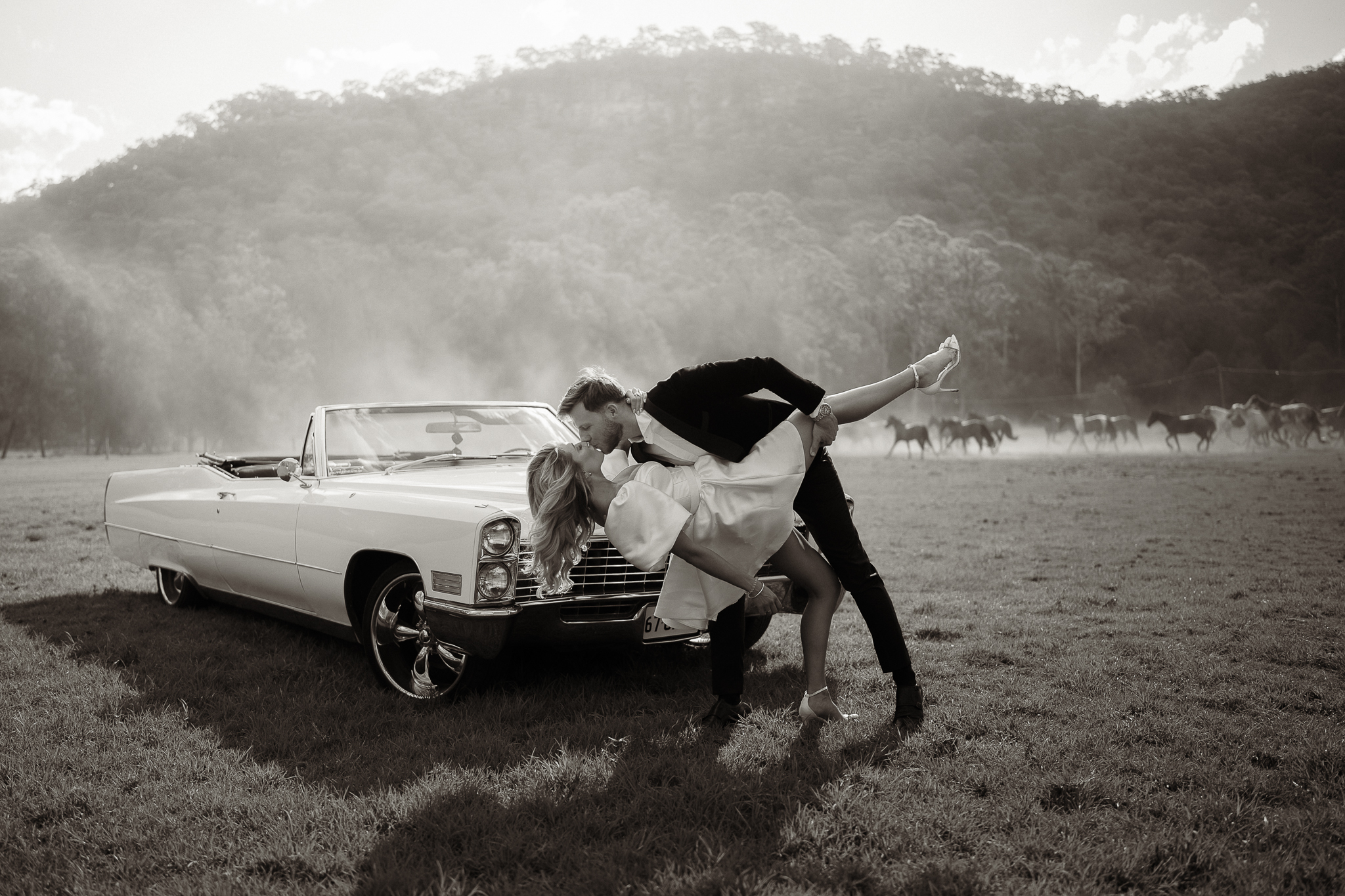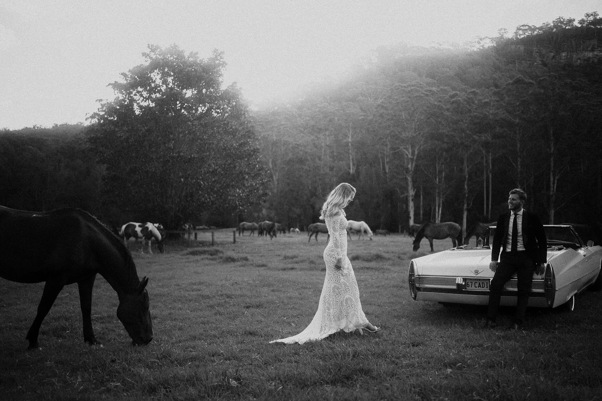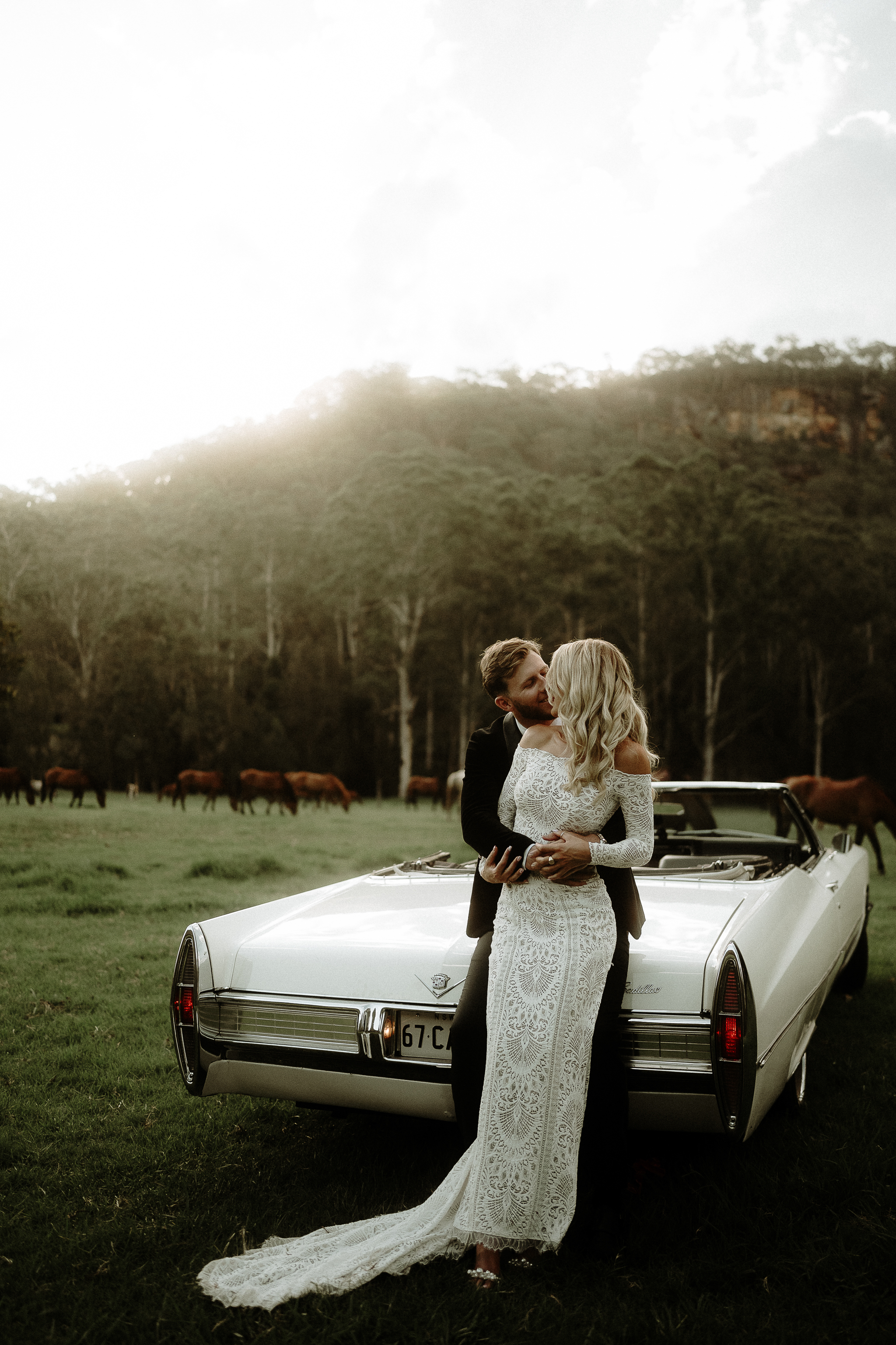 This beautiful photoshoot was done in the Glenworth valley weddings venue! If you are interested in shooting with horses and a beautiful landscape near Sydney, this is the place to be! All the things you see in this photoshoot, the car, dresses, suits, shoes, cake, champagne tower and the beautiful couple have all helped this shoot to achieve this beautiful look! I will post them all below as I highly recommend using these vendors! Car: @caddychicevents/ Bow dress: @kwhbridal/ Lace dresses: @grace_loves_lace/ Suits: @thdr_co/ Bridal shoes: @harloau/ Cake: @_sammiecakes