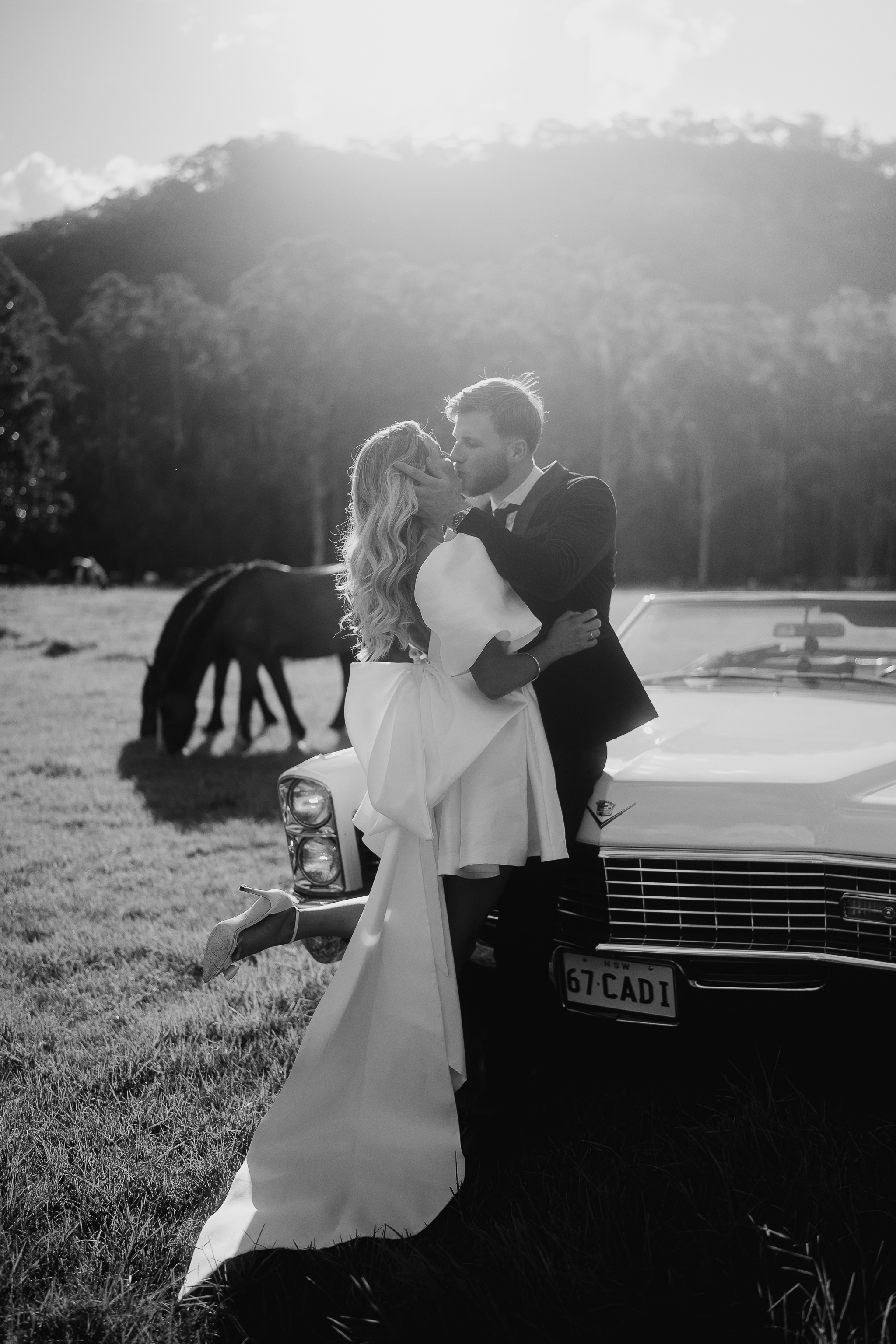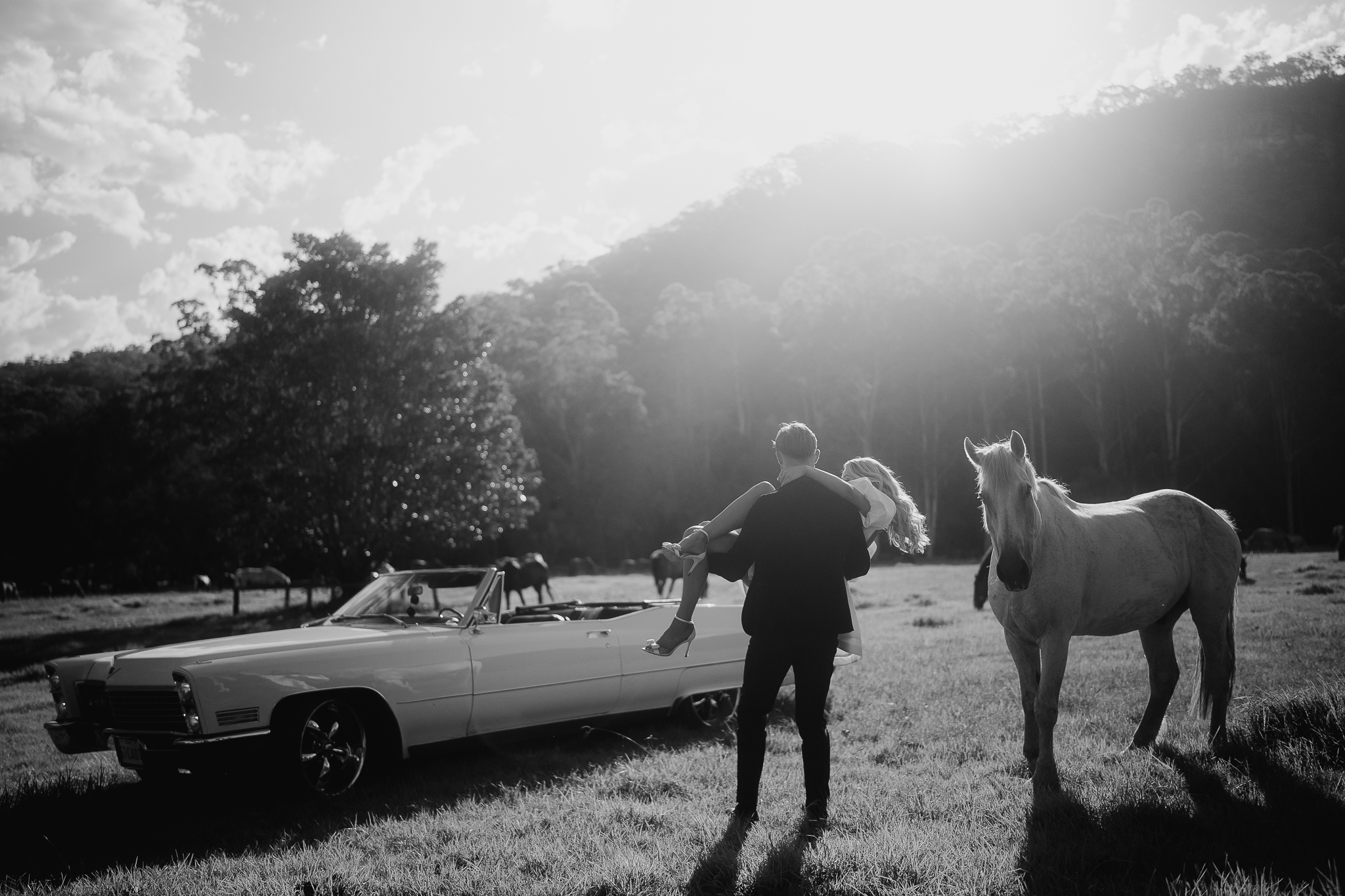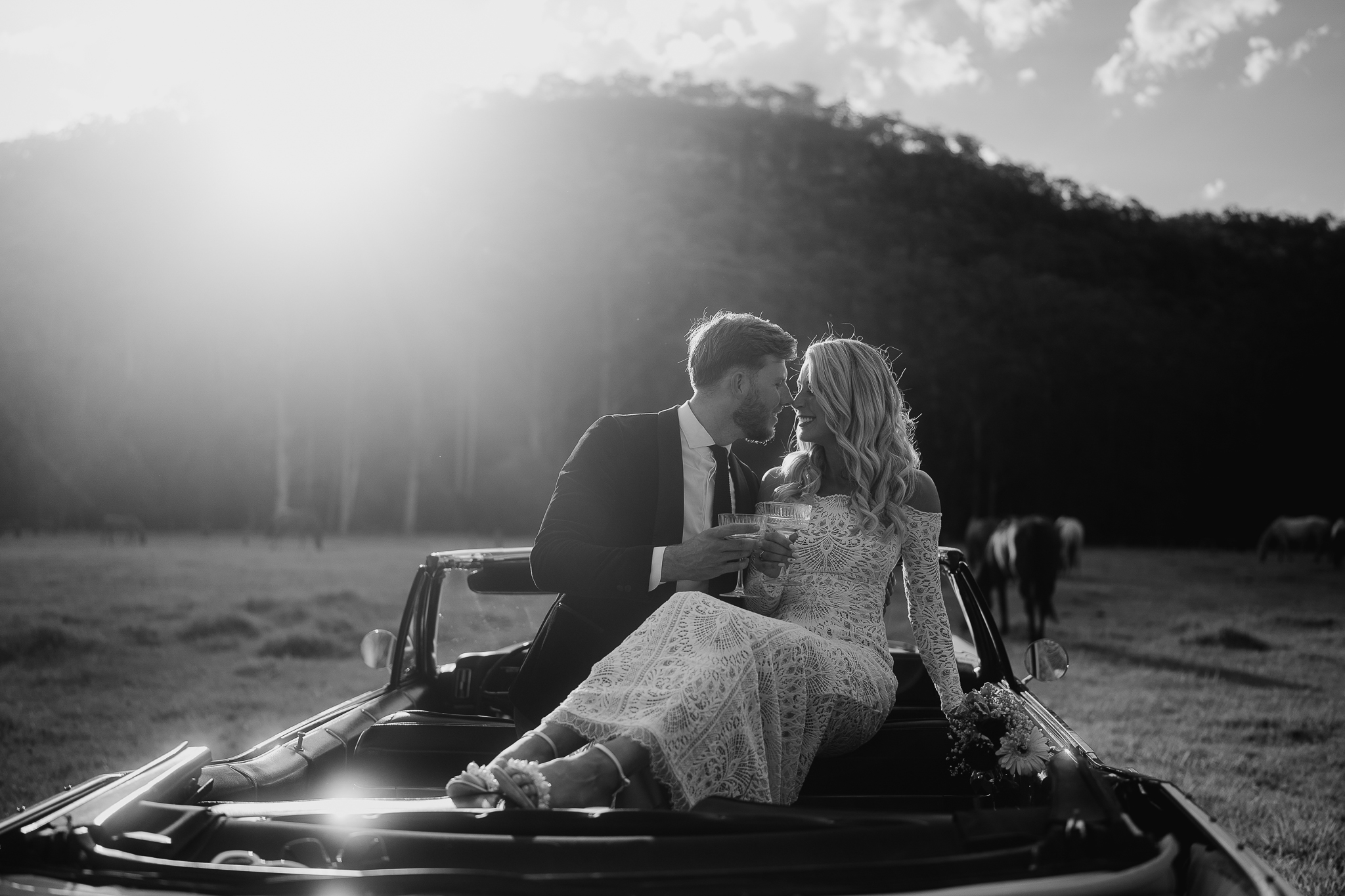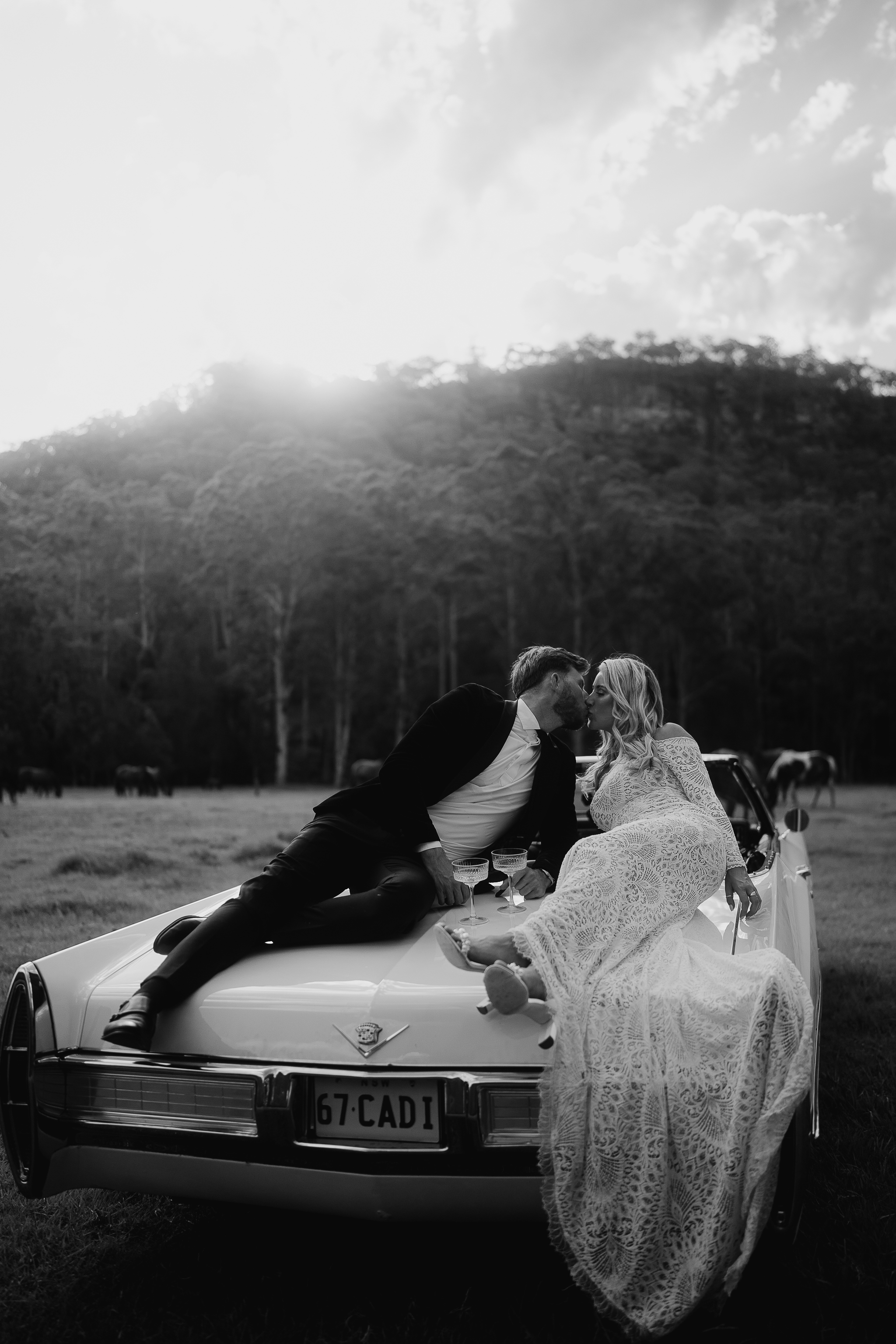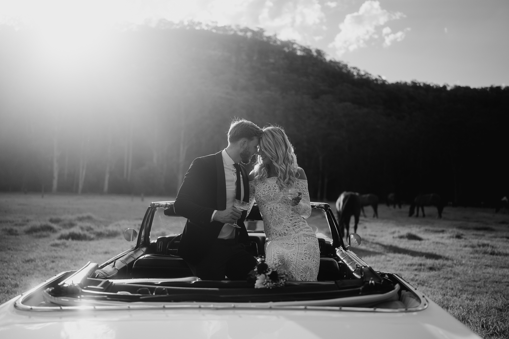 This beautiful photoshoot was done in the Glenworth valley weddings venue! If you are interested in shooting with horses and a beautiful landscape near Sydney, this is the place to be! All the things you see in this photoshoot, the car, dresses, suits, shoes, cake, champagne tower and the beautiful couple have all helped this shoot to achieve this beautiful look! I will post them all below as I highly recommend using these vendors! Car: @caddychicevents/ Bow dress: @kwhbridal/ Lace dresses: @grace_loves_lace/ Suits: @thdr_co/ Bridal shoes: @harloau/ Cake: @_sammiecakes
