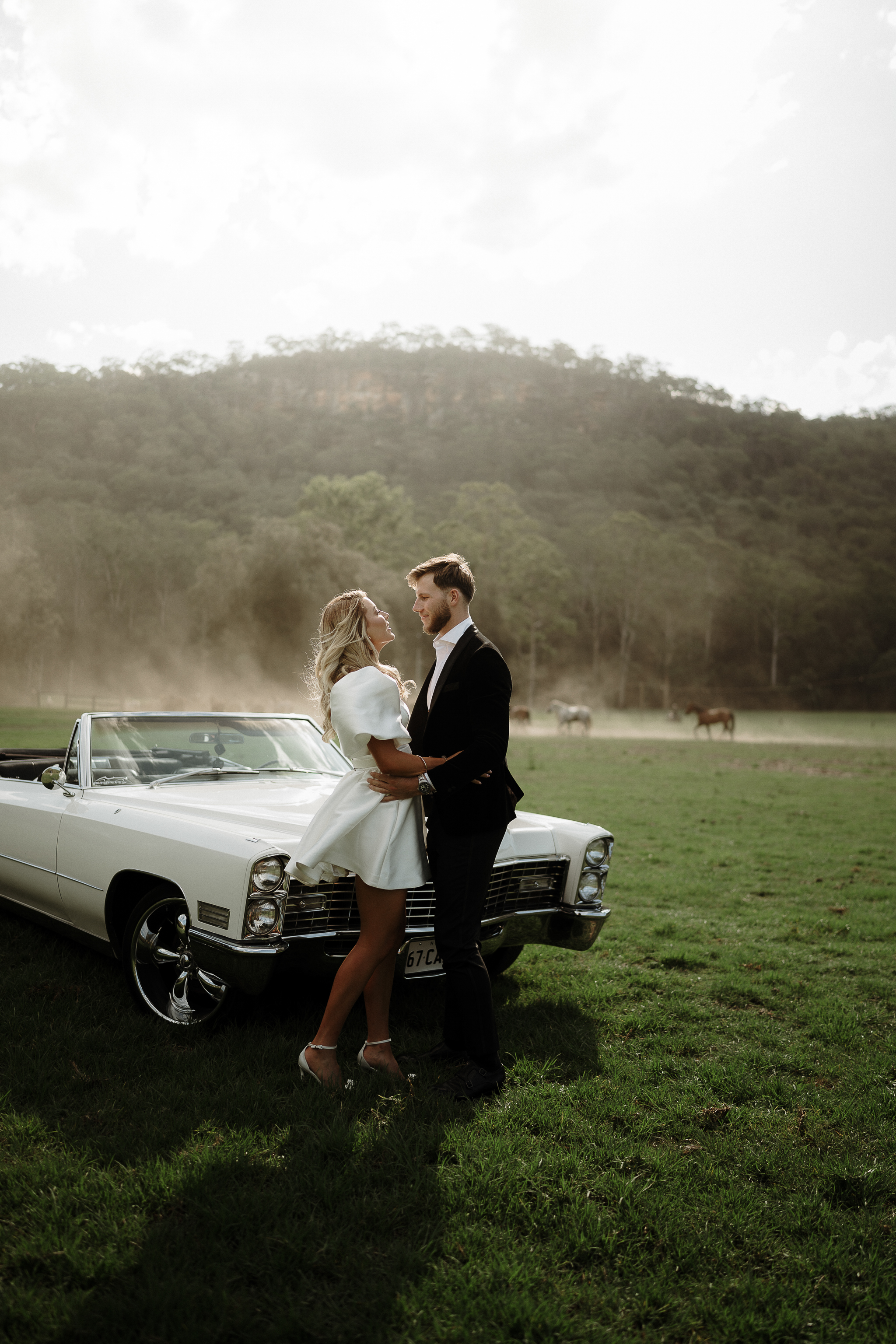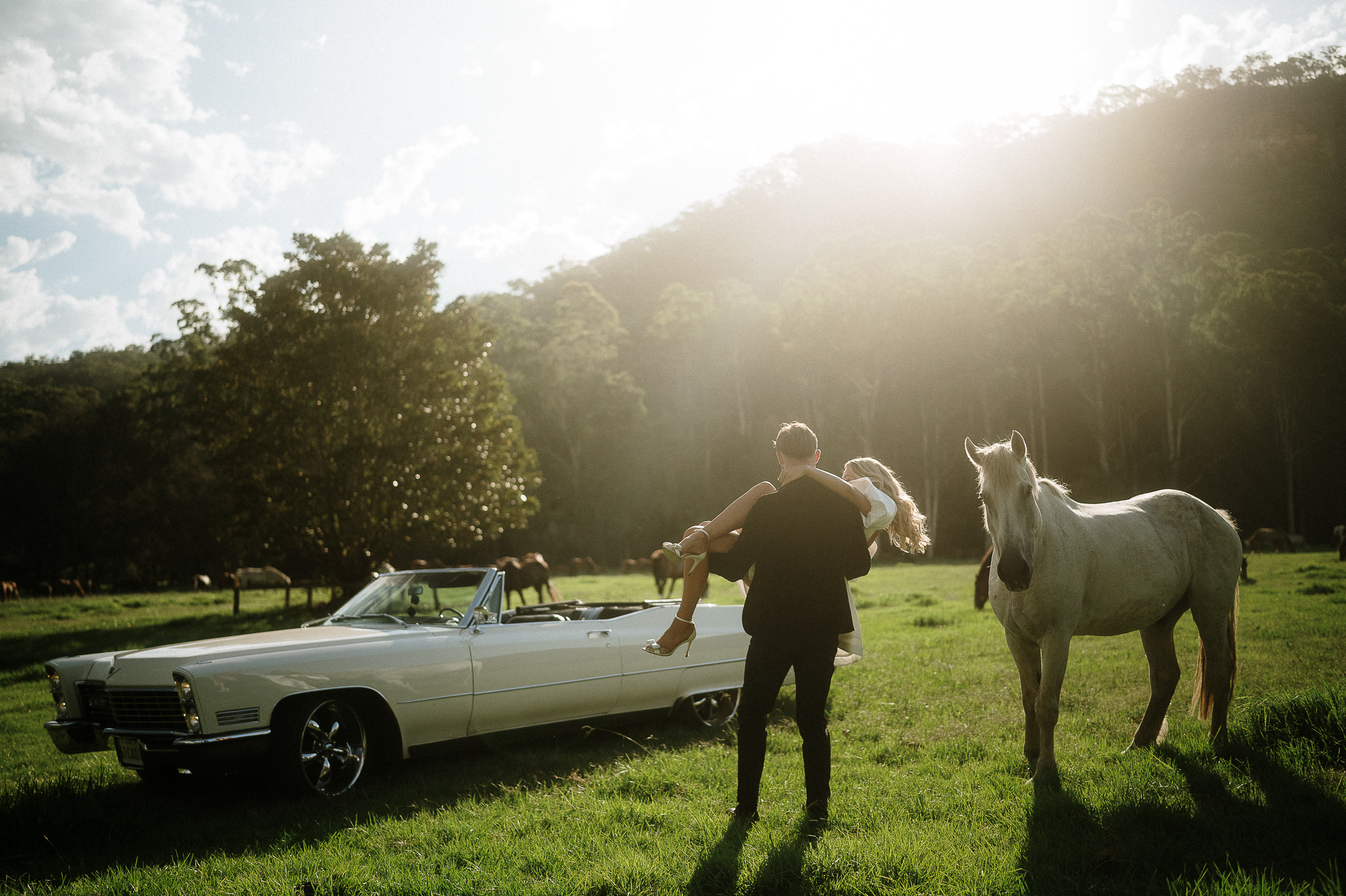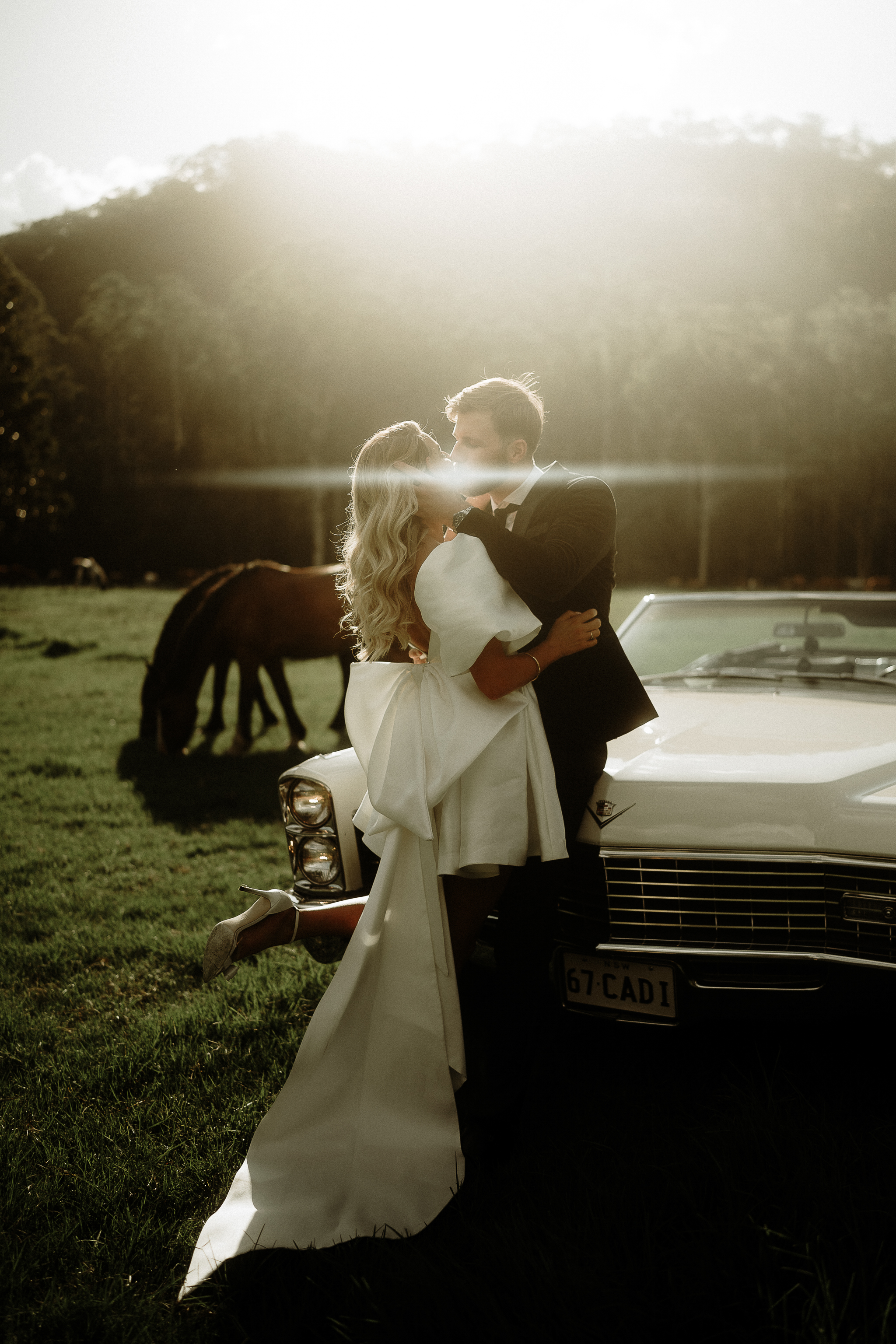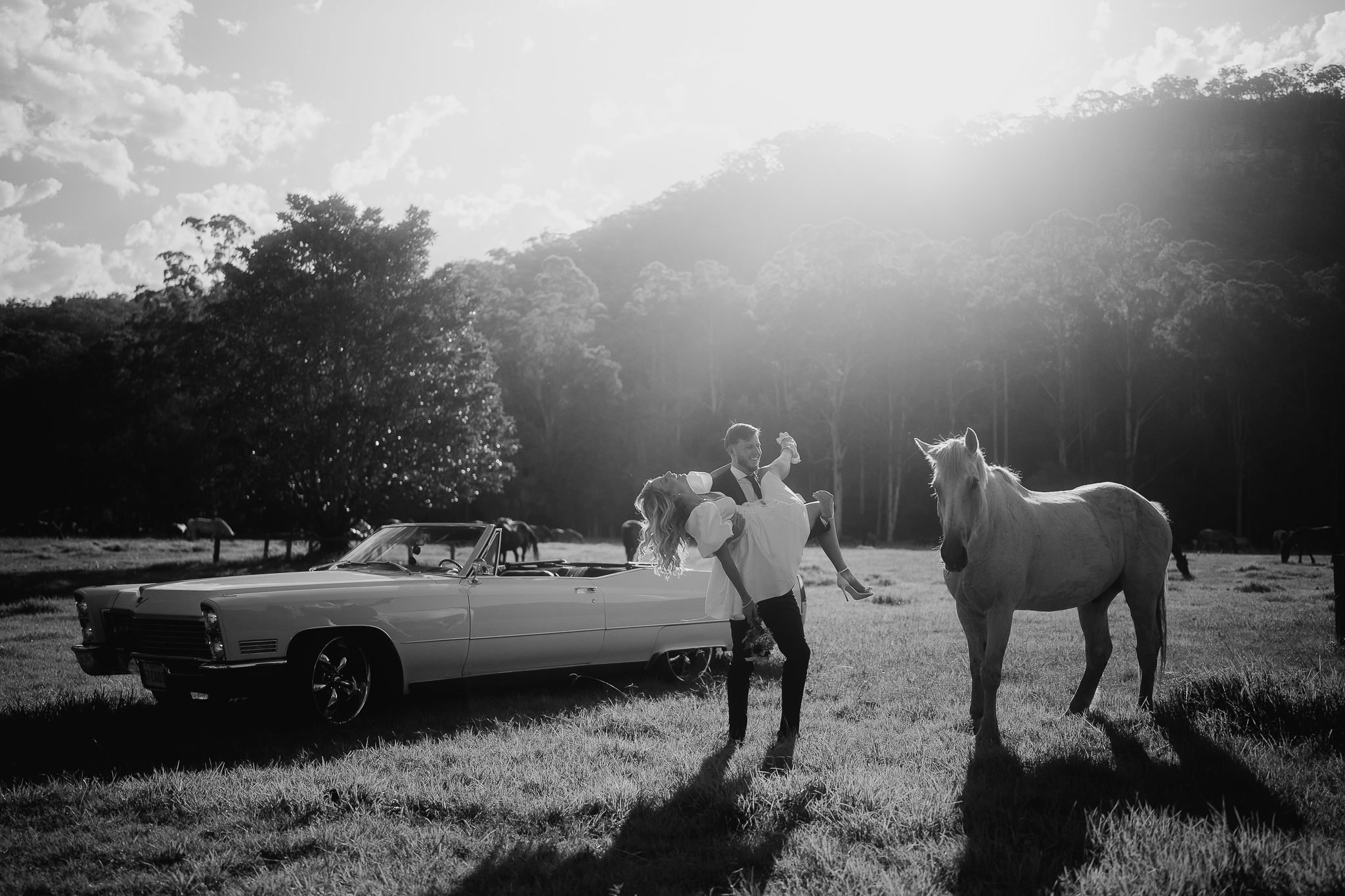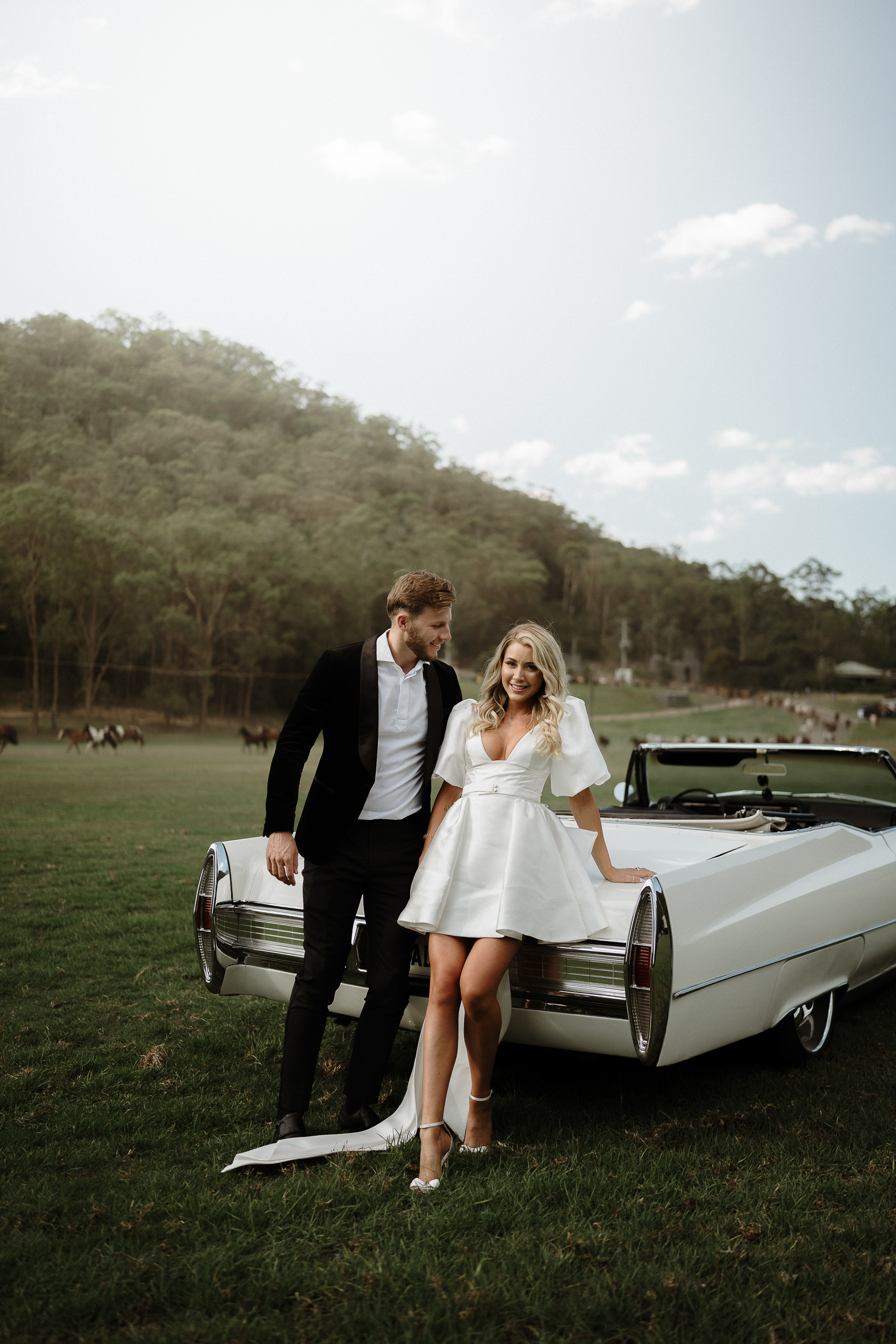 This beautiful photoshoot was done in the Glenworth valley weddings venue! If you are interested in shooting with horses and a beautiful landscape near Sydney, this is the place to be! All the things you see in this photoshoot, the car, dresses, suits, shoes, cake, champagne tower and the beautiful couple have all helped this shoot to achieve this beautiful look! I will post them all below as I highly recommend using these vendors! Car: @caddychicevents/ Bow dress: @kwhbridal/ Lace dresses: @grace_loves_lace/ Suits: @thdr_co/ Bridal shoes: @harloau/ Cake: @_sammiecakes