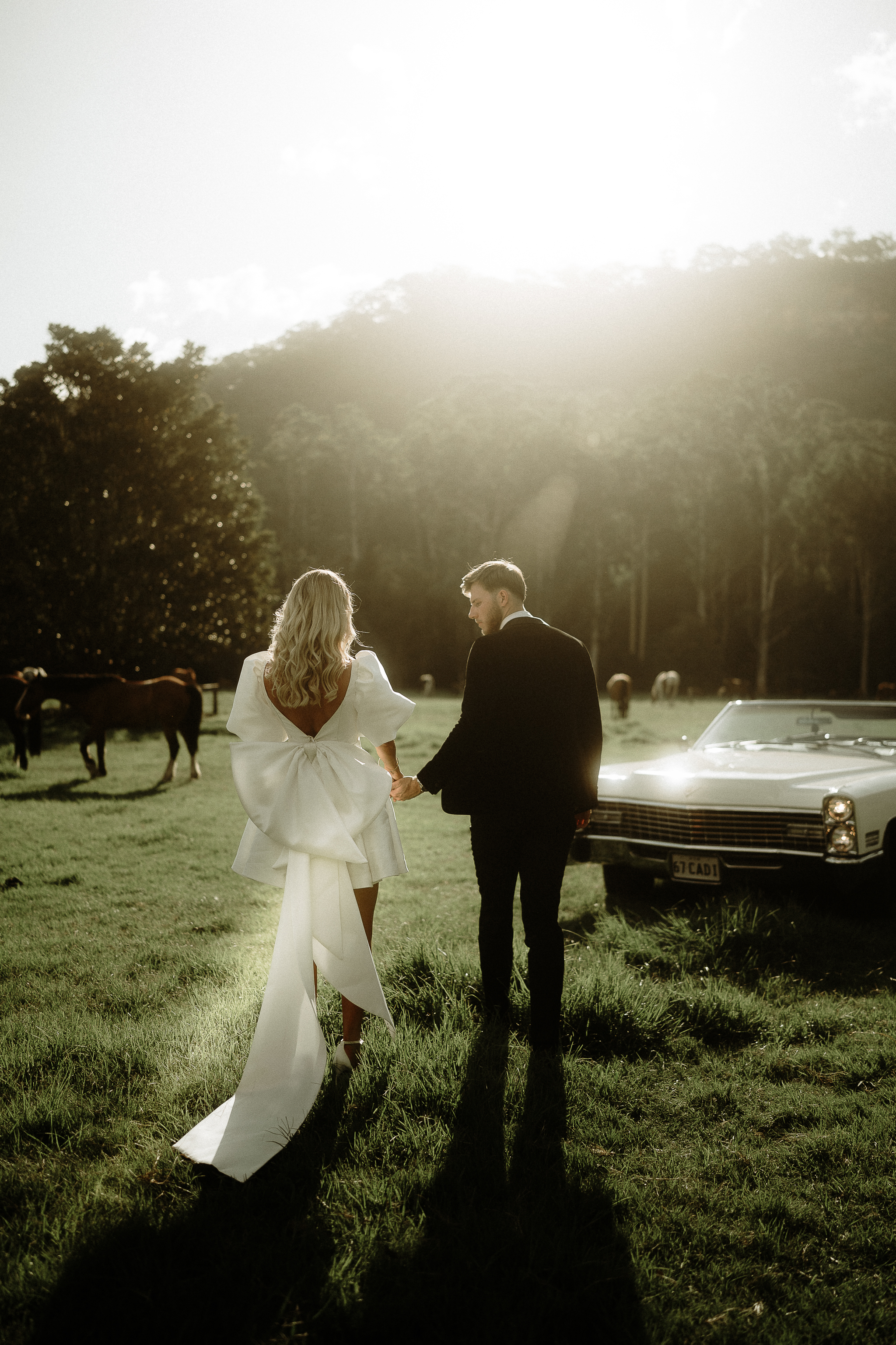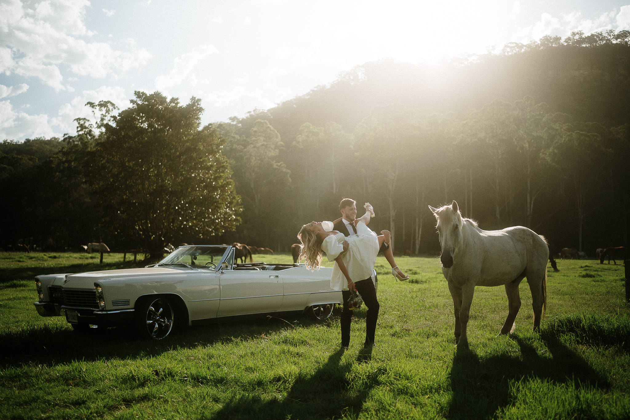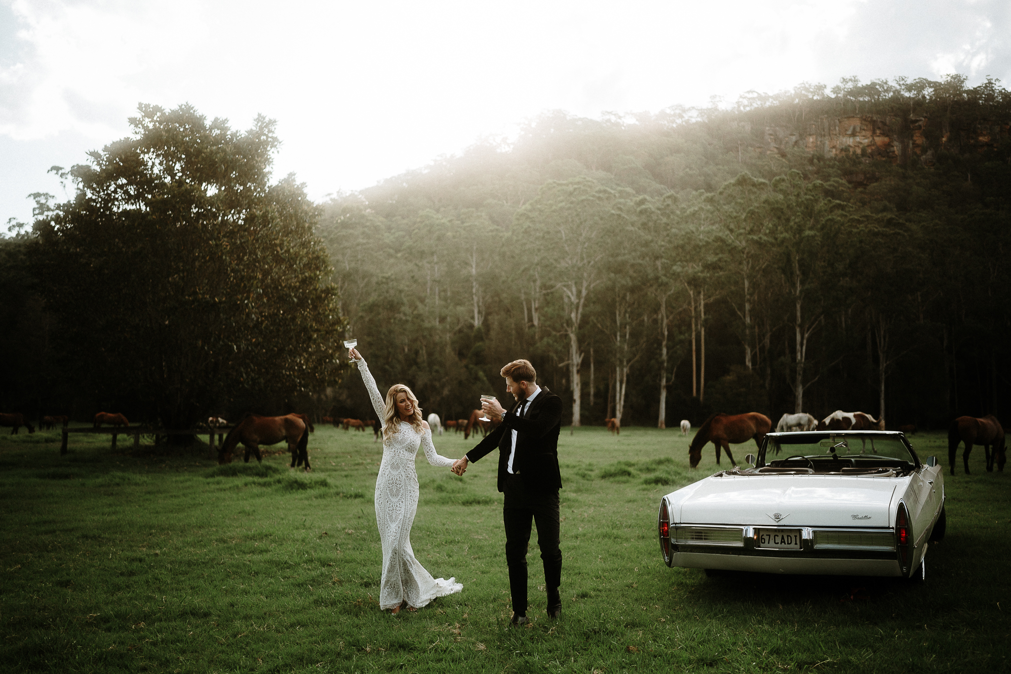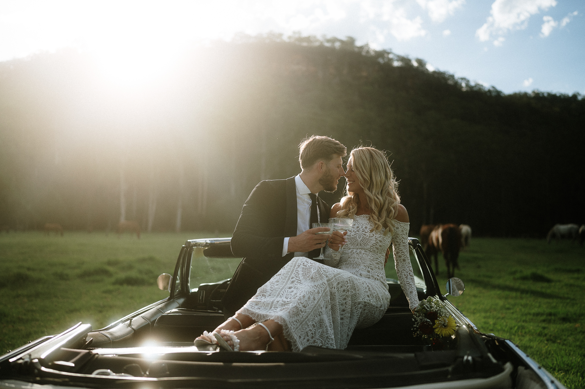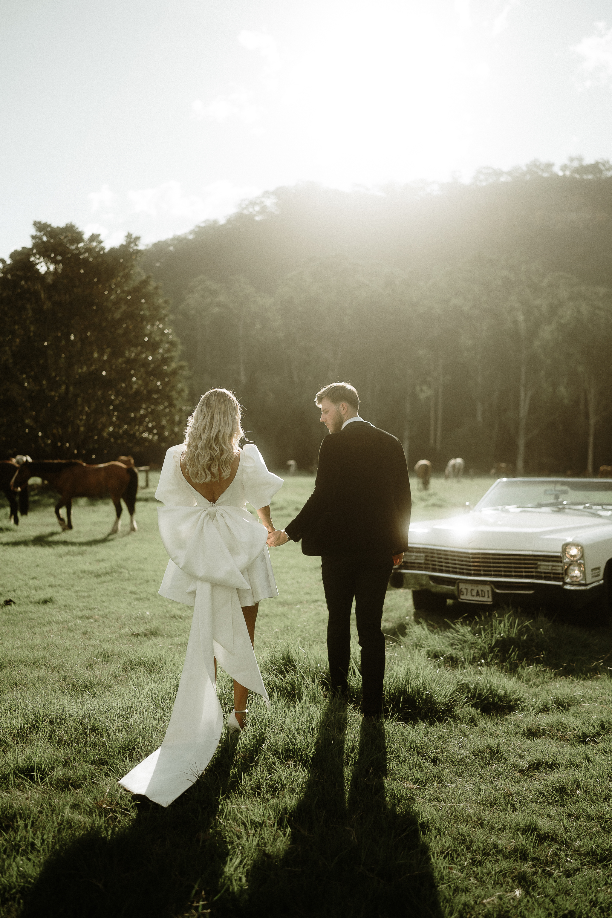 This beautiful photoshoot was done in the Glenworth valley weddings venue! If you are interested in shooting with horses and a beautiful landscape near Sydney, this is the place to be! All the things you see in this photoshoot, the car, dresses, suits, shoes, cake, champagne tower and the beautiful couple have all helped this shoot to achieve this beautiful look! I will post them all below as I highly recommend using these vendors! Car: @caddychicevents/ Bow dress: @kwhbridal/ Lace dresses: @grace_loves_lace/ Suits: @thdr_co/ Bridal shoes: @harloau/ Cake: @_sammiecakes