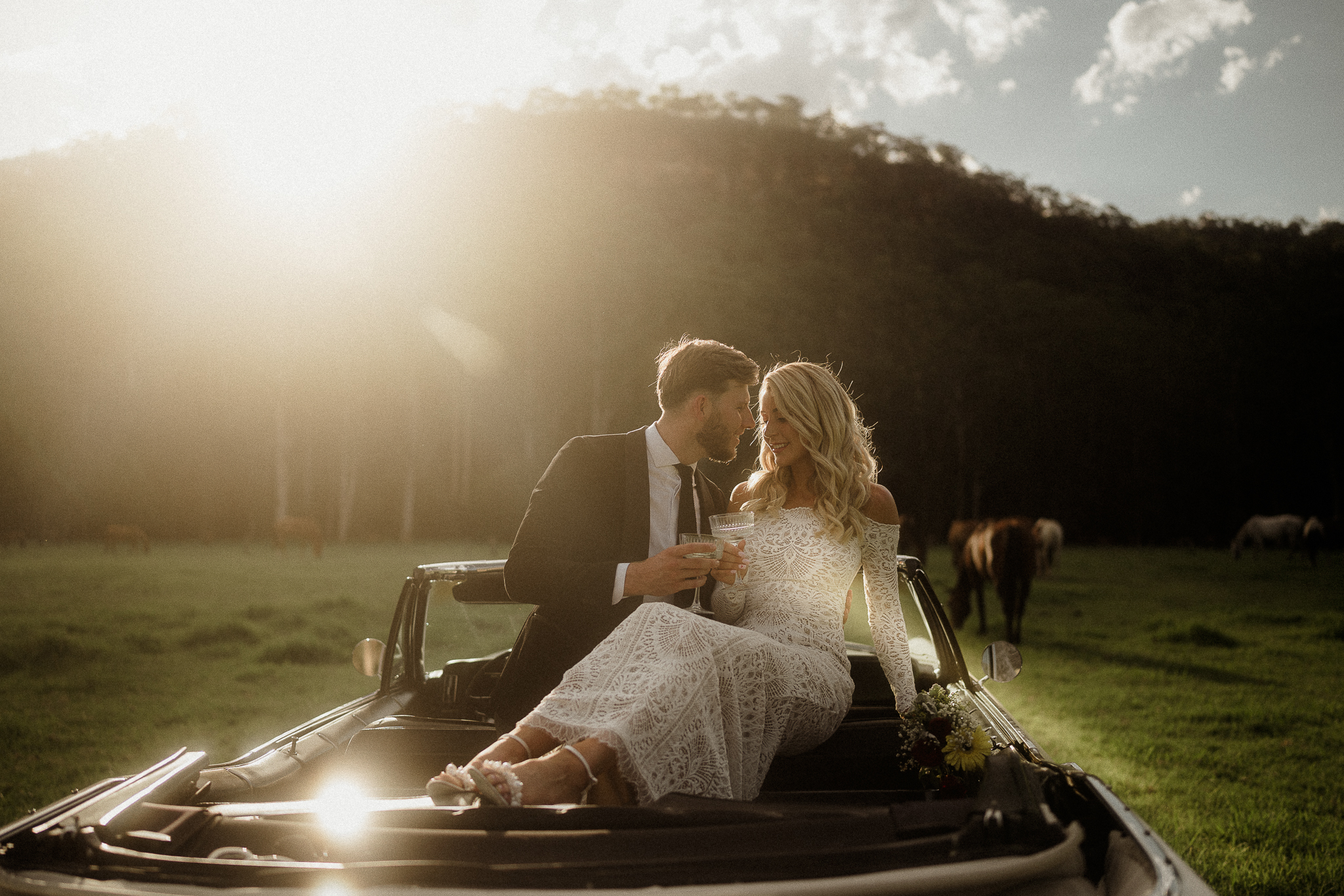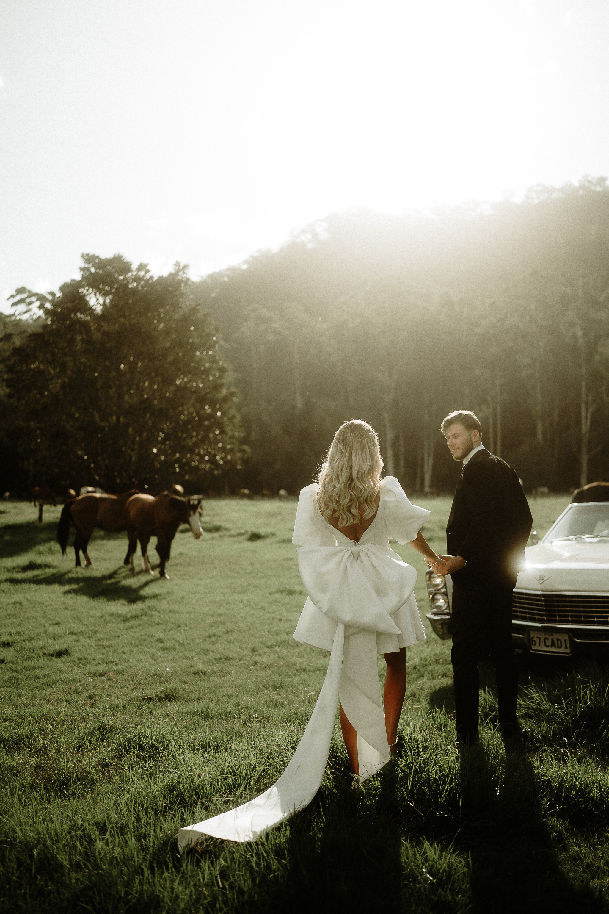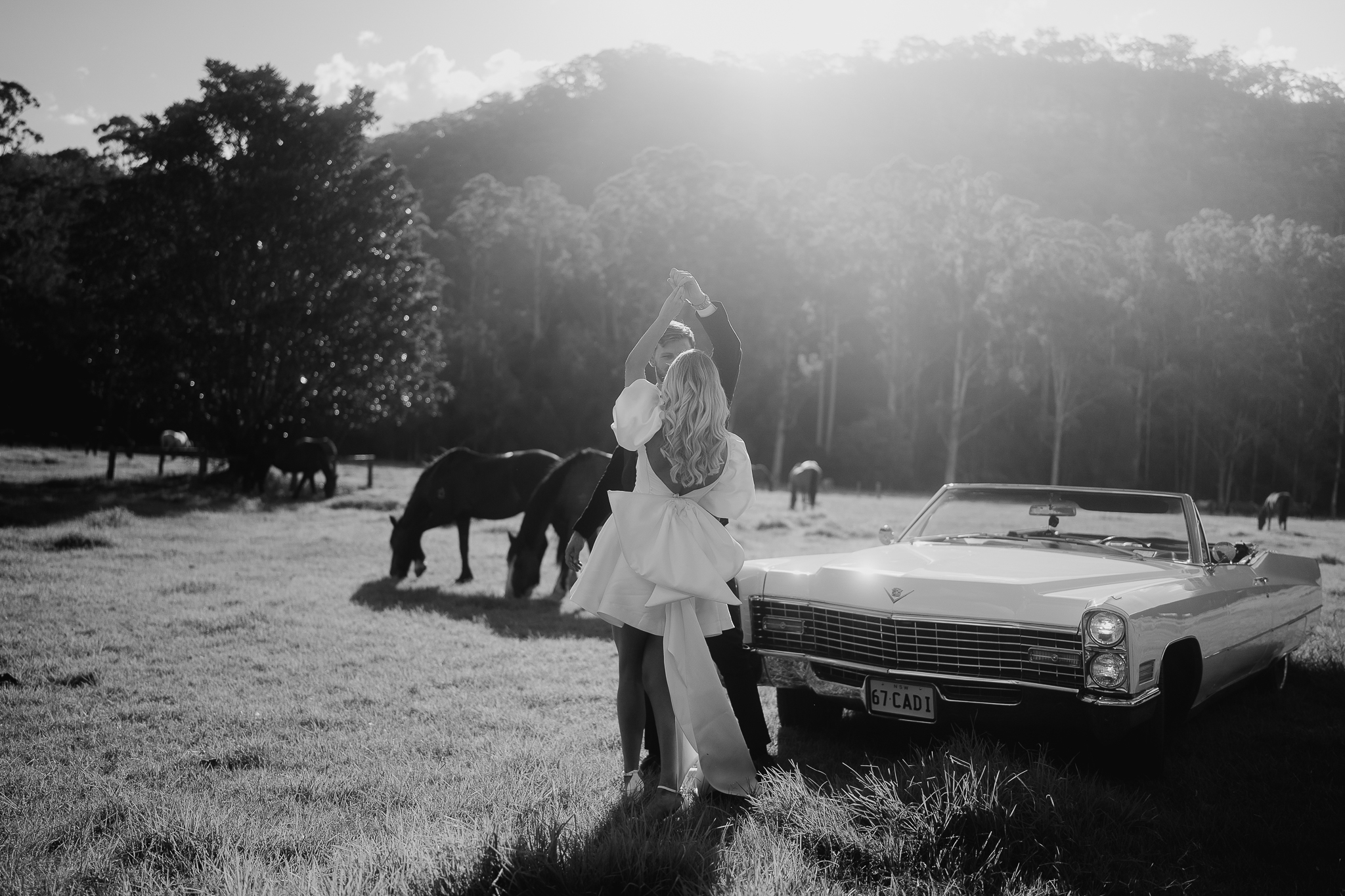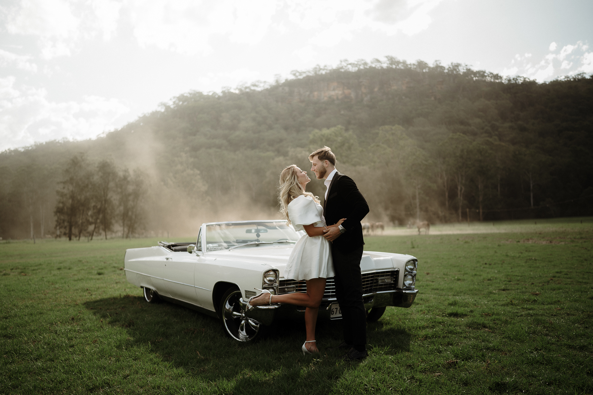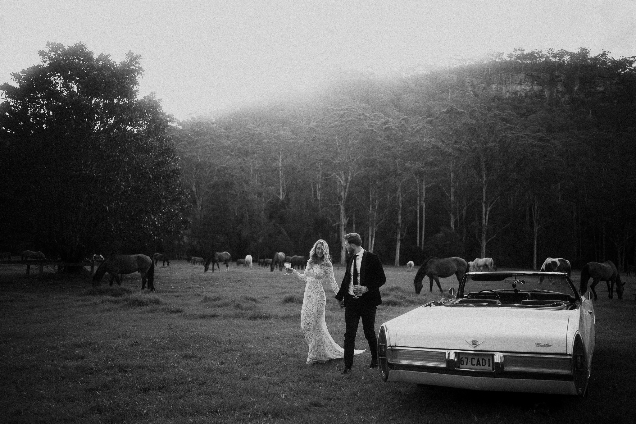 This beautiful photoshoot was done in the Glenworth valley weddings venue! If you are interested in shooting with horses and a beautiful landscape near Sydney, this is the place to be! All the things you see in this photoshoot, the car, dresses, suits, shoes, cake, champagne tower and the beautiful couple have all helped this shoot to achieve this beautiful look! I will post them all below as I highly recommend using these vendors! Car: @caddychicevents/ Bow dress: @kwhbridal/ Lace dresses: @grace_loves_lace/ Suits: @thdr_co/ Bridal shoes: @harloau/ Cake: @_sammiecakes