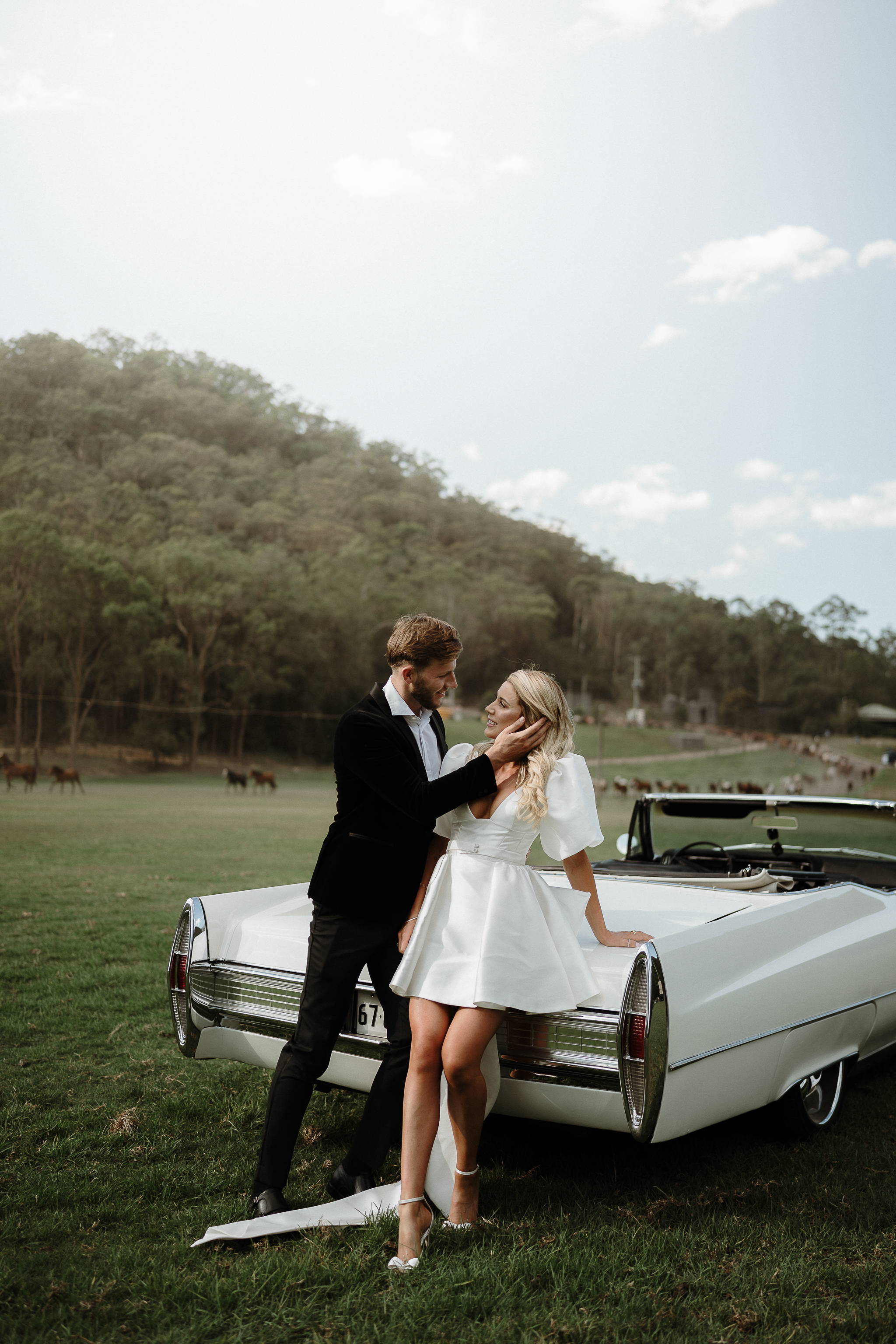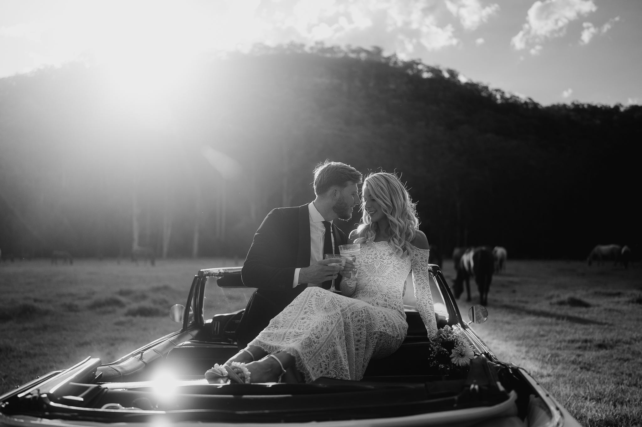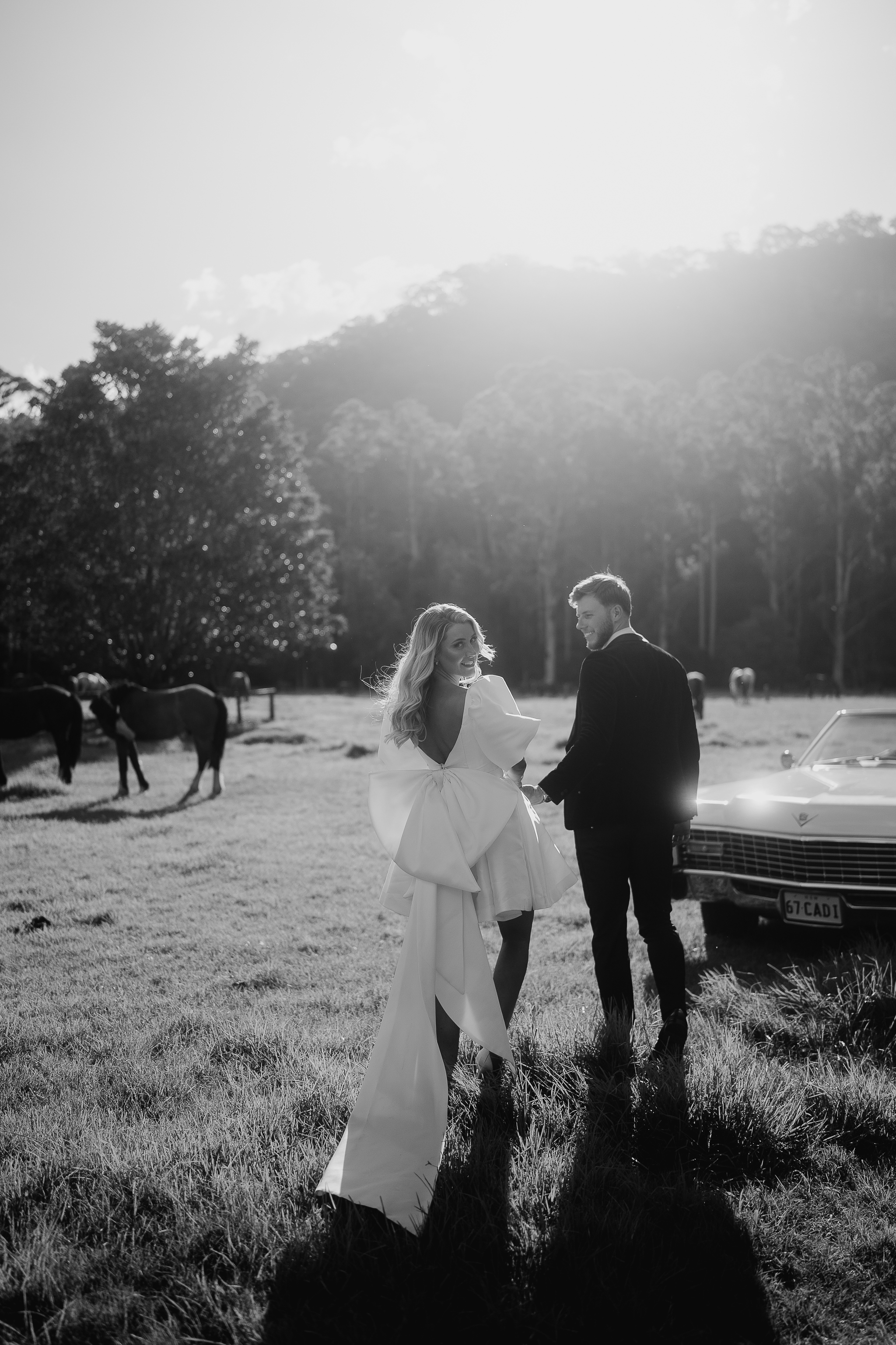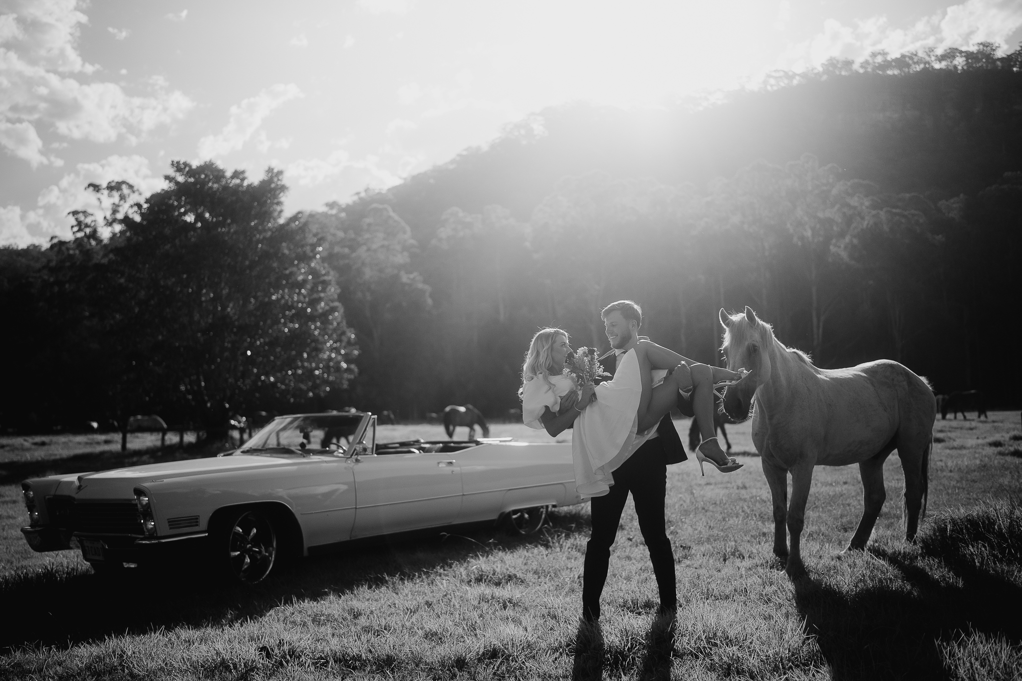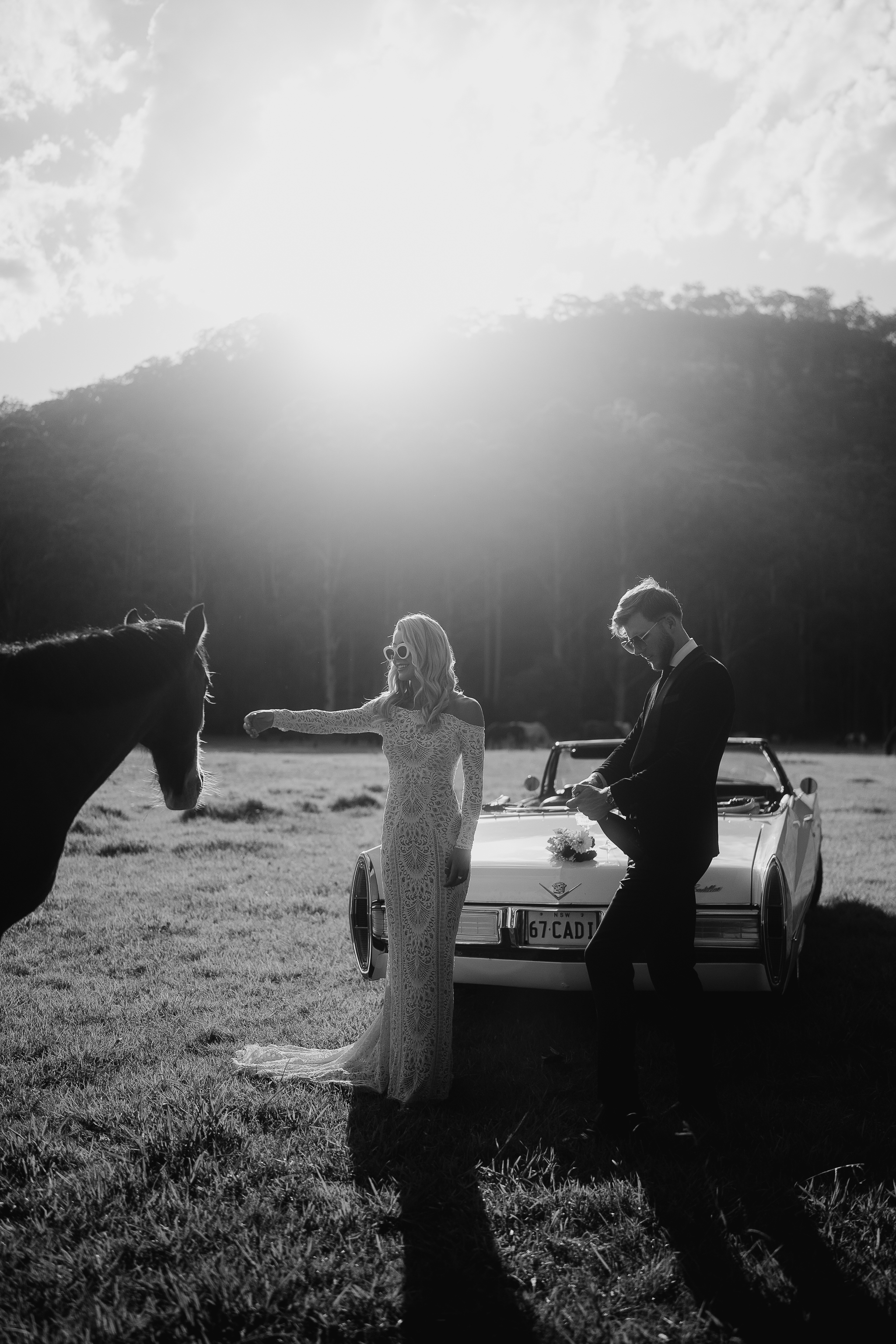 This beautiful photoshoot was done in the Glenworth valley weddings venue! If you are interested in shooting with horses and a beautiful landscape near Sydney, this is the place to be! All the things you see in this photoshoot, the car, dresses, suits, shoes, cake, champagne tower and the beautiful couple have all helped this shoot to achieve this beautiful look! I will post them all below as I highly recommend using these vendors! Car: @caddychicevents/ Bow dress: @kwhbridal/ Lace dresses: @grace_loves_lace/ Suits: @thdr_co/ Bridal shoes: @harloau/ Cake: @_sammiecakes