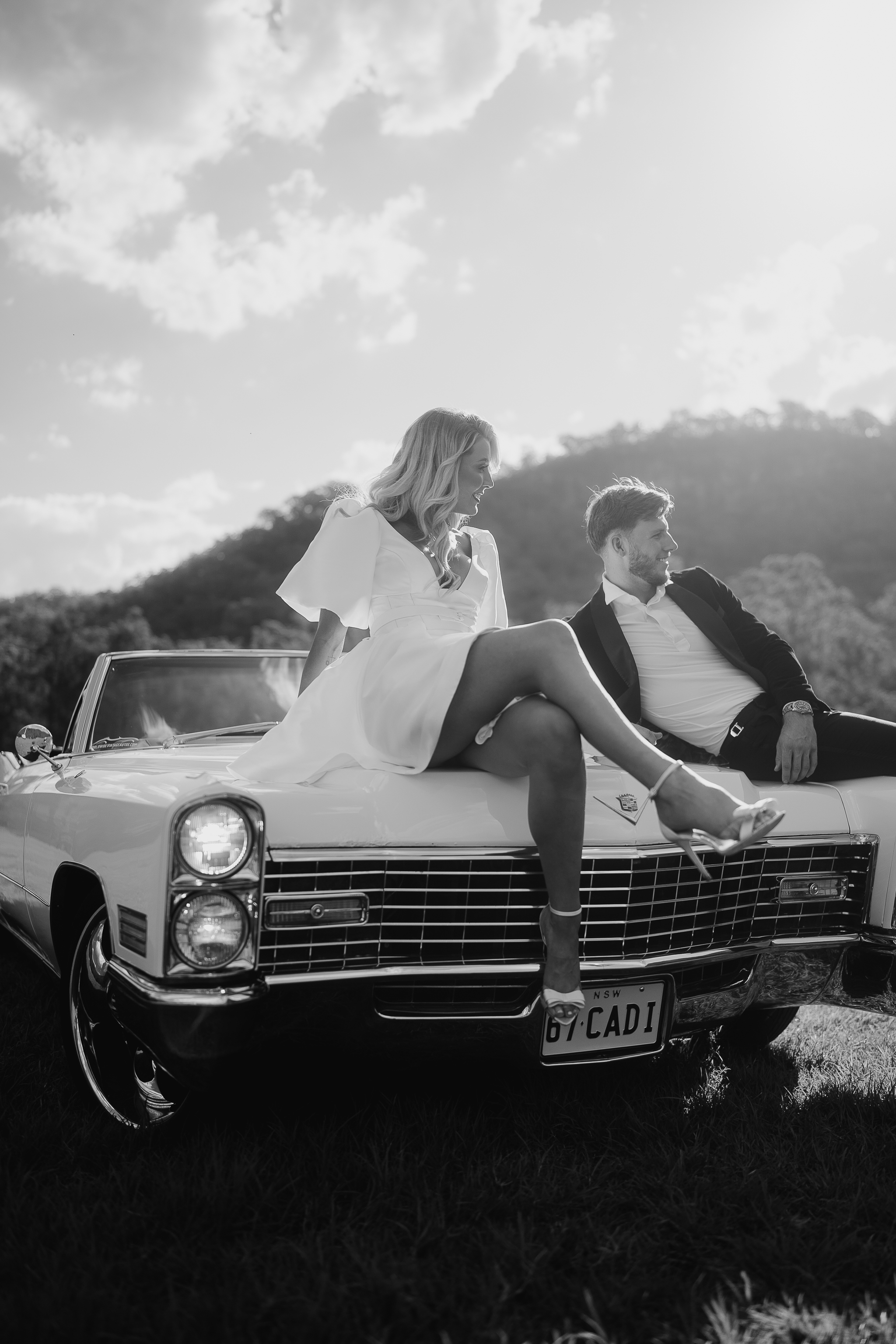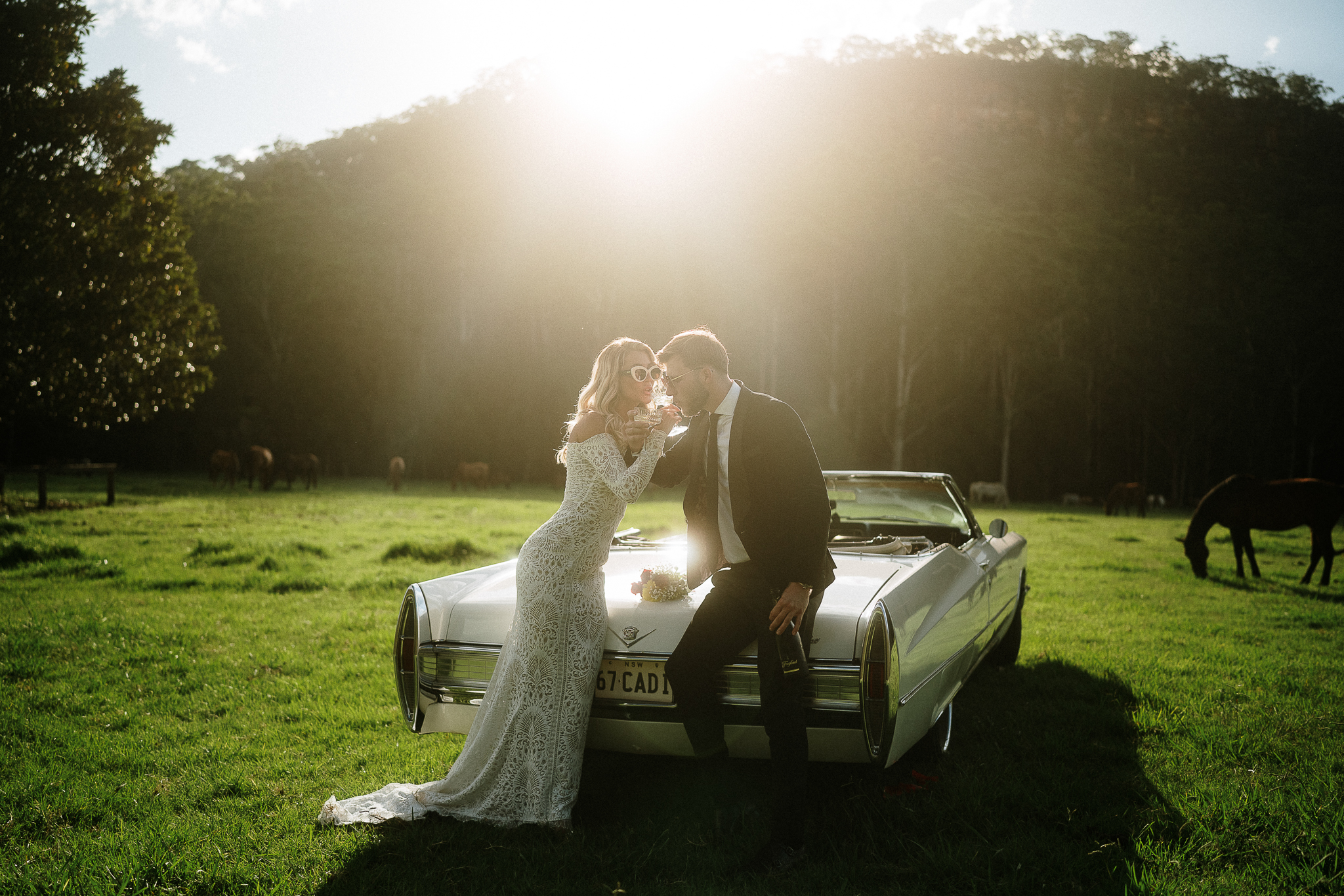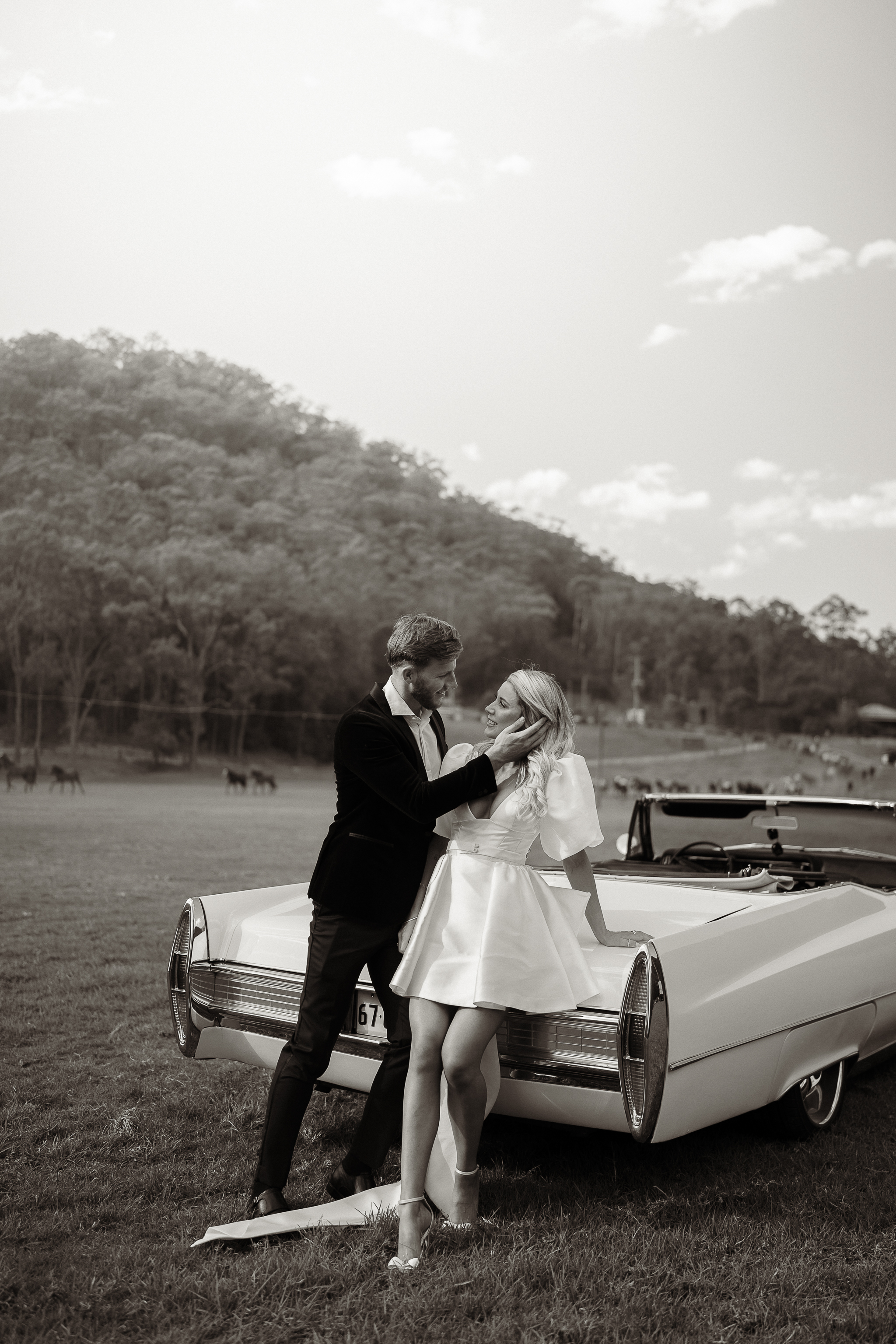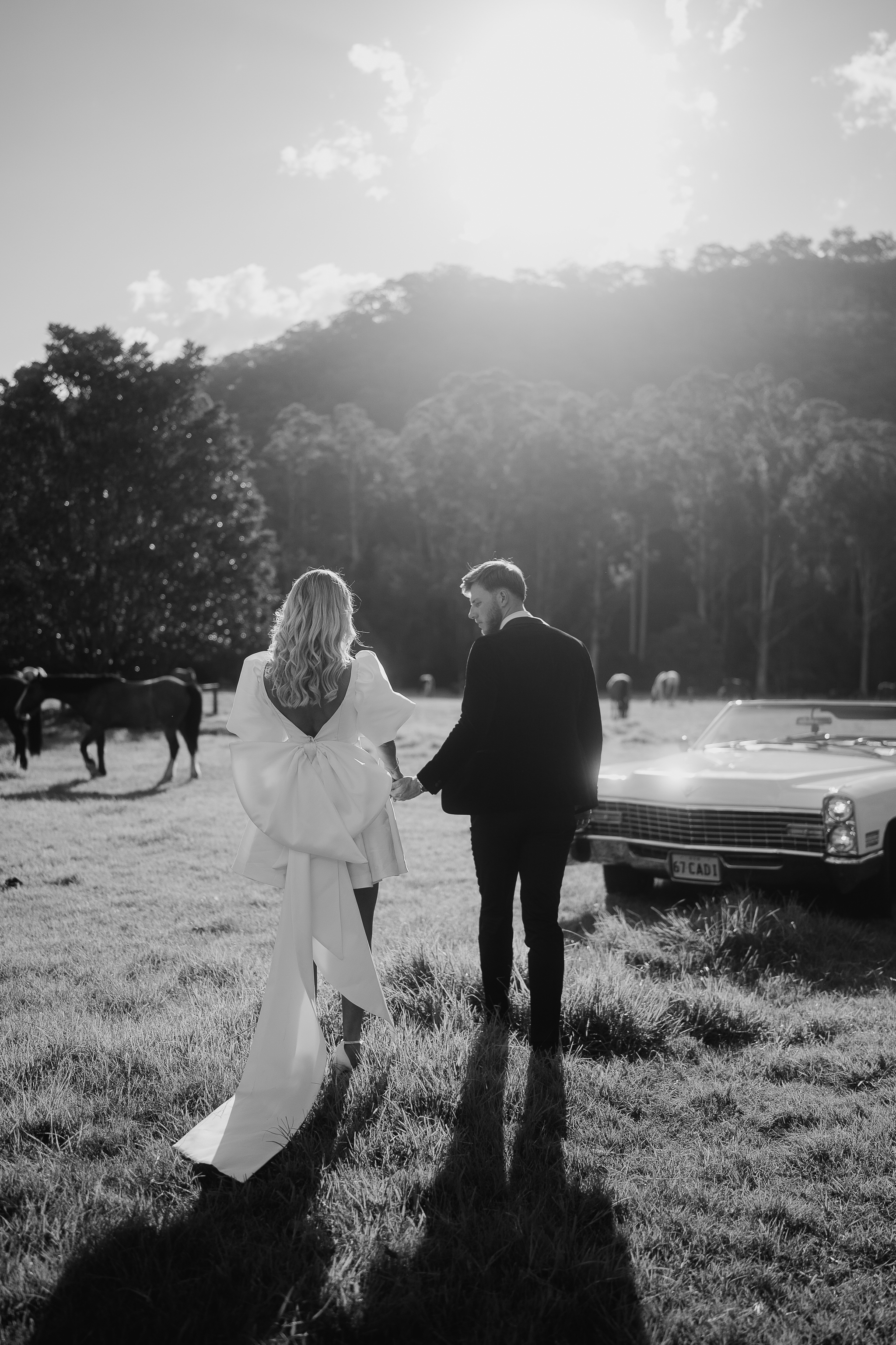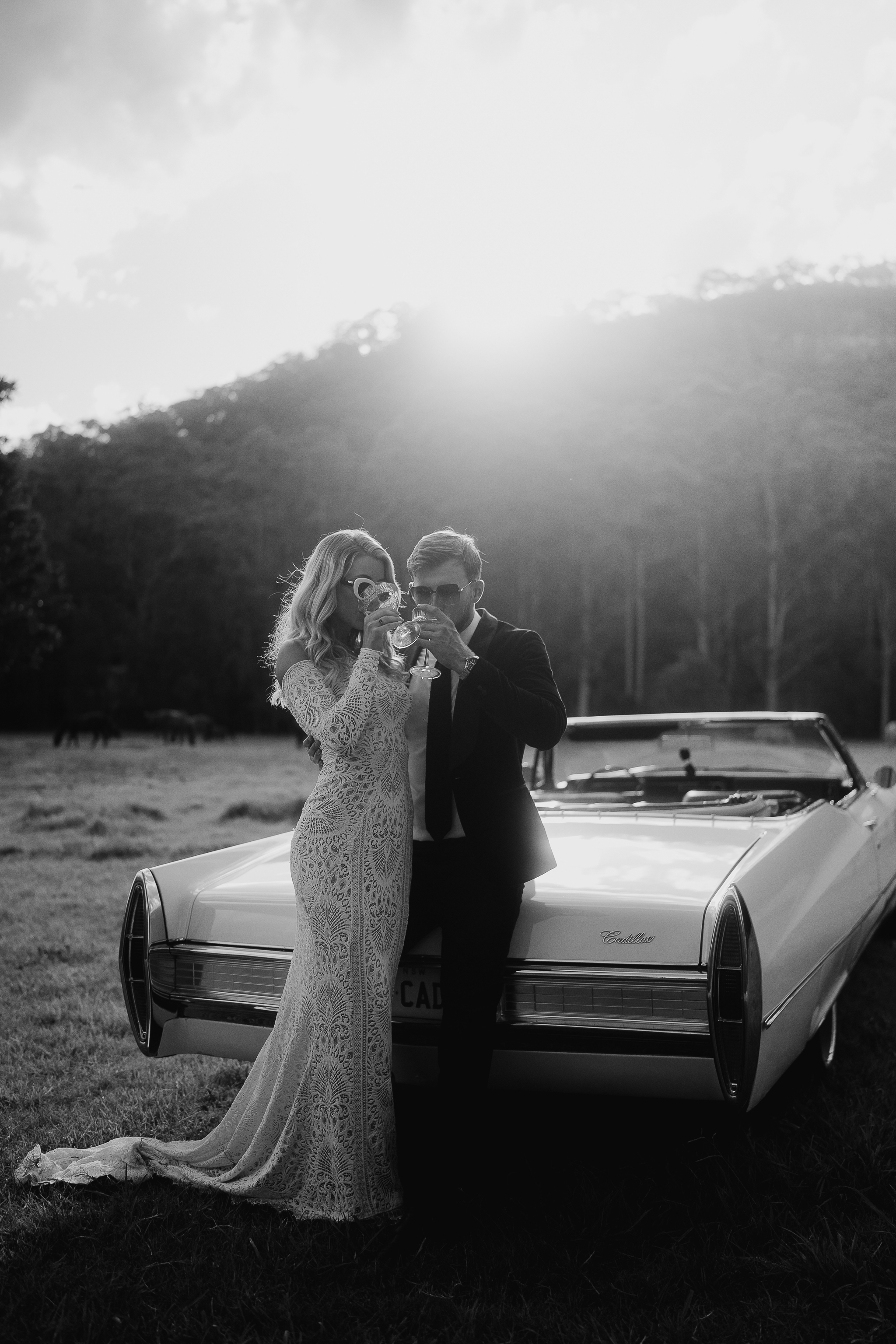 This beautiful photoshoot was done in the Glenworth valley weddings venue! If you are interested in shooting with horses and a beautiful landscape near Sydney, this is the place to be! All the things you see in this photoshoot, the car, dresses, suits, shoes, cake, champagne tower and the beautiful couple have all helped this shoot to achieve this beautiful look! I will post them all below as I highly recommend using these vendors! Car: @caddychicevents/ Bow dress: @kwhbridal/ Lace dresses: @grace_loves_lace/ Suits: @thdr_co/ Bridal shoes: @harloau/ Cake: @_sammiecakes