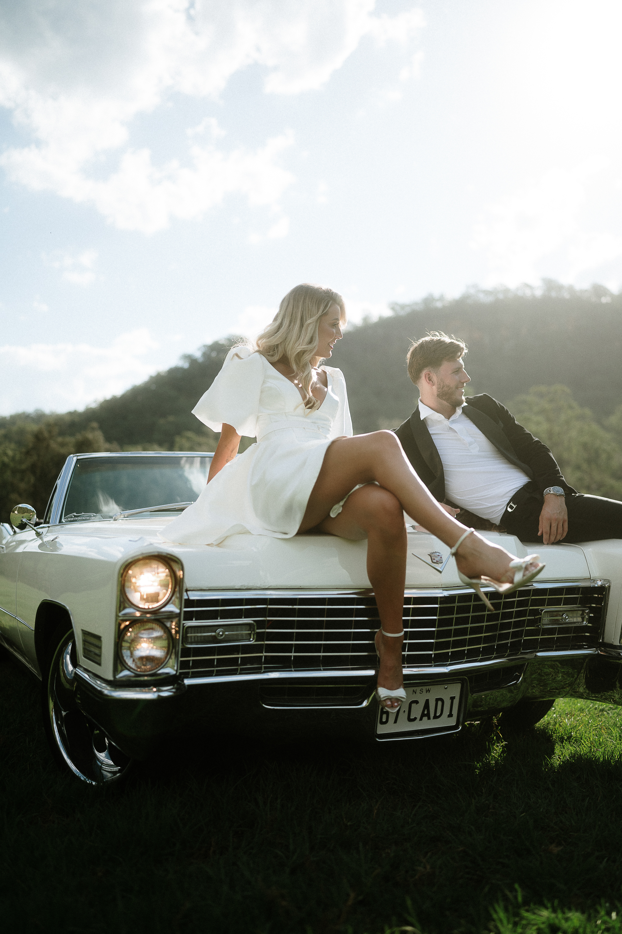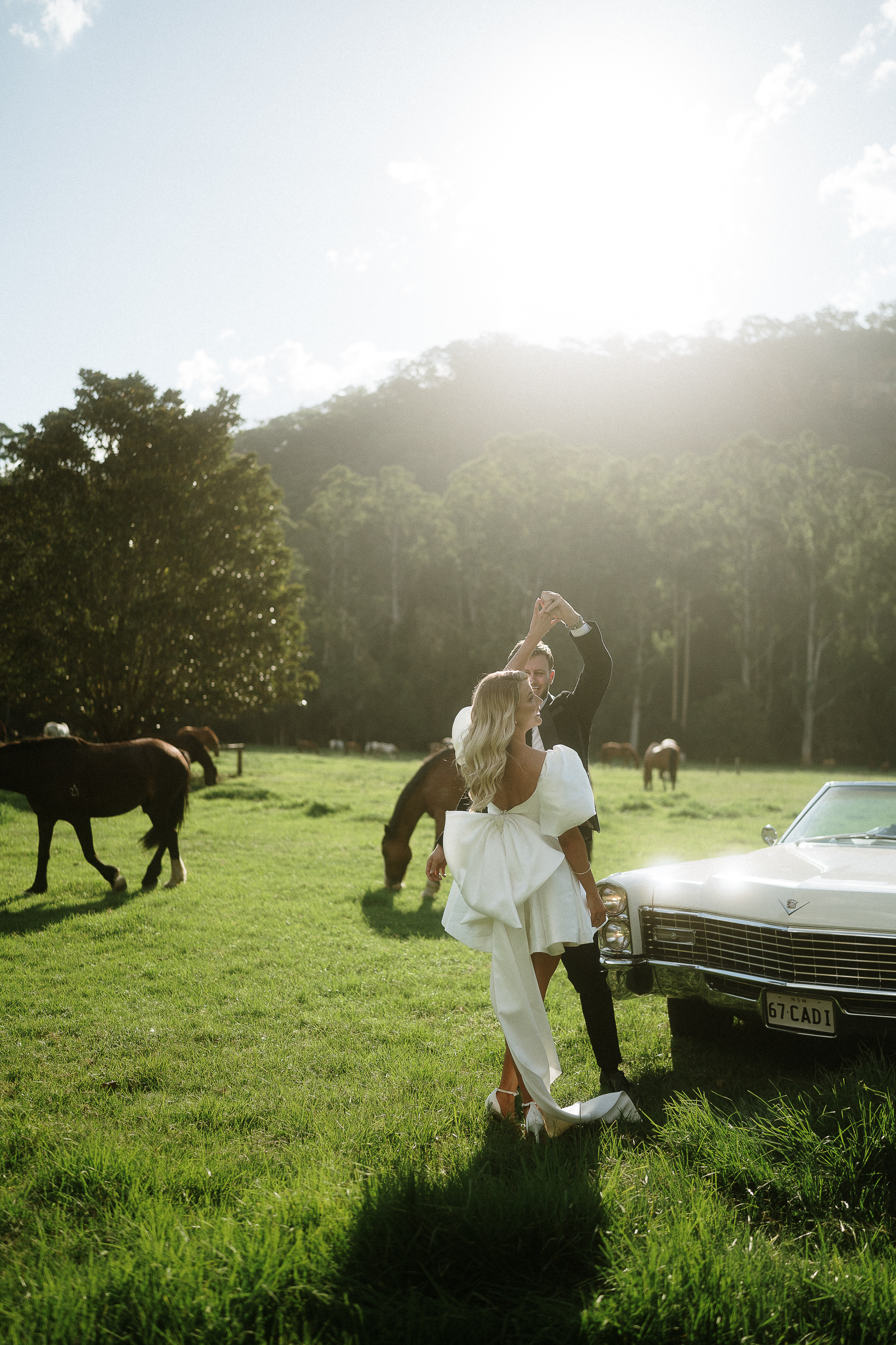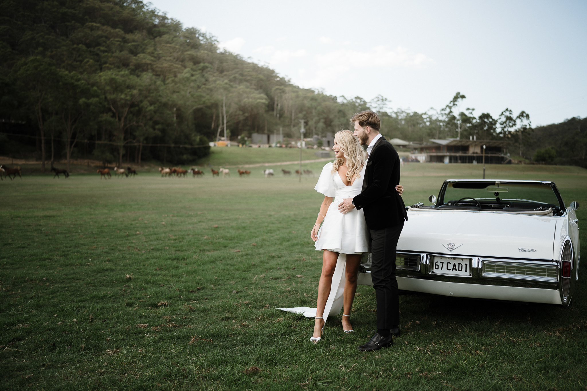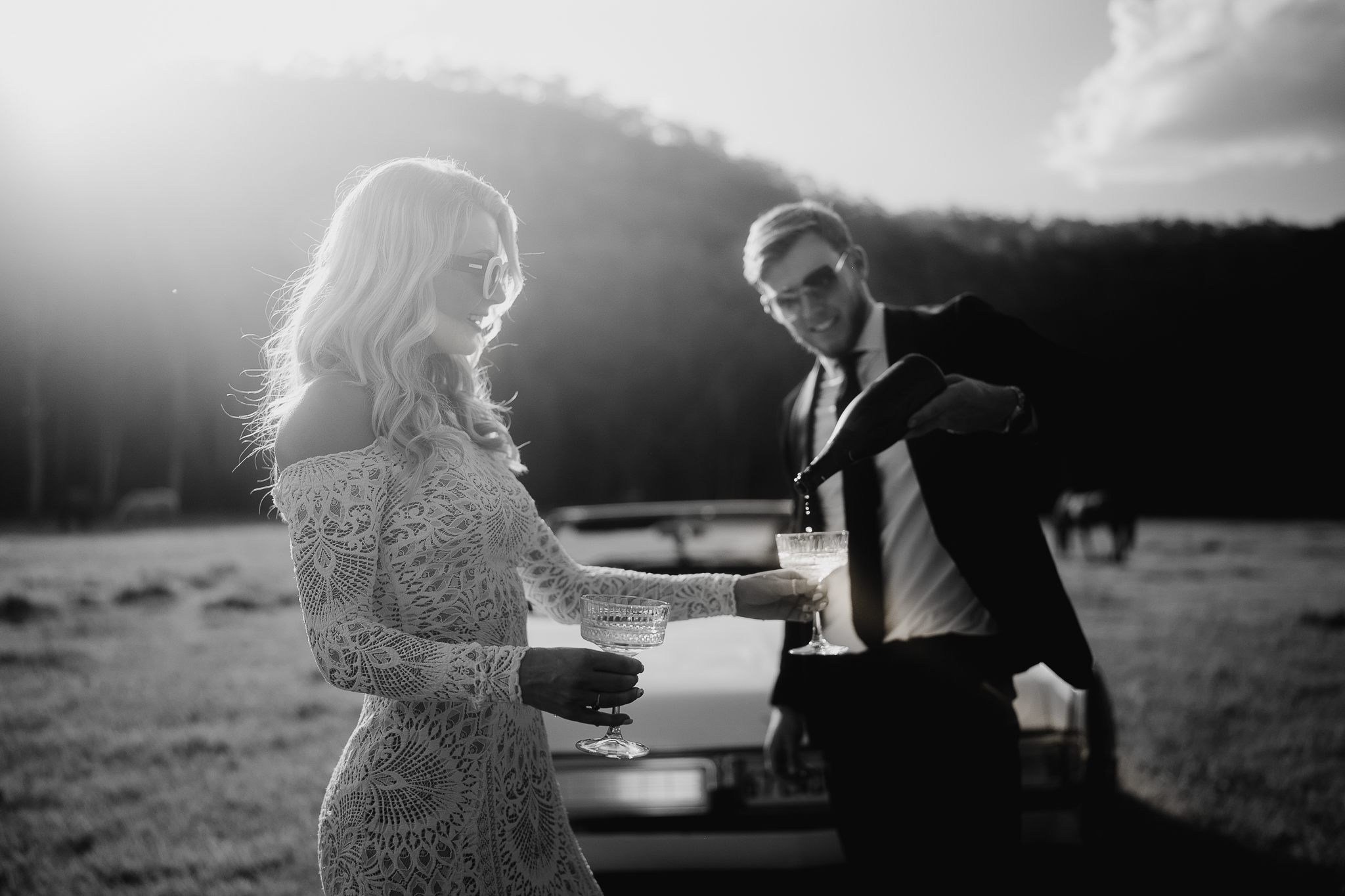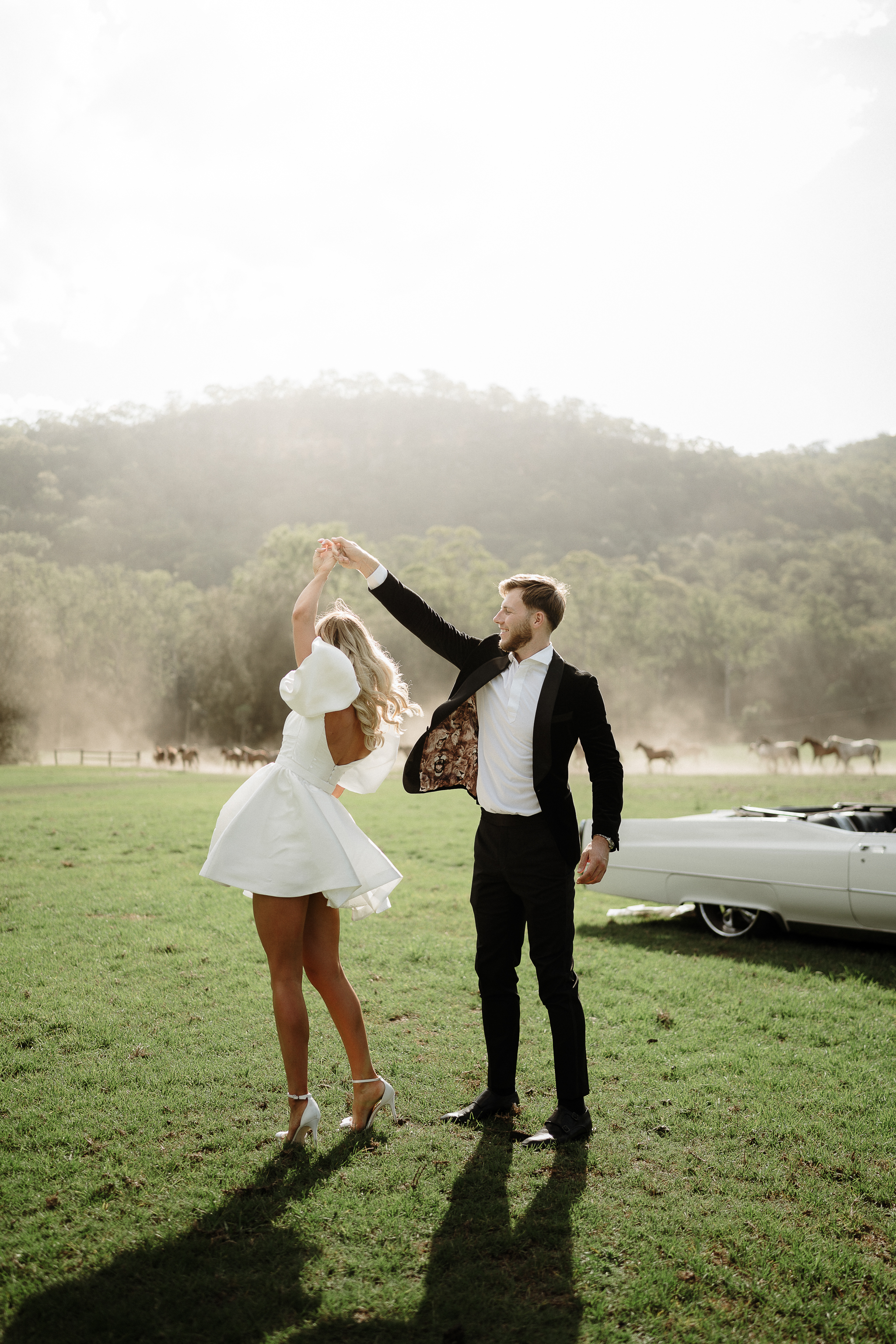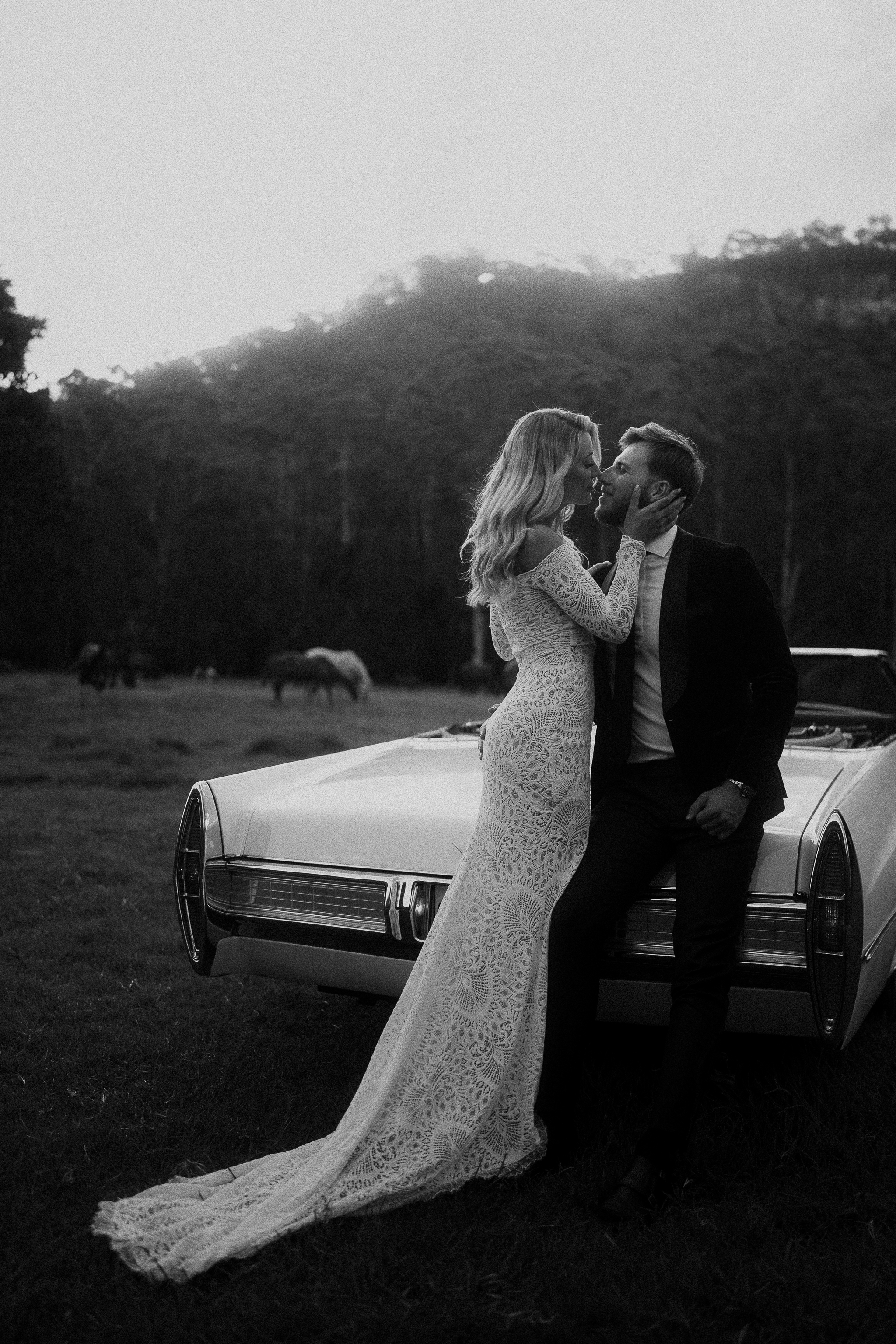 This beautiful photoshoot was done in the Glenworth valley weddings venue! If you are interested in shooting with horses and a beautiful landscape near Sydney, this is the place to be! All the things you see in this photoshoot, the car, dresses, suits, shoes, cake, champagne tower and the beautiful couple have all helped this shoot to achieve this beautiful look! I will post them all below as I highly recommend using these vendors! Car: @caddychicevents/ Bow dress: @kwhbridal/ Lace dresses: @grace_loves_lace/ Suits: @thdr_co/ Bridal shoes: @harloau/ Cake: @_sammiecakes