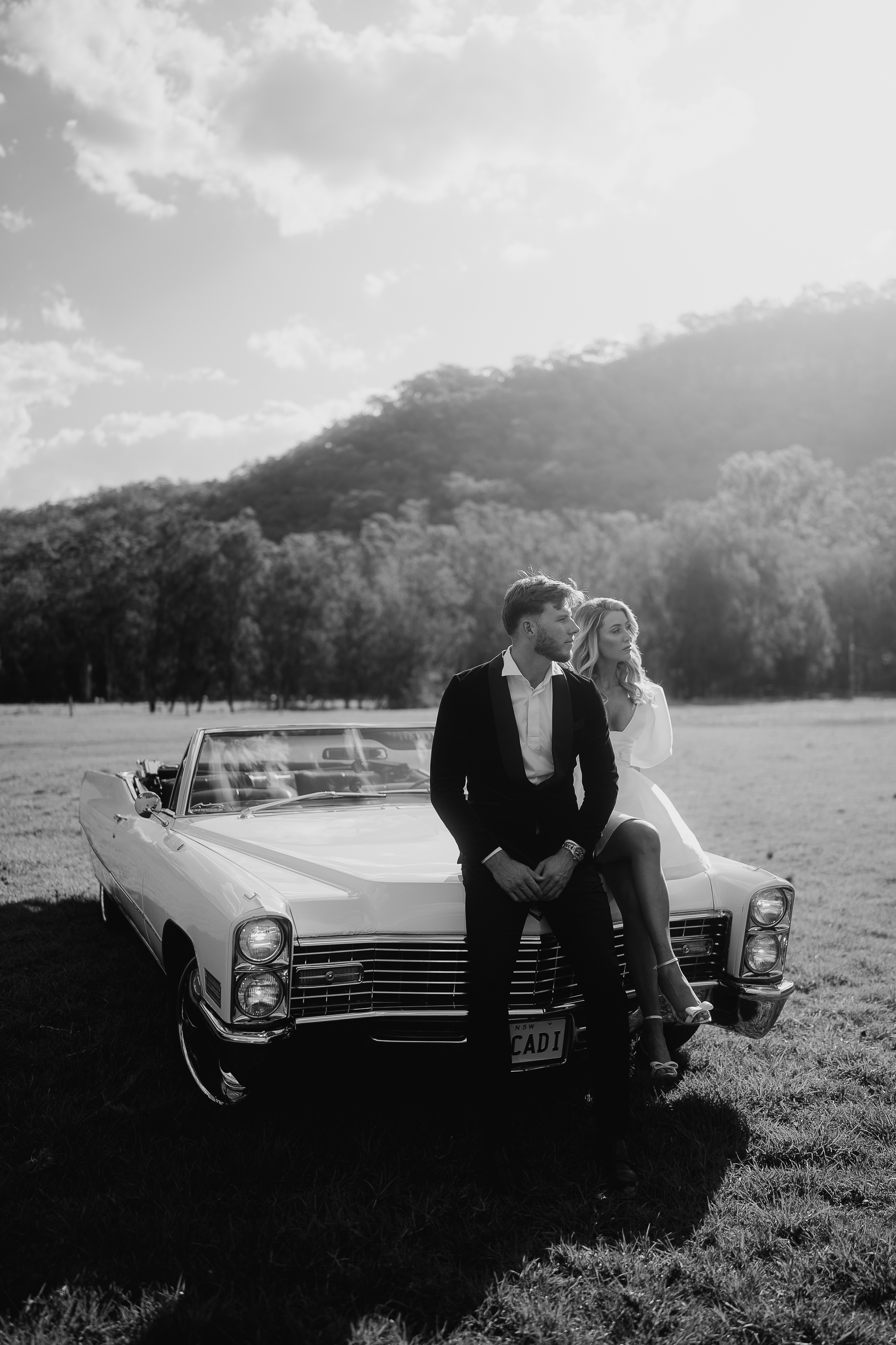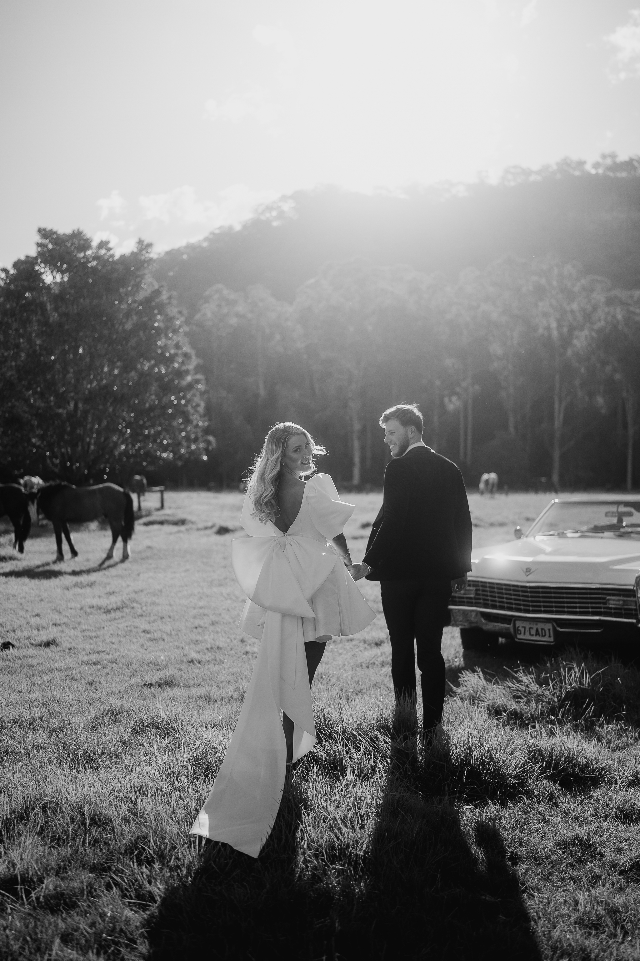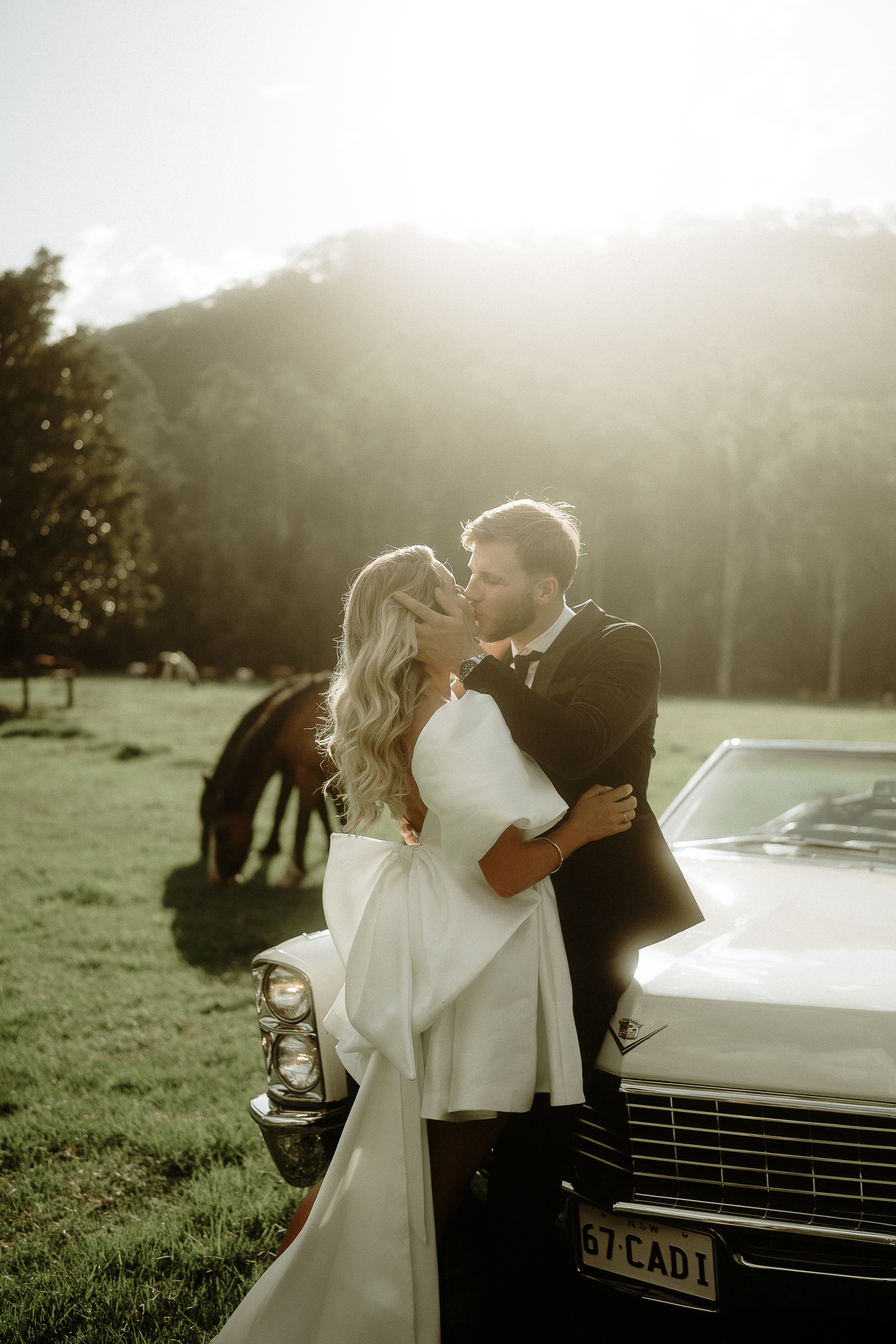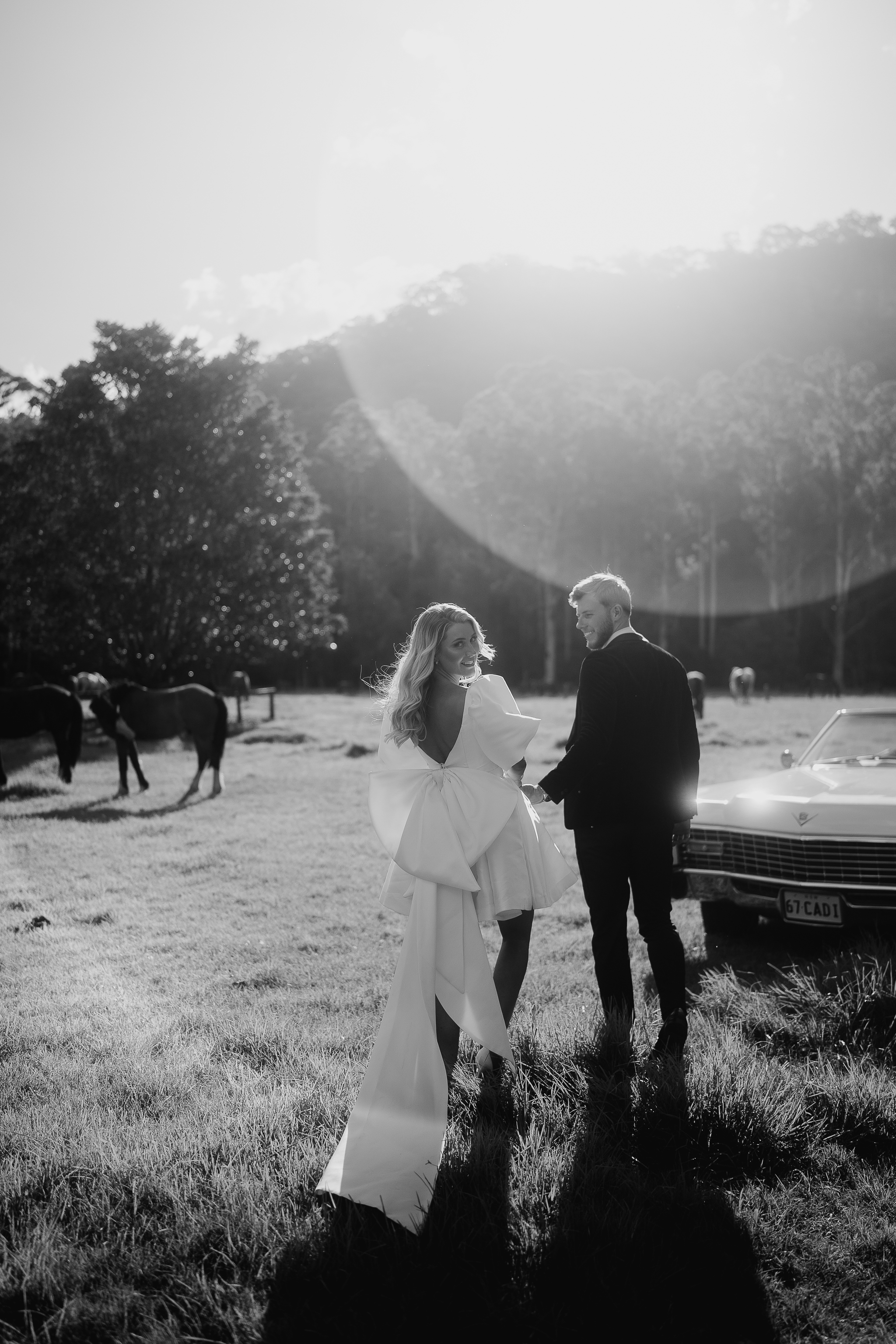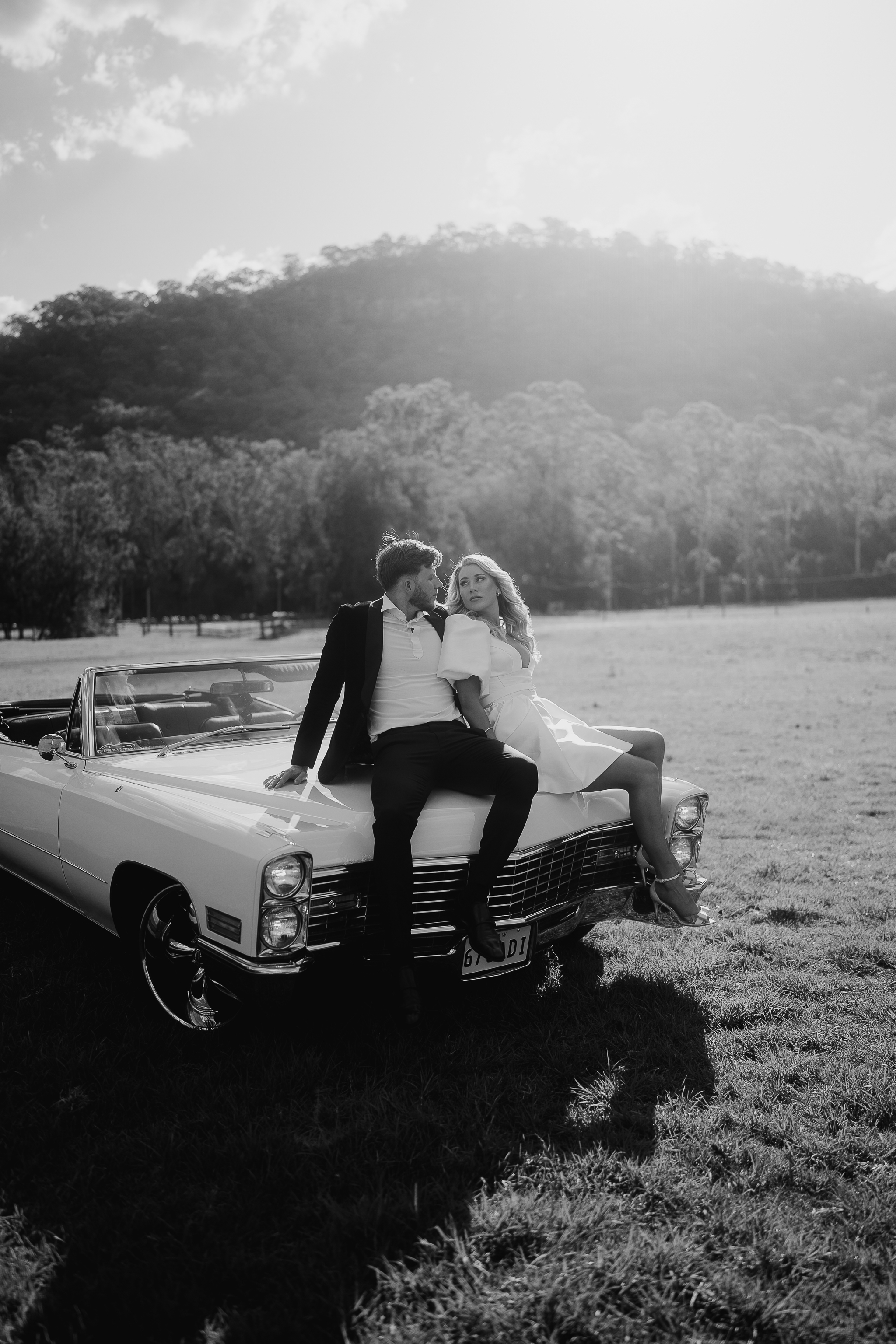 This beautiful photoshoot was done in the Glenworth valley weddings venue! If you are interested in shooting with horses and a beautiful landscape near Sydney, this is the place to be! All the things you see in this photoshoot, the car, dresses, suits, shoes, cake, champagne tower and the beautiful couple have all helped this shoot to achieve this beautiful look! I will post them all below as I highly recommend using these vendors! Car: @caddychicevents/ Bow dress: @kwhbridal/ Lace dresses: @grace_loves_lace/ Suits: @thdr_co/ Bridal shoes: @harloau/ Cake: @_sammiecakes