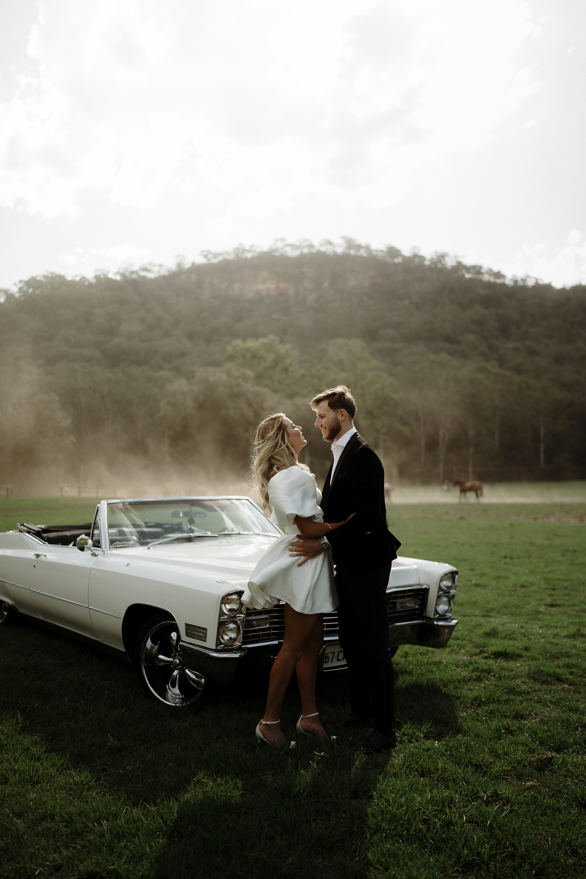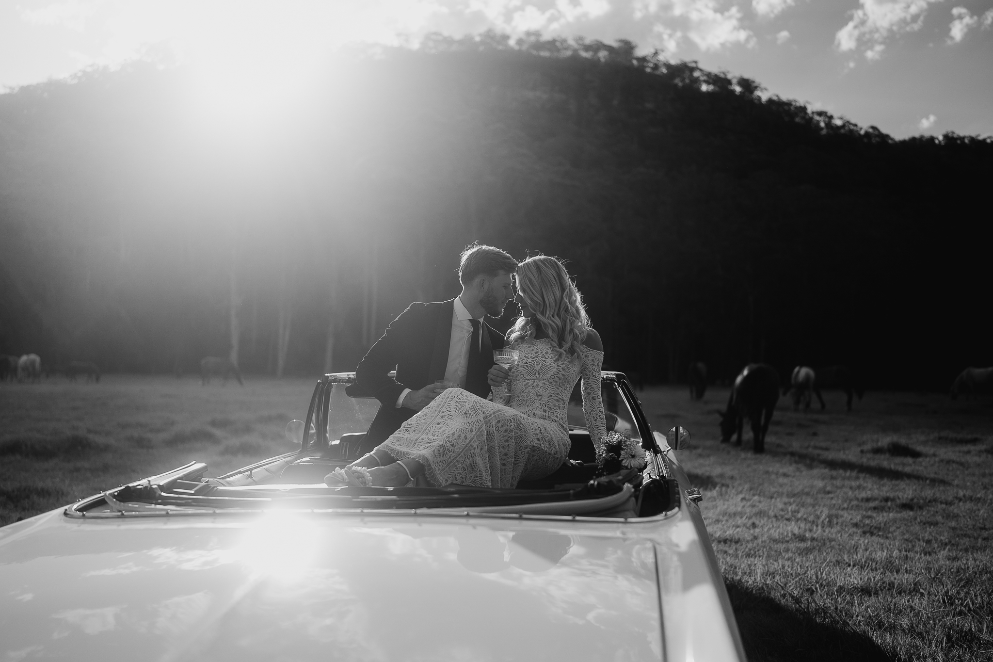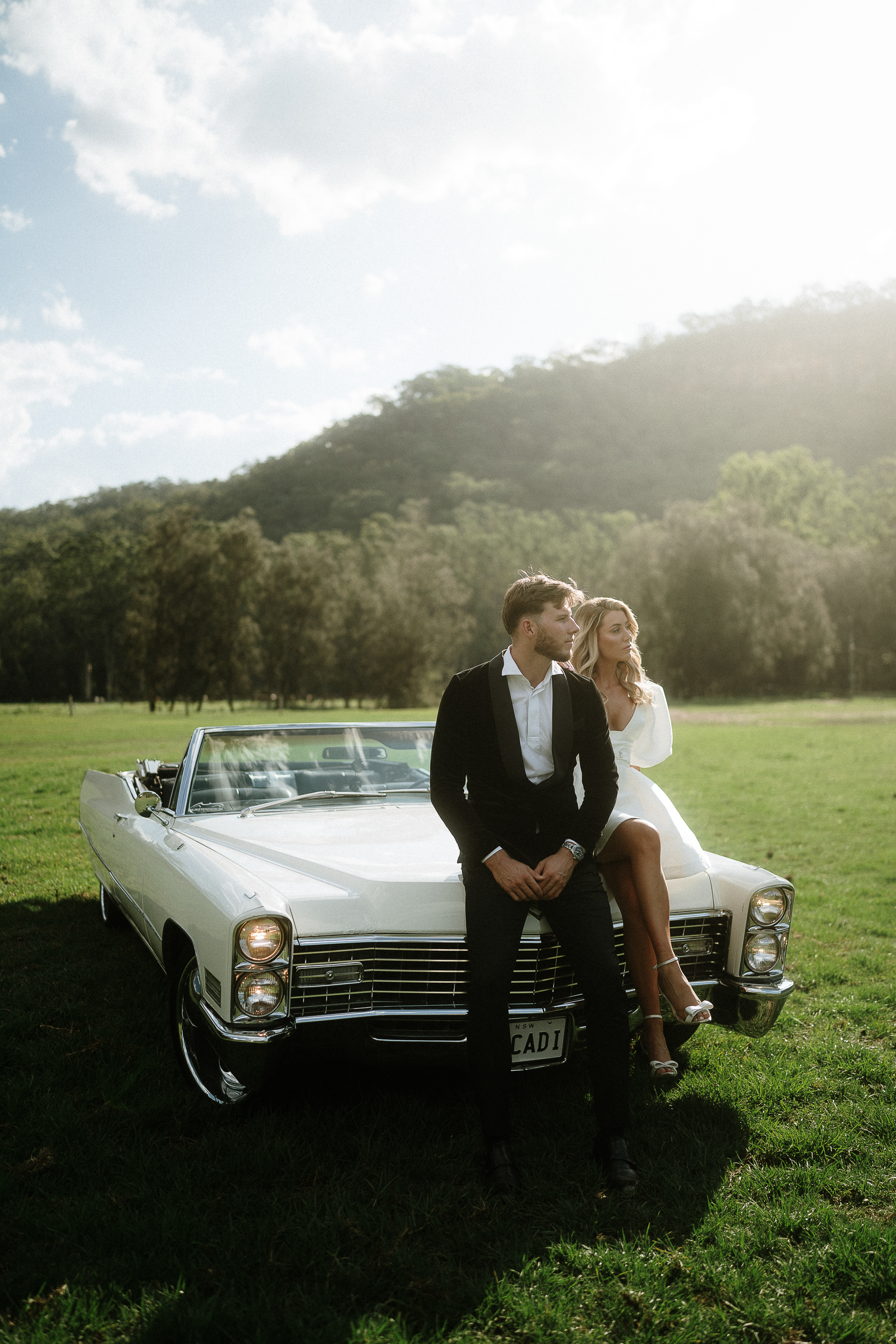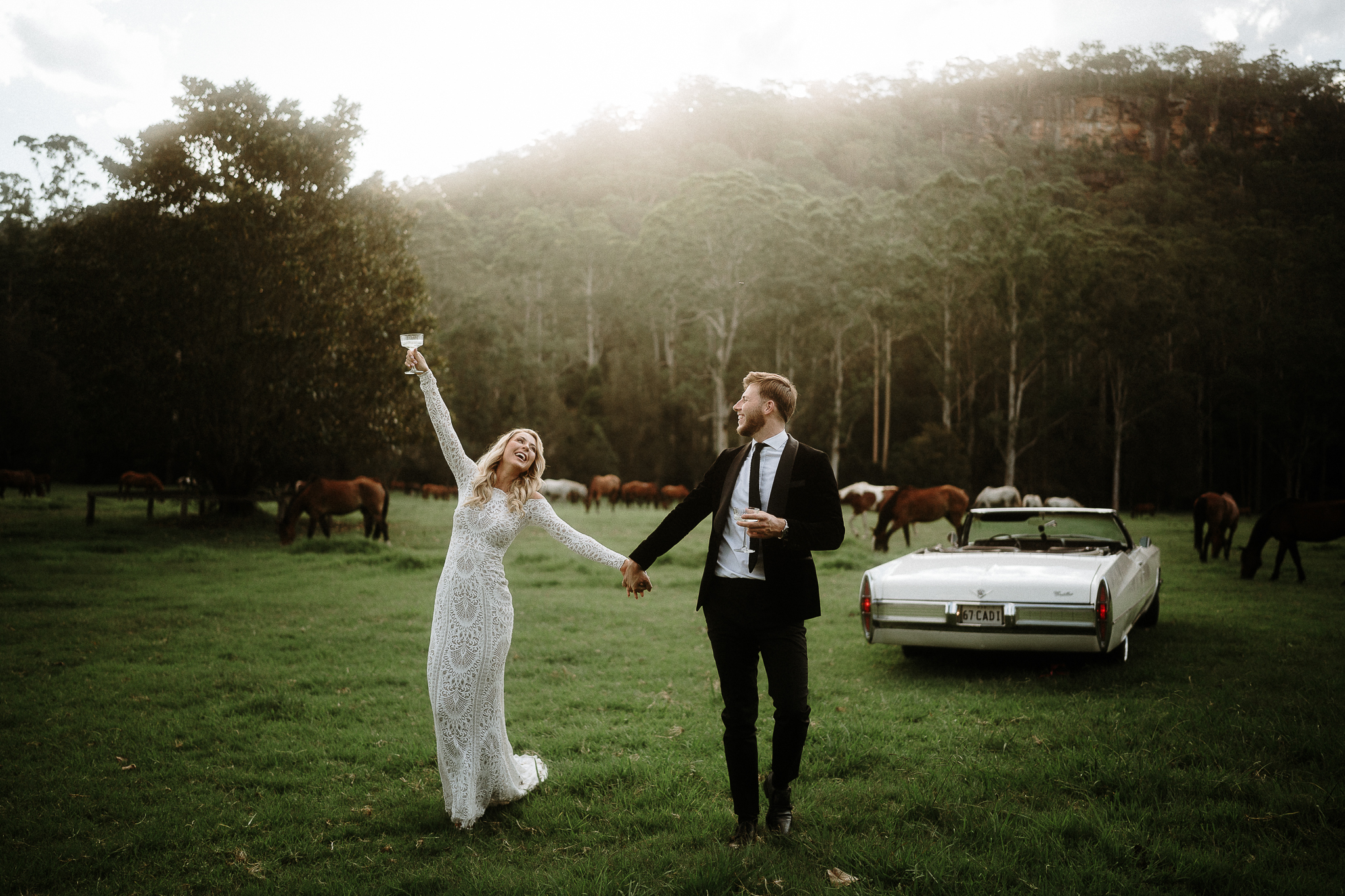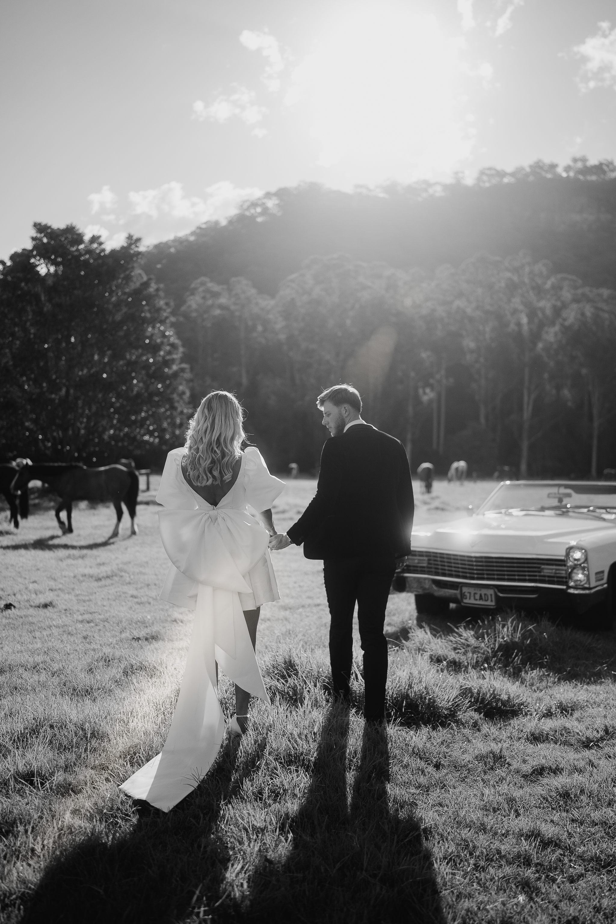 This beautiful photoshoot was done in the Glenworth valley weddings venue! If you are interested in shooting with horses and a beautiful landscape near Sydney, this is the place to be! All the things you see in this photoshoot, the car, dresses, suits, shoes, cake, champagne tower and the beautiful couple have all helped this shoot to achieve this beautiful look! I will post them all below as I highly recommend using these vendors! Car: @caddychicevents/ Bow dress: @kwhbridal/ Lace dresses: @grace_loves_lace/ Suits: @thdr_co/ Bridal shoes: @harloau/ Cake: @_sammiecakes