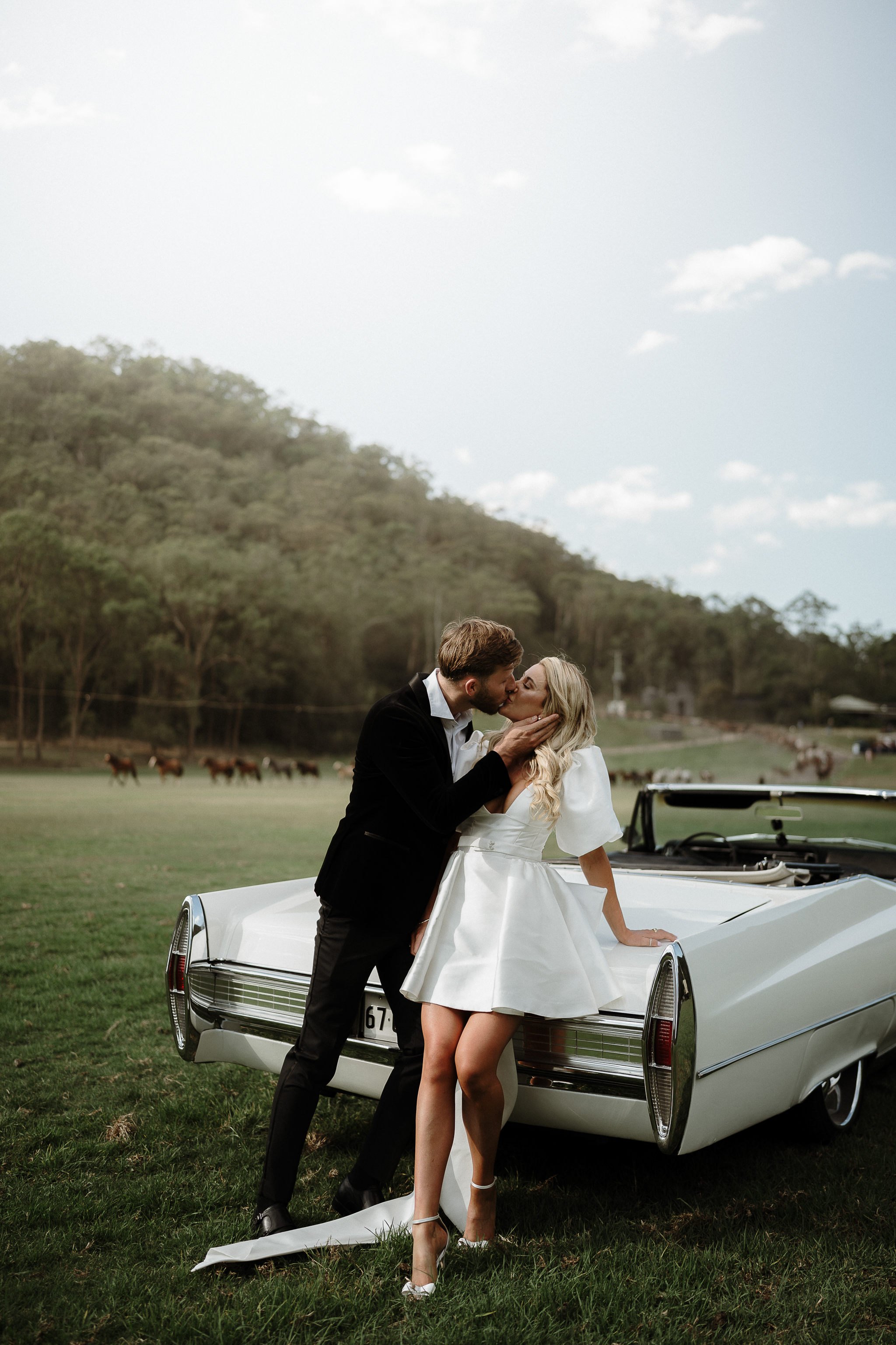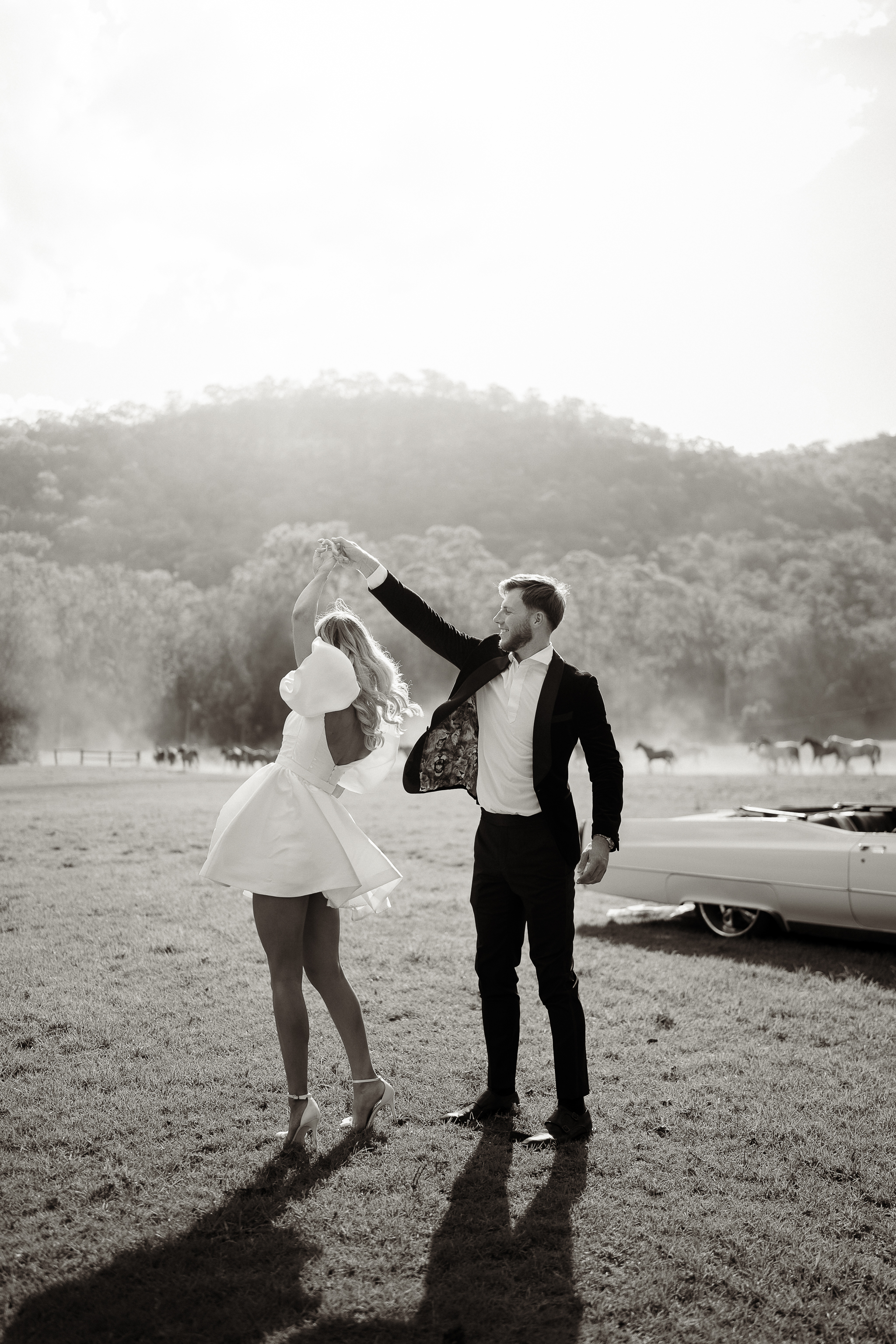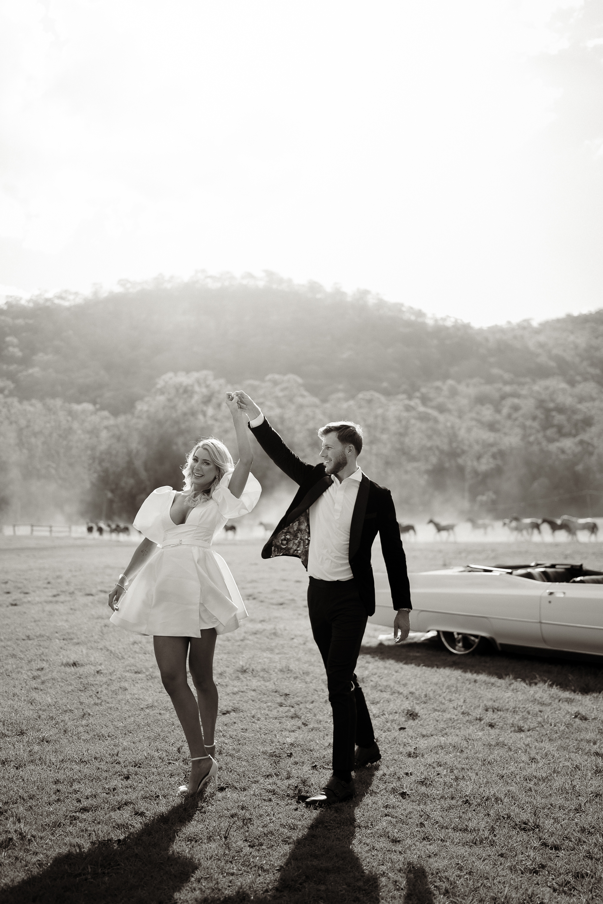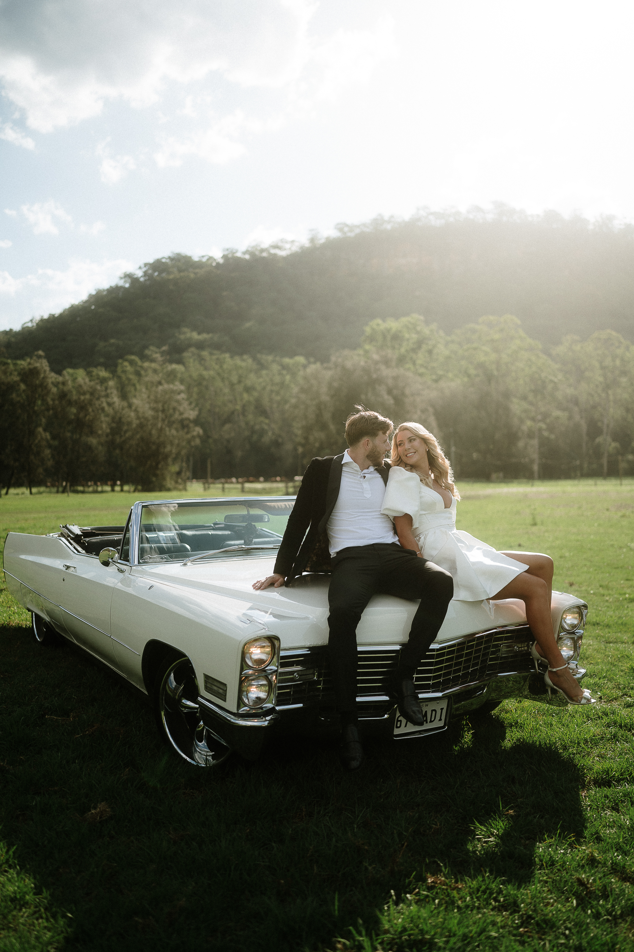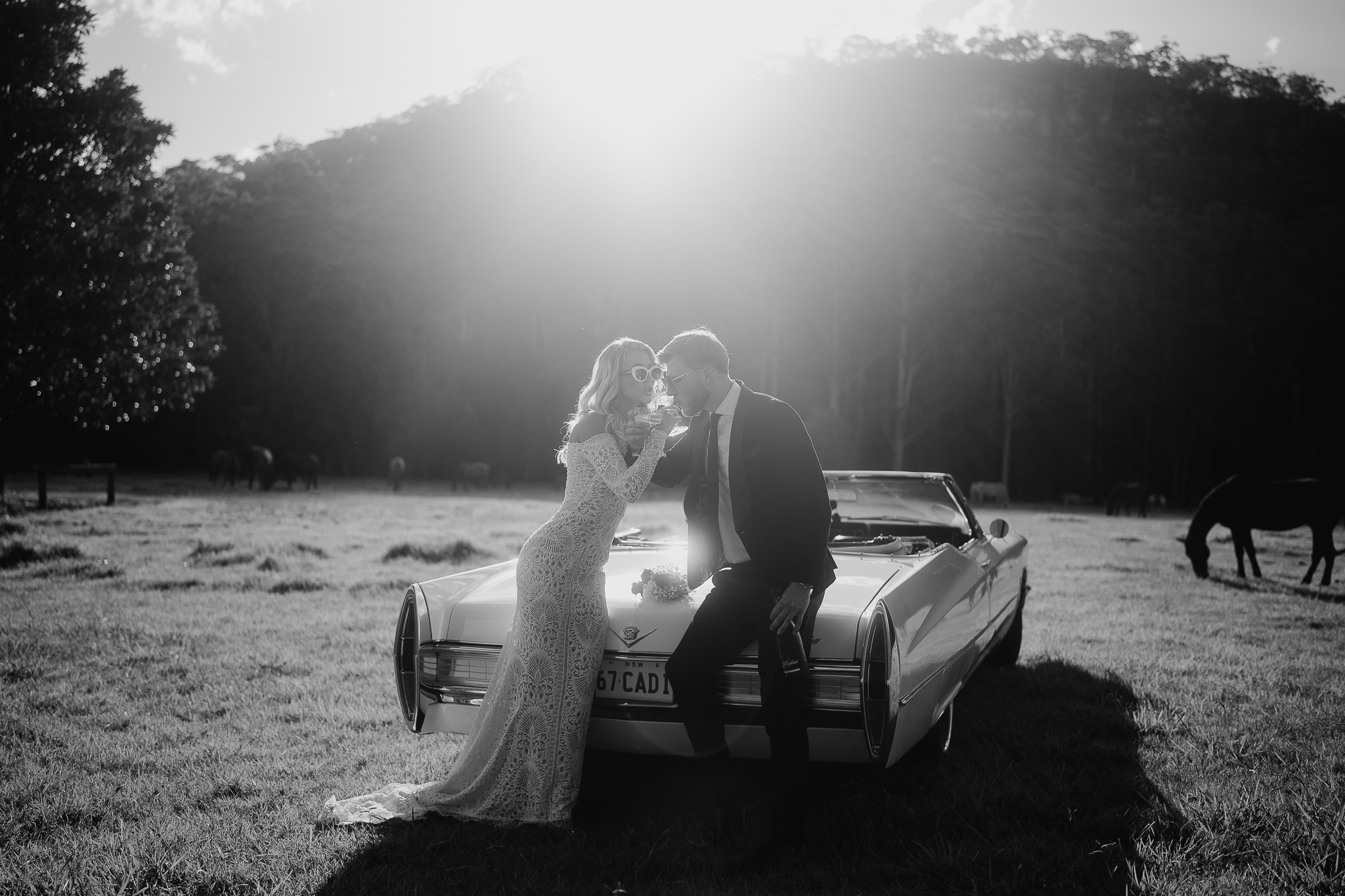 This beautiful photoshoot was done in the Glenworth valley weddings venue! If you are interested in shooting with horses and a beautiful landscape near Sydney, this is the place to be! All the things you see in this photoshoot, the car, dresses, suits, shoes, cake, champagne tower and the beautiful couple have all helped this shoot to achieve this beautiful look! I will post them all below as I highly recommend using these vendors! Car: @caddychicevents/ Bow dress: @kwhbridal/ Lace dresses: @grace_loves_lace/ Suits: @thdr_co/ Bridal shoes: @harloau/ Cake: @_sammiecakes