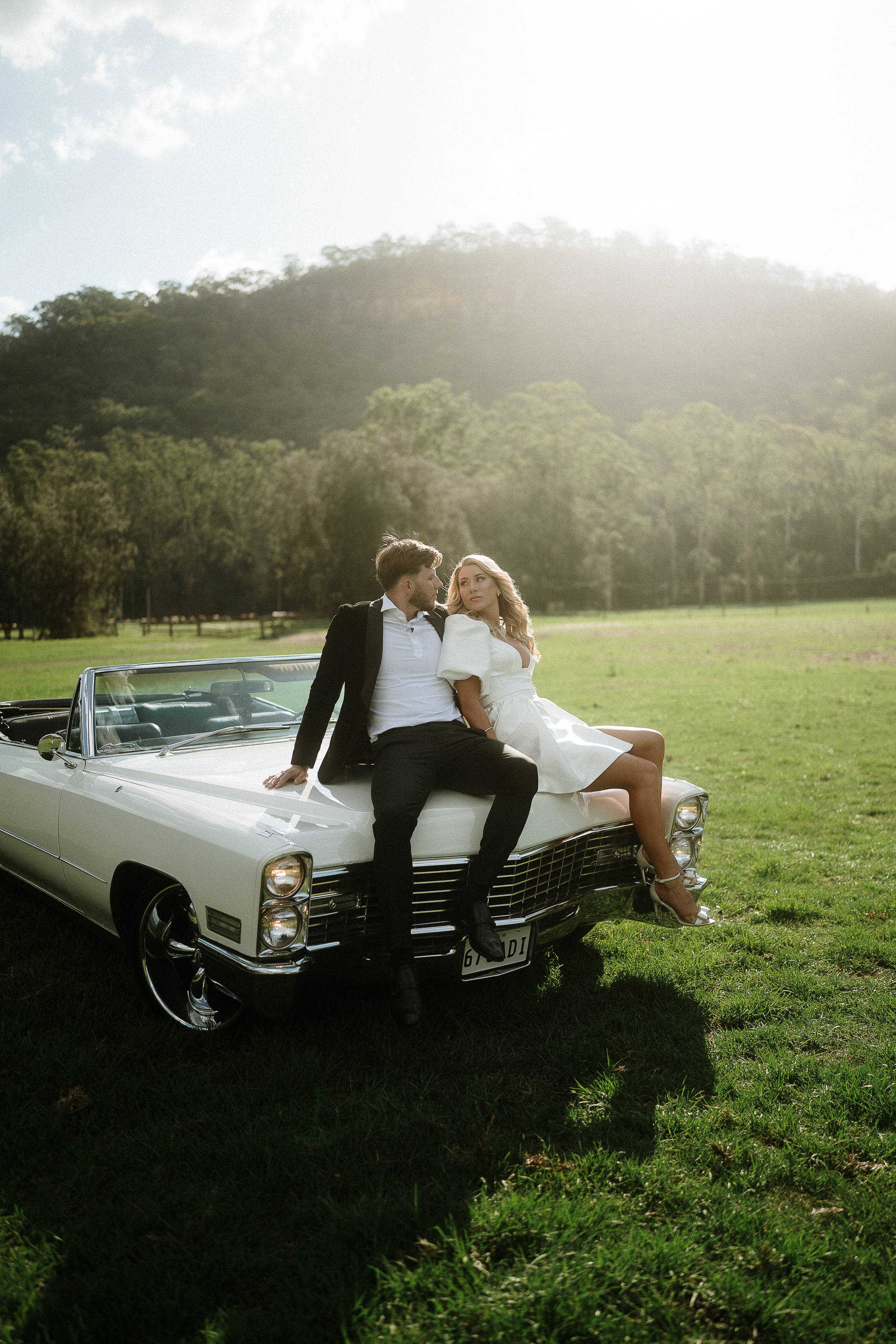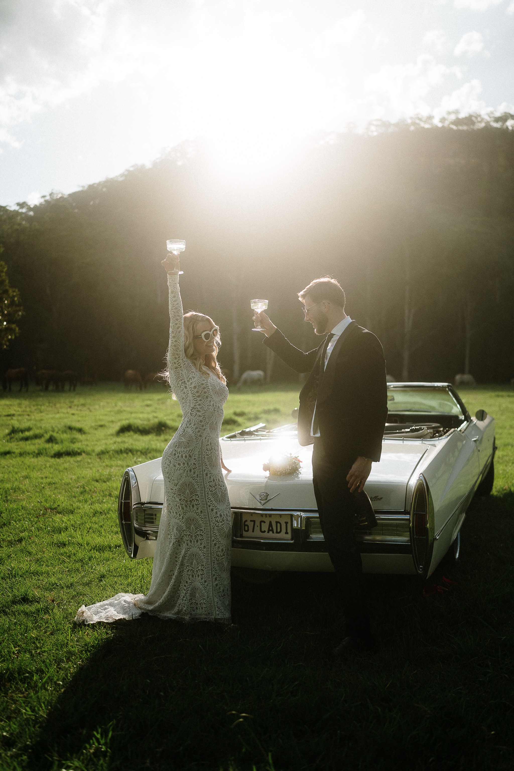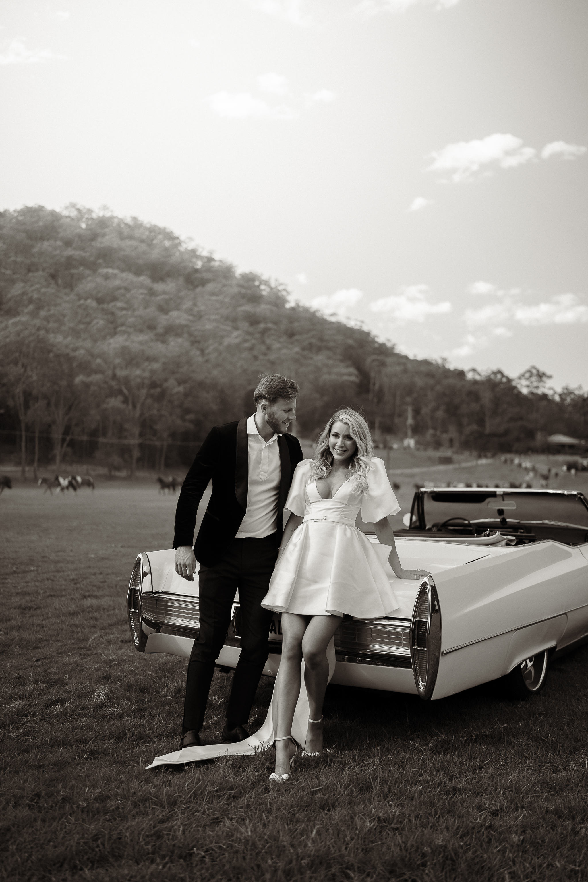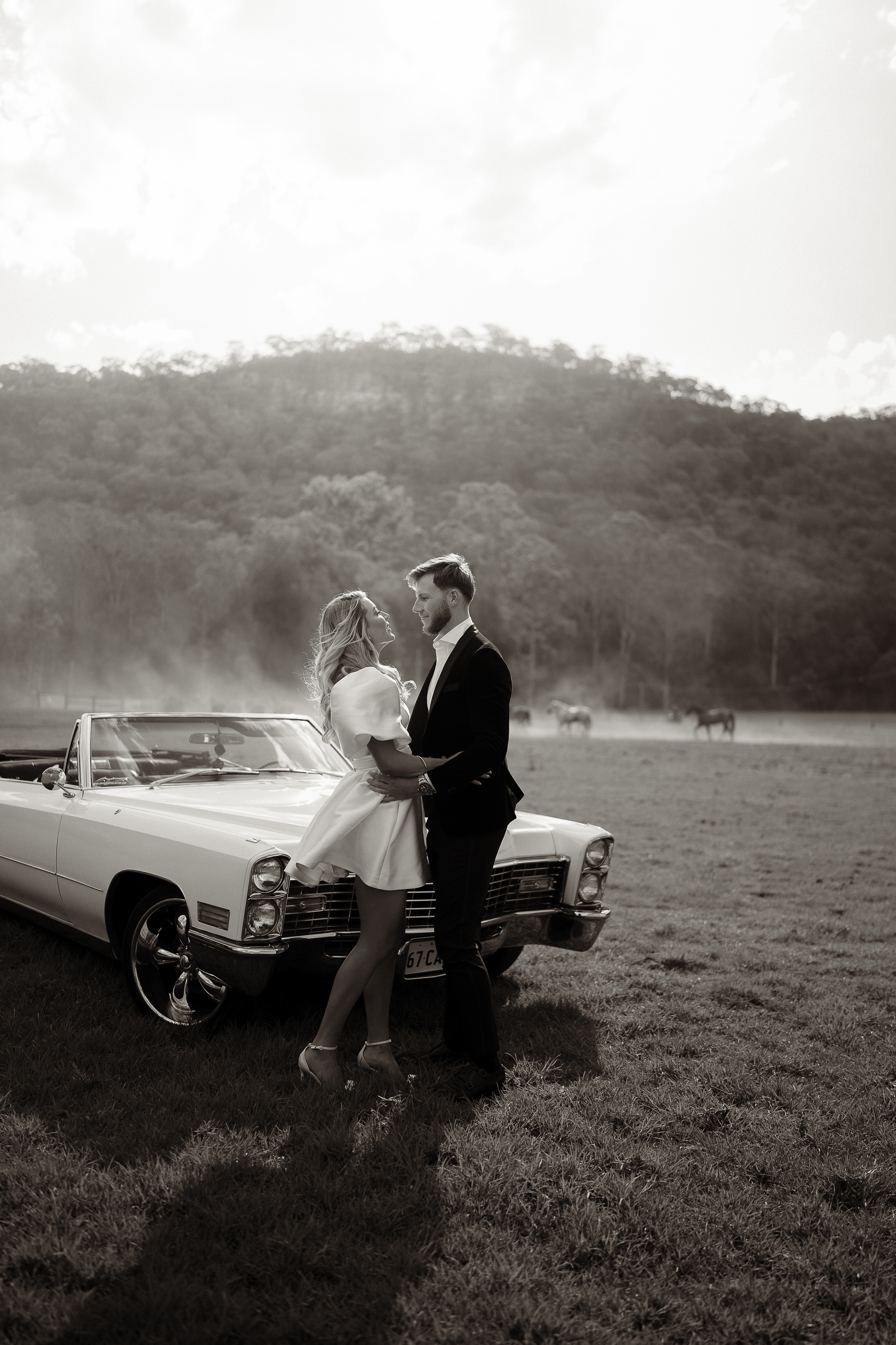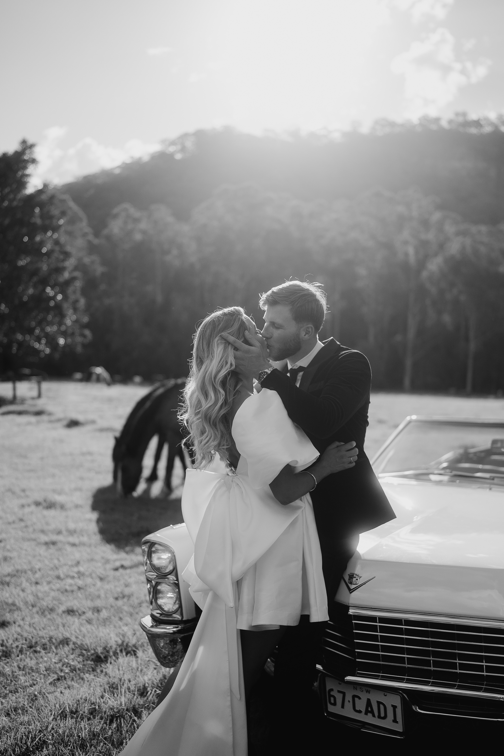 This beautiful photoshoot was done in the Glenworth valley weddings venue! If you are interested in shooting with horses and a beautiful landscape near Sydney, this is the place to be! All the things you see in this photoshoot, the car, dresses, suits, shoes, cake, champagne tower and the beautiful couple have all helped this shoot to achieve this beautiful look! I will post them all below as I highly recommend using these vendors! Car: @caddychicevents/ Bow dress: @kwhbridal/ Lace dresses: @grace_loves_lace/ Suits: @thdr_co/ Bridal shoes: @harloau/ Cake: @_sammiecakes
