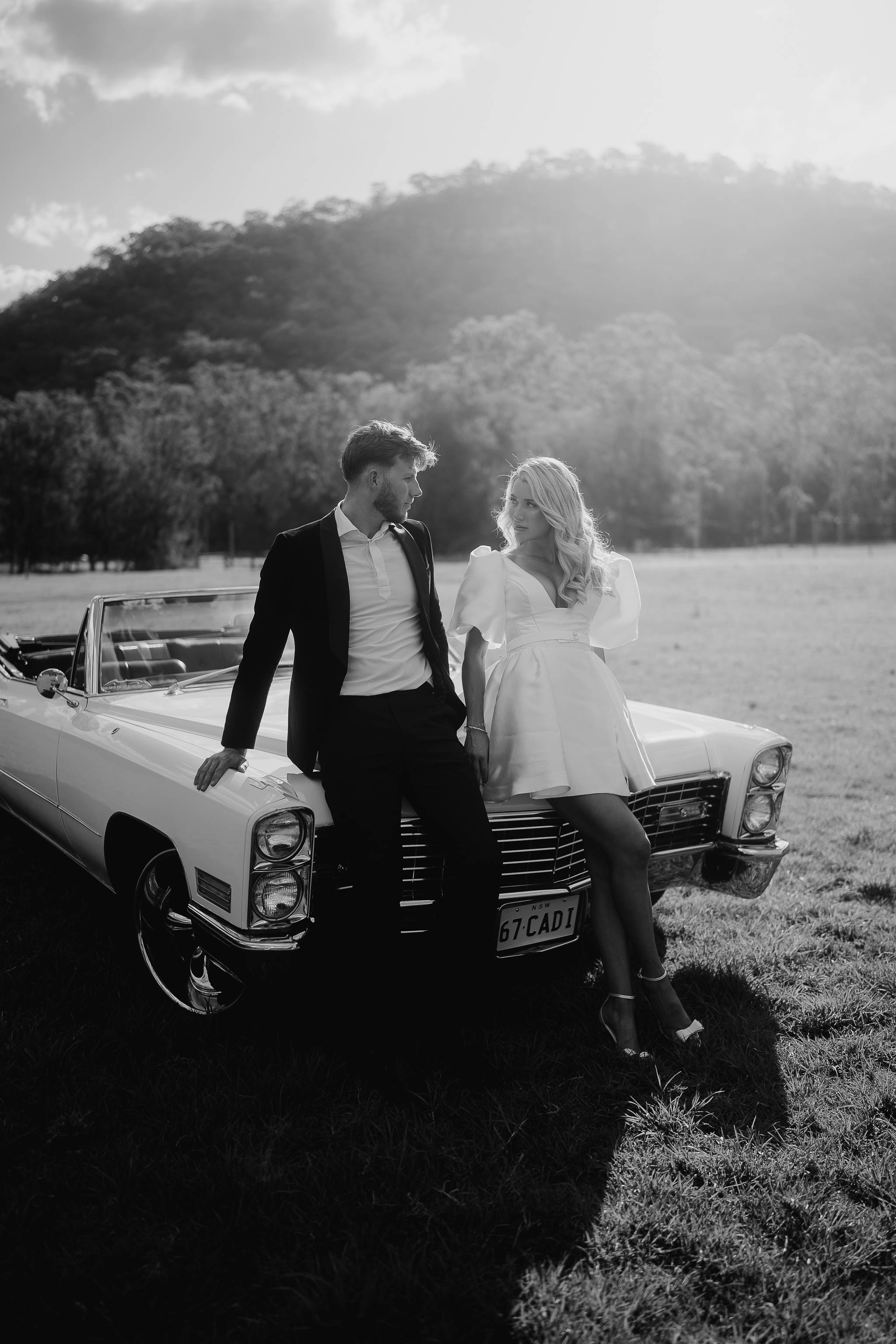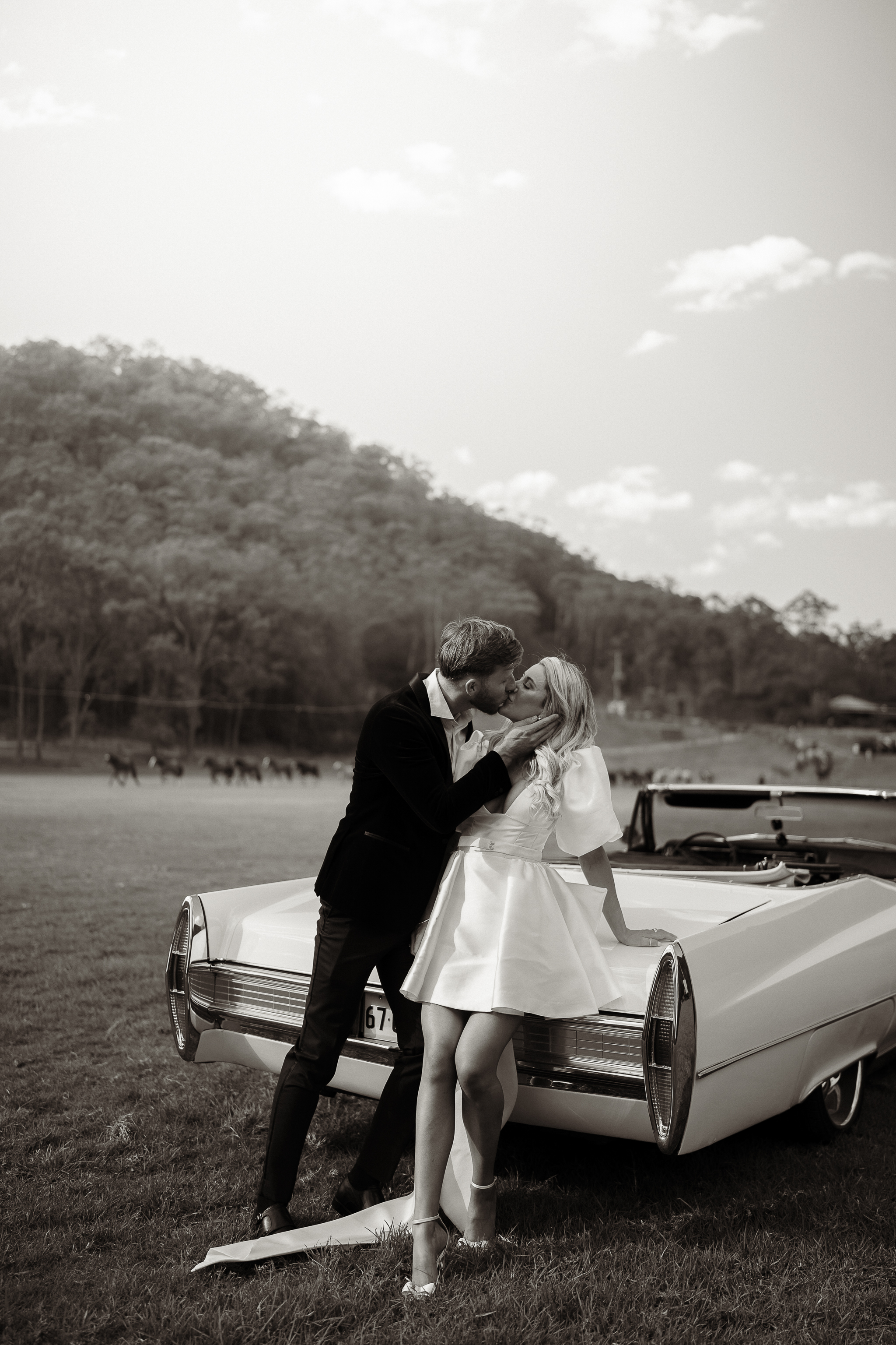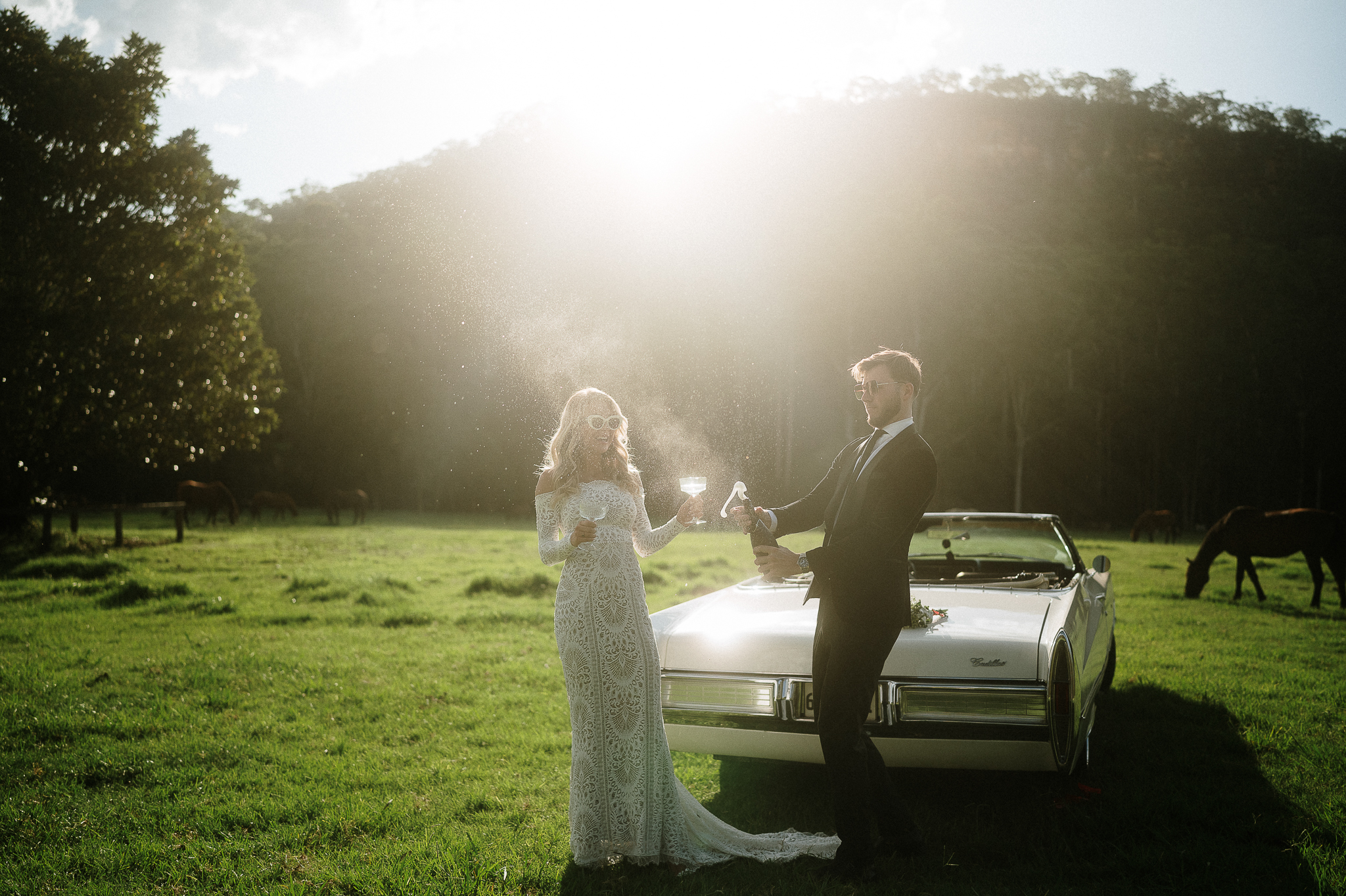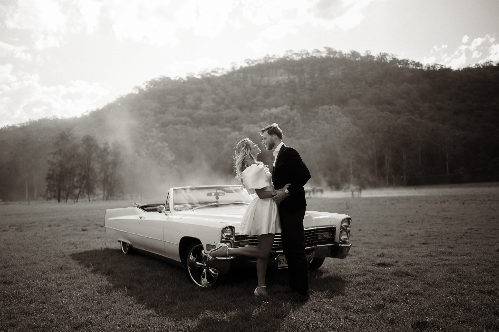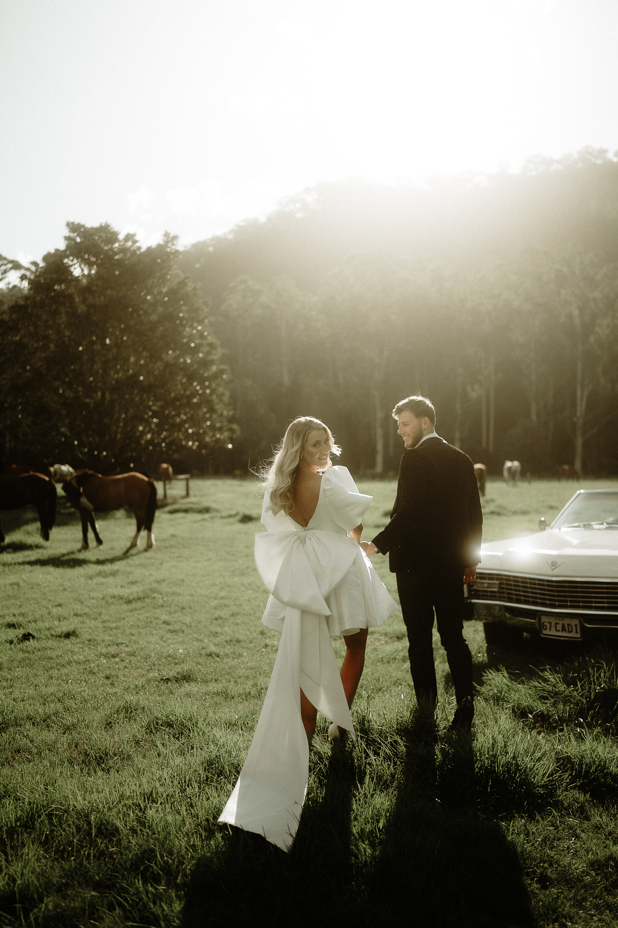 This beautiful photoshoot was done in the Glenworth valley weddings venue! If you are interested in shooting with horses and a beautiful landscape near Sydney, this is the place to be! All the things you see in this photoshoot, the car, dresses, suits, shoes, cake, champagne tower and the beautiful couple have all helped this shoot to achieve this beautiful look! I will post them all below as I highly recommend using these vendors! Car: @caddychicevents/ Bow dress: @kwhbridal/ Lace dresses: @grace_loves_lace/ Suits: @thdr_co/ Bridal shoes: @harloau/ Cake: @_sammiecakes