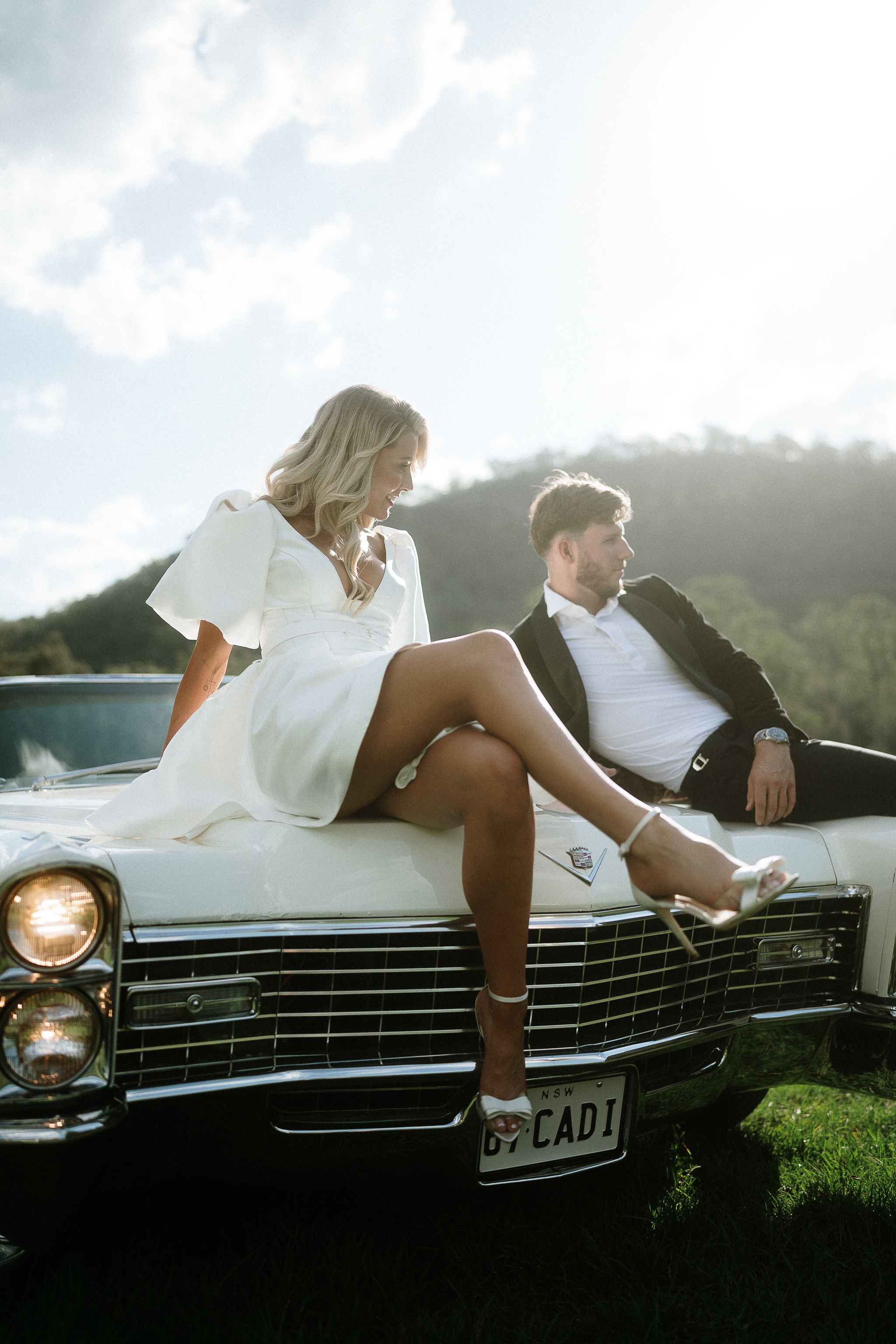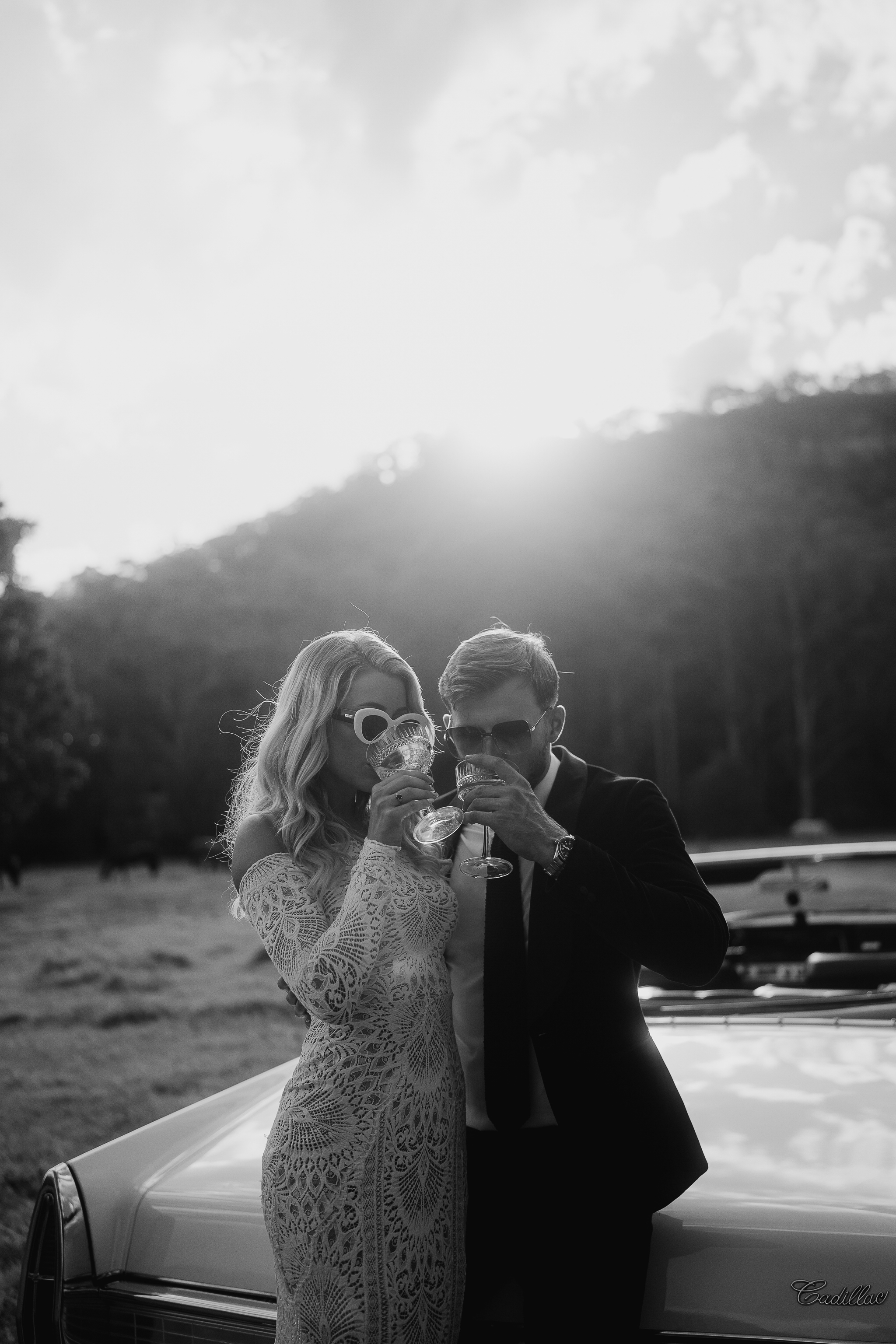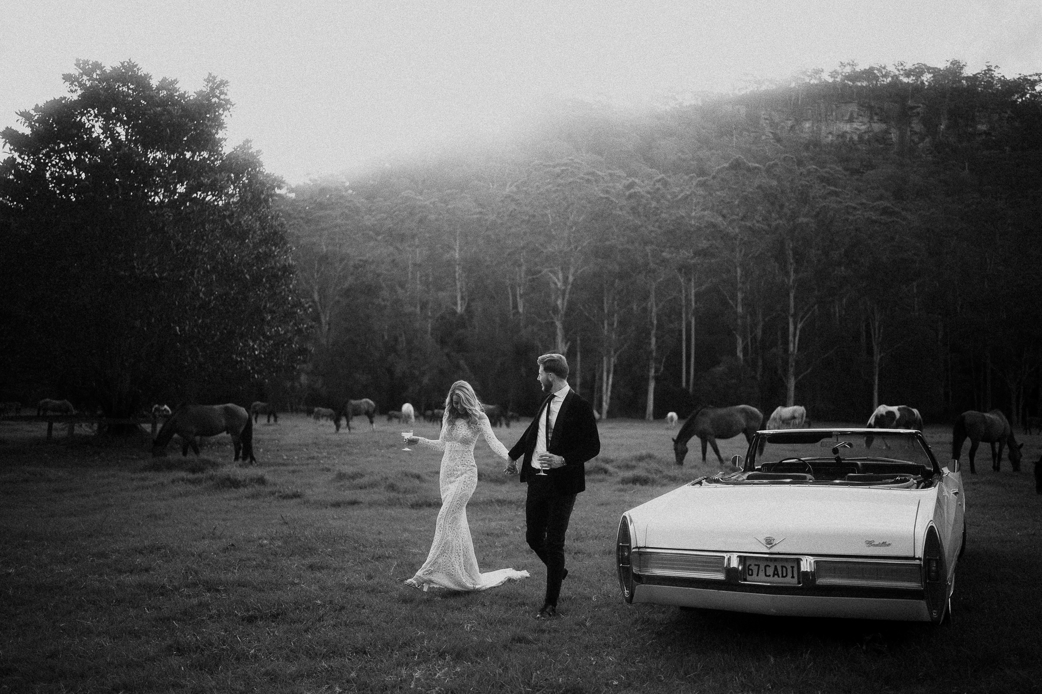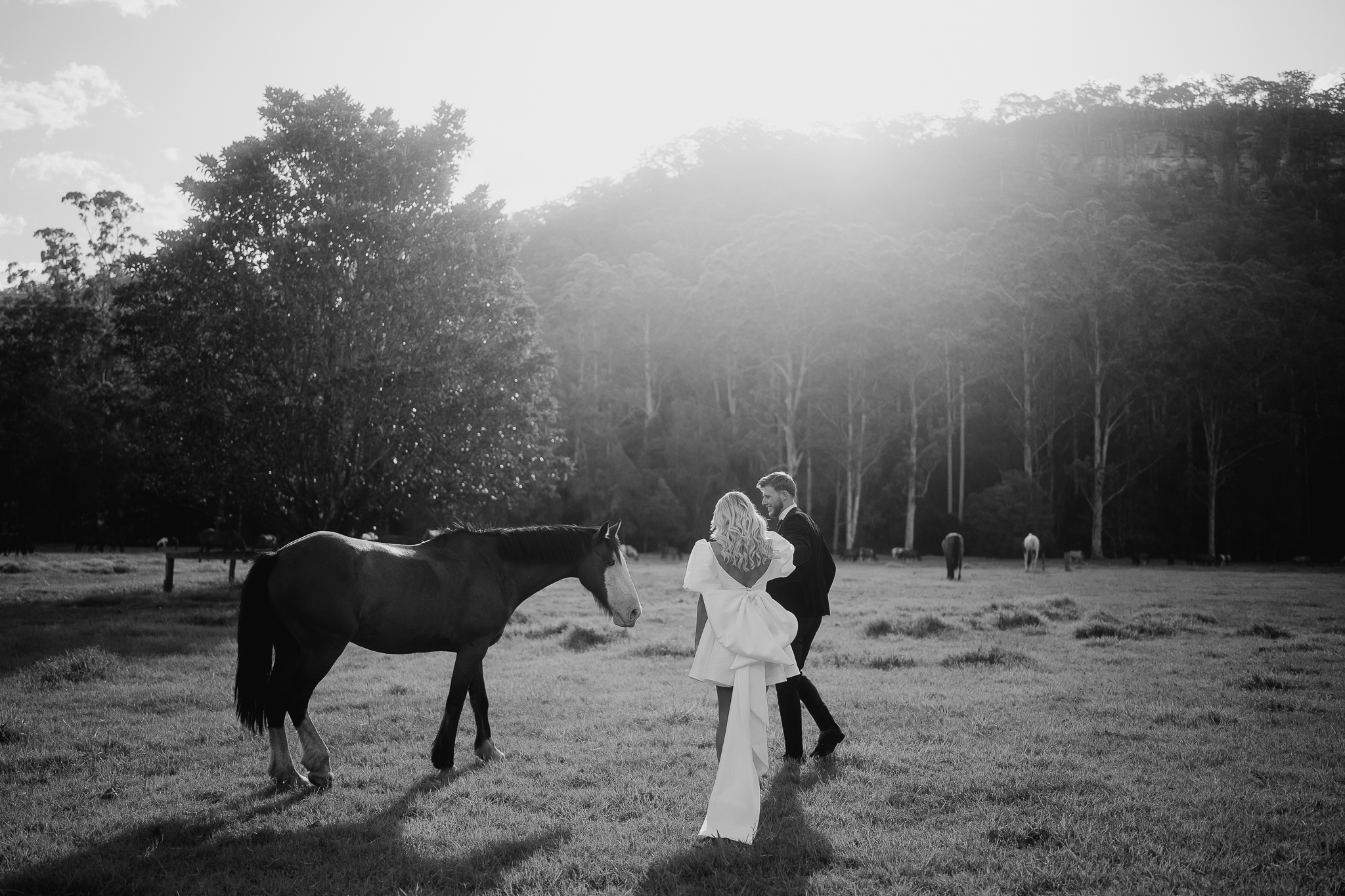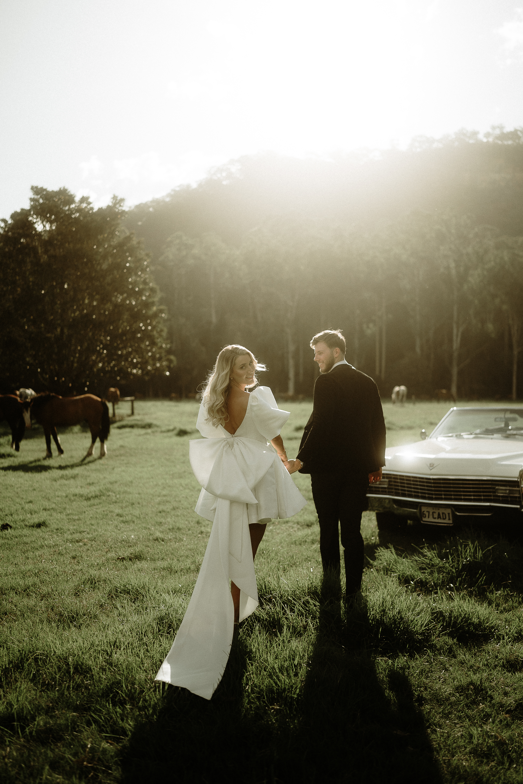 This beautiful photoshoot was done in the Glenworth valley weddings venue! If you are interested in shooting with horses and a beautiful landscape near Sydney, this is the place to be! All the things you see in this photoshoot, the car, dresses, suits, shoes, cake, champagne tower and the beautiful couple have all helped this shoot to achieve this beautiful look! I will post them all below as I highly recommend using these vendors! Car: @caddychicevents/ Bow dress: @kwhbridal/ Lace dresses: @grace_loves_lace/ Suits: @thdr_co/ Bridal shoes: @harloau/ Cake: @_sammiecakes