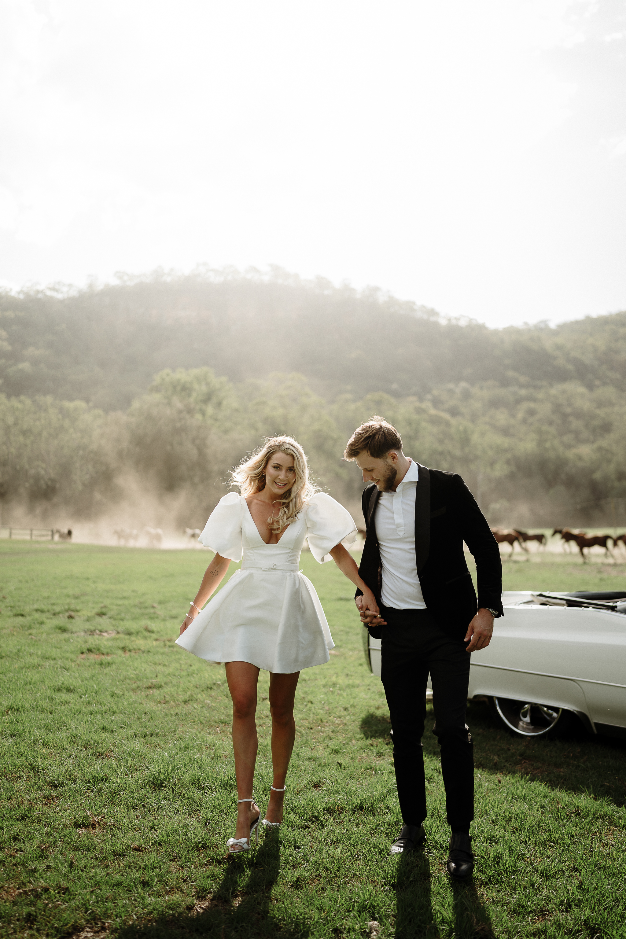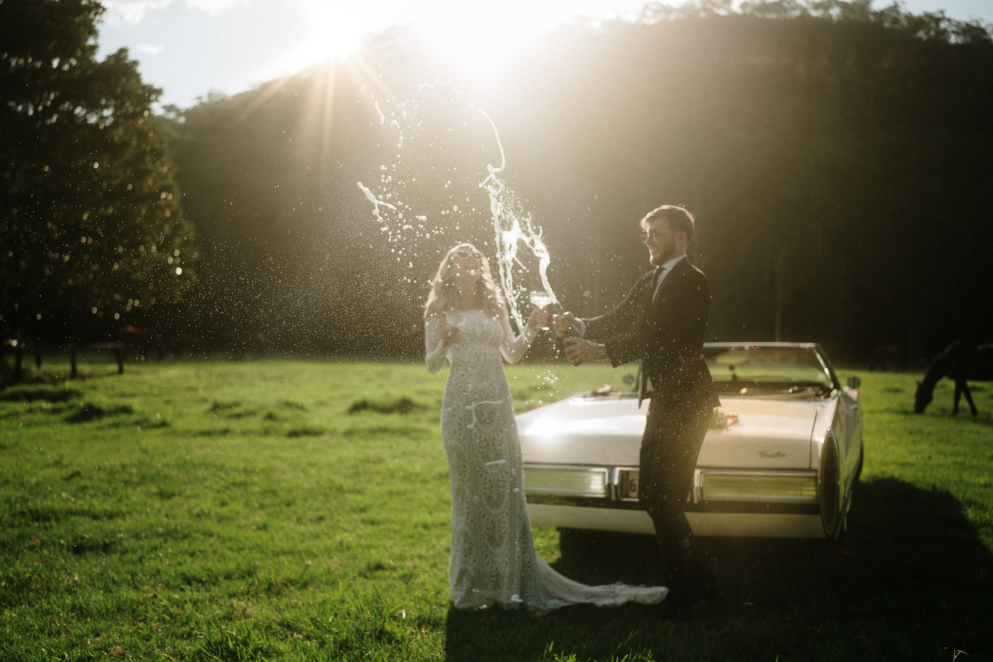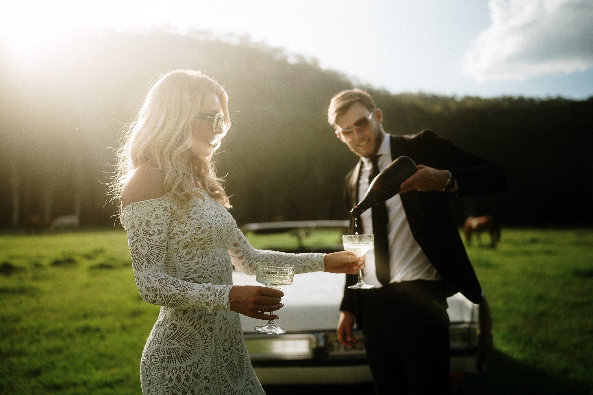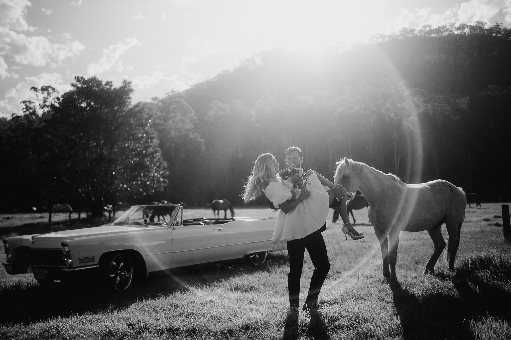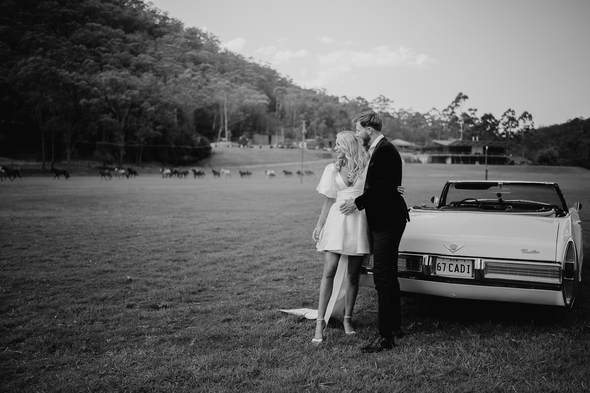 This beautiful photoshoot was done in the Glenworth valley weddings venue! If you are interested in shooting with horses and a beautiful landscape near Sydney, this is the place to be! All the things you see in this photoshoot, the car, dresses, suits, shoes, cake, champagne tower and the beautiful couple have all helped this shoot to achieve this beautiful look! I will post them all below as I highly recommend using these vendors! Car: @caddychicevents/ Bow dress: @kwhbridal/ Lace dresses: @grace_loves_lace/ Suits: @thdr_co/ Bridal shoes: @harloau/ Cake: @_sammiecakes