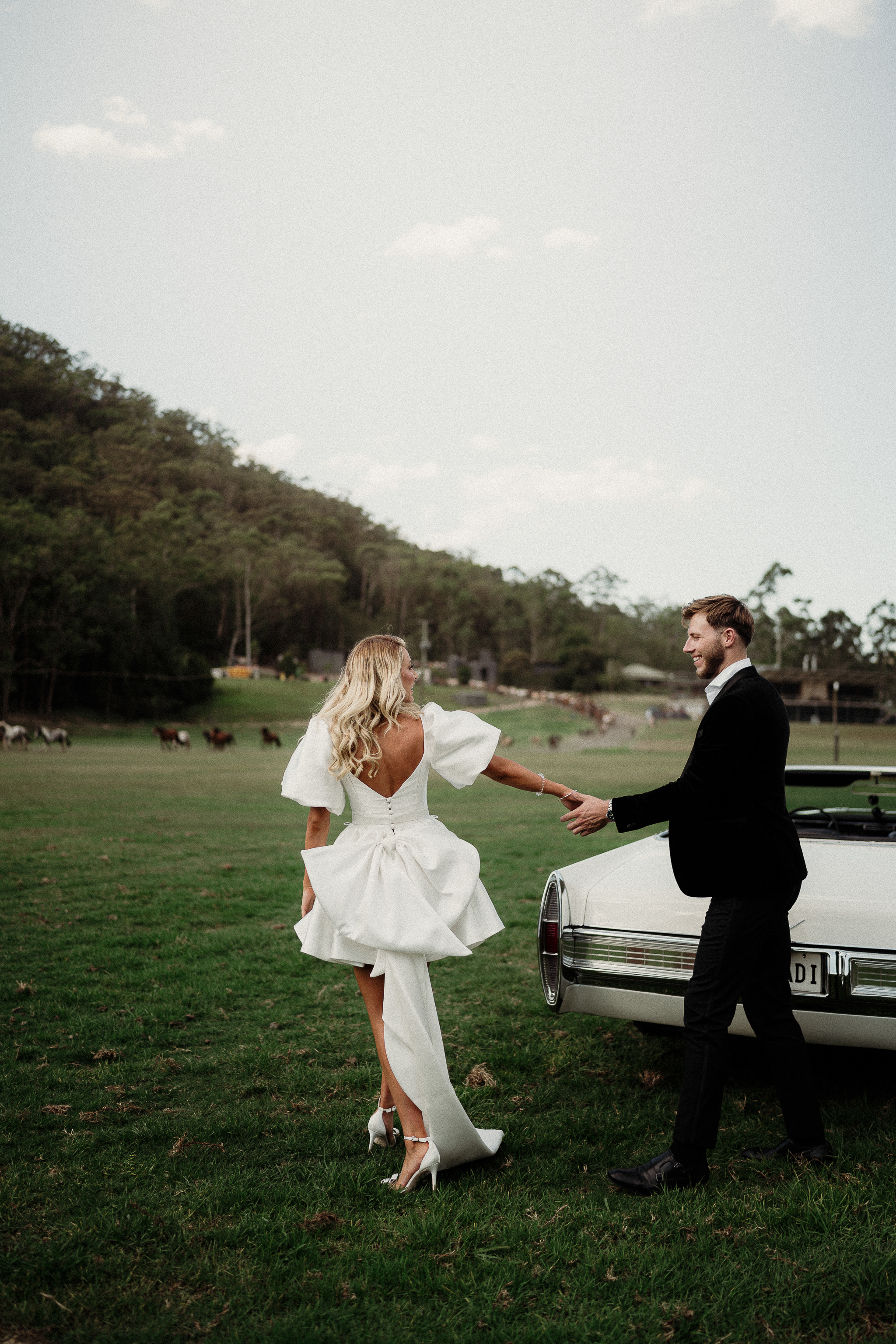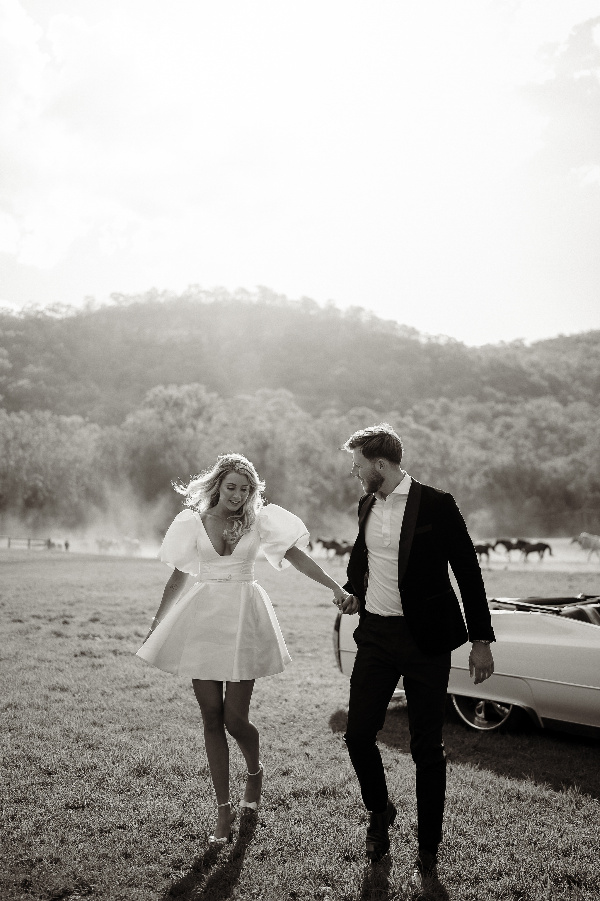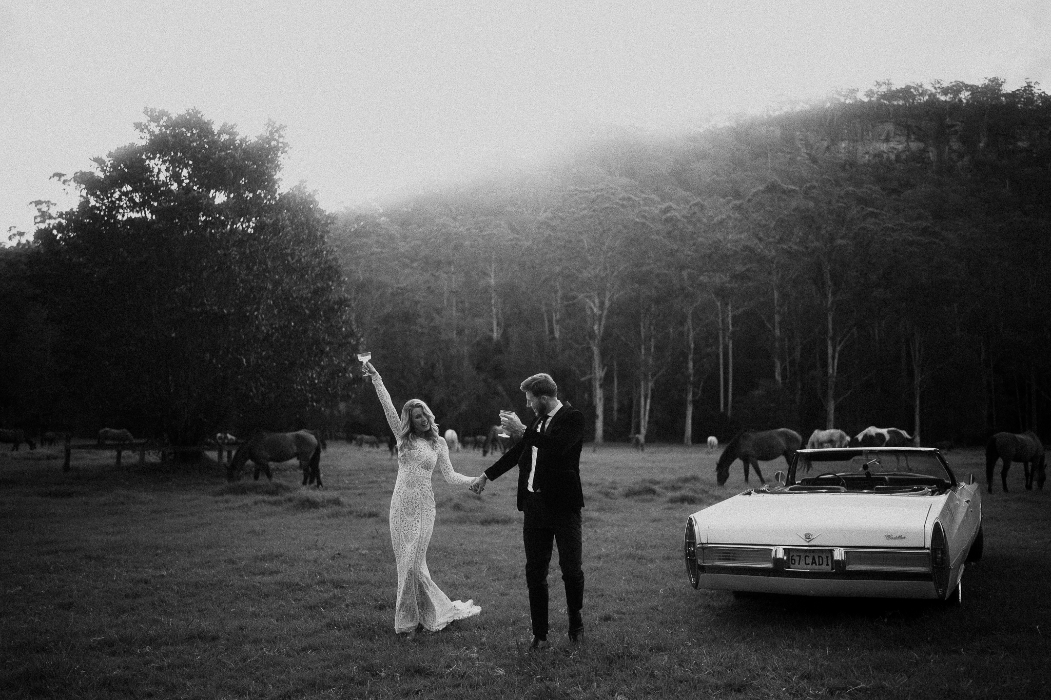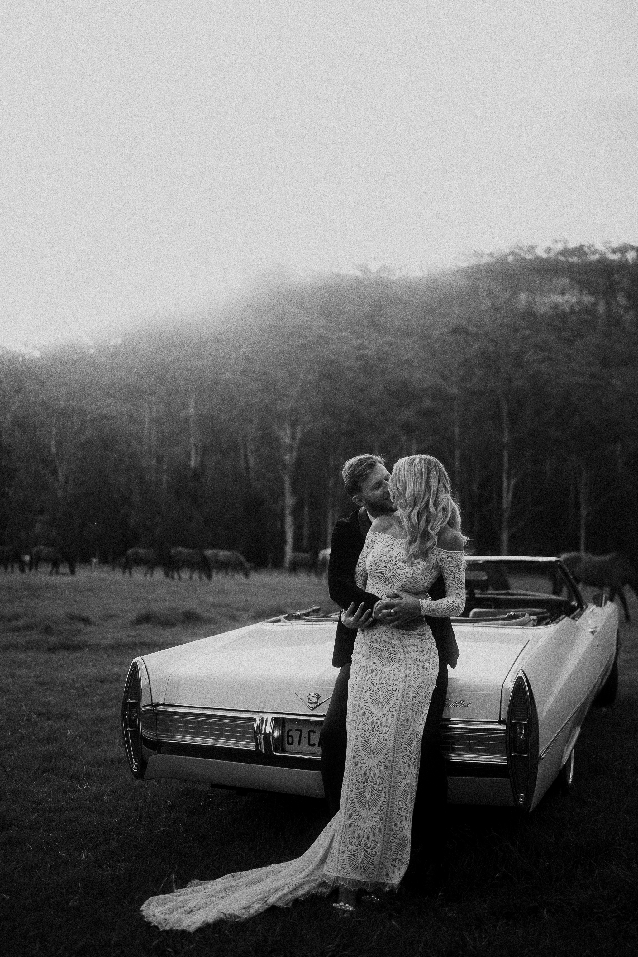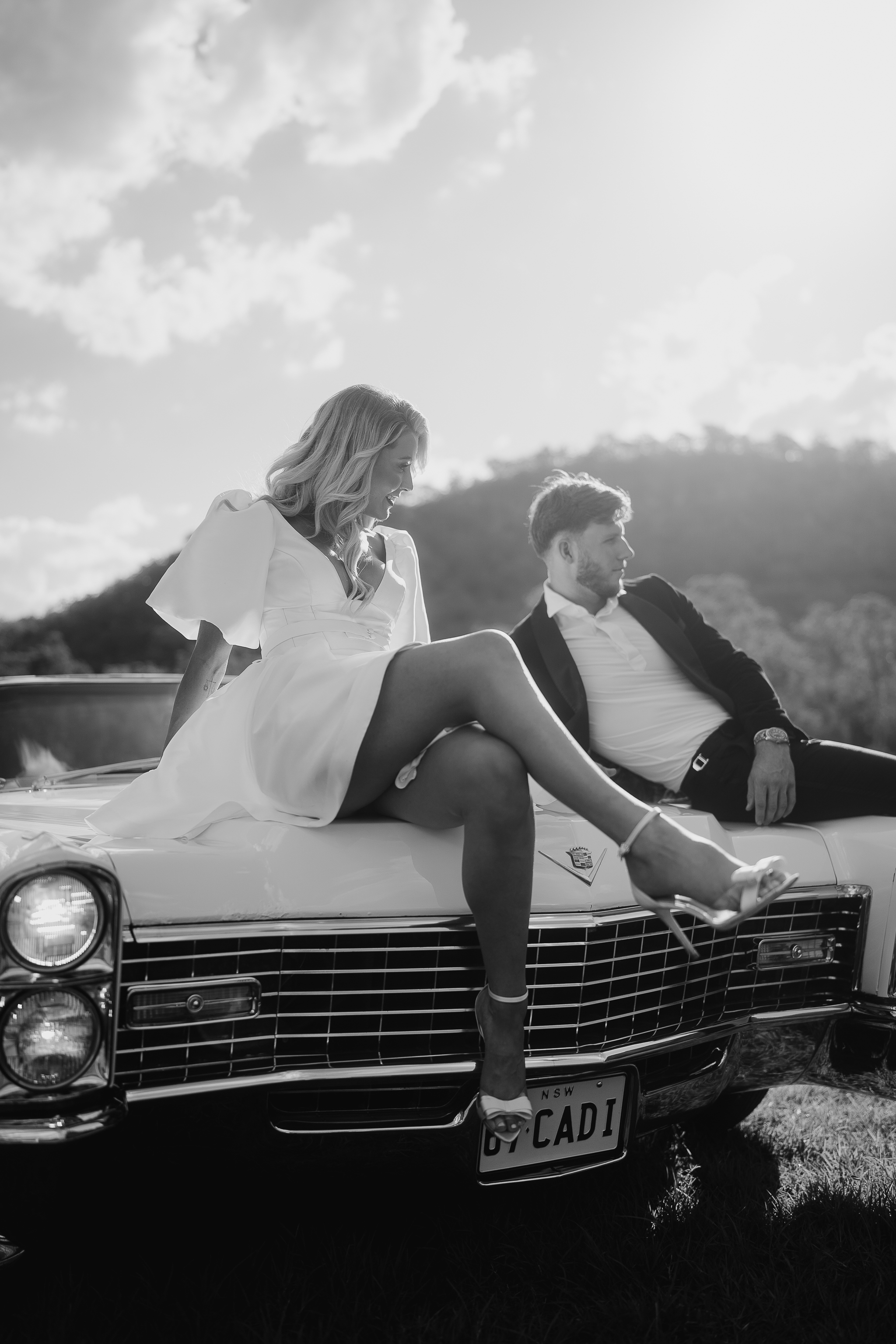 This beautiful photoshoot was done in the Glenworth valley weddings venue! If you are interested in shooting with horses and a beautiful landscape near Sydney, this is the place to be! All the things you see in this photoshoot, the car, dresses, suits, shoes, cake, champagne tower and the beautiful couple have all helped this shoot to achieve this beautiful look! I will post them all below as I highly recommend using these vendors! Car: @caddychicevents/ Bow dress: @kwhbridal/ Lace dresses: @grace_loves_lace/ Suits: @thdr_co/ Bridal shoes: @harloau/ Cake: @_sammiecakes