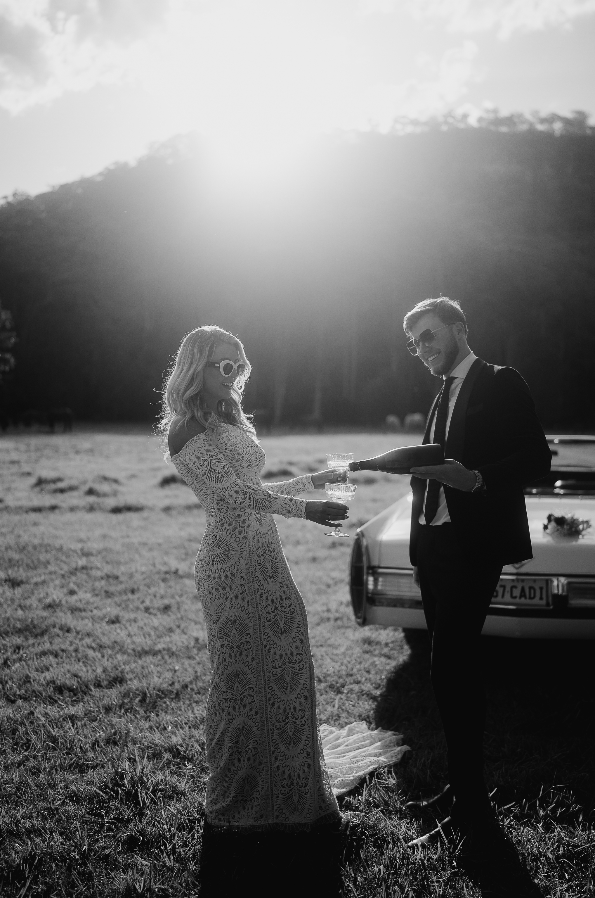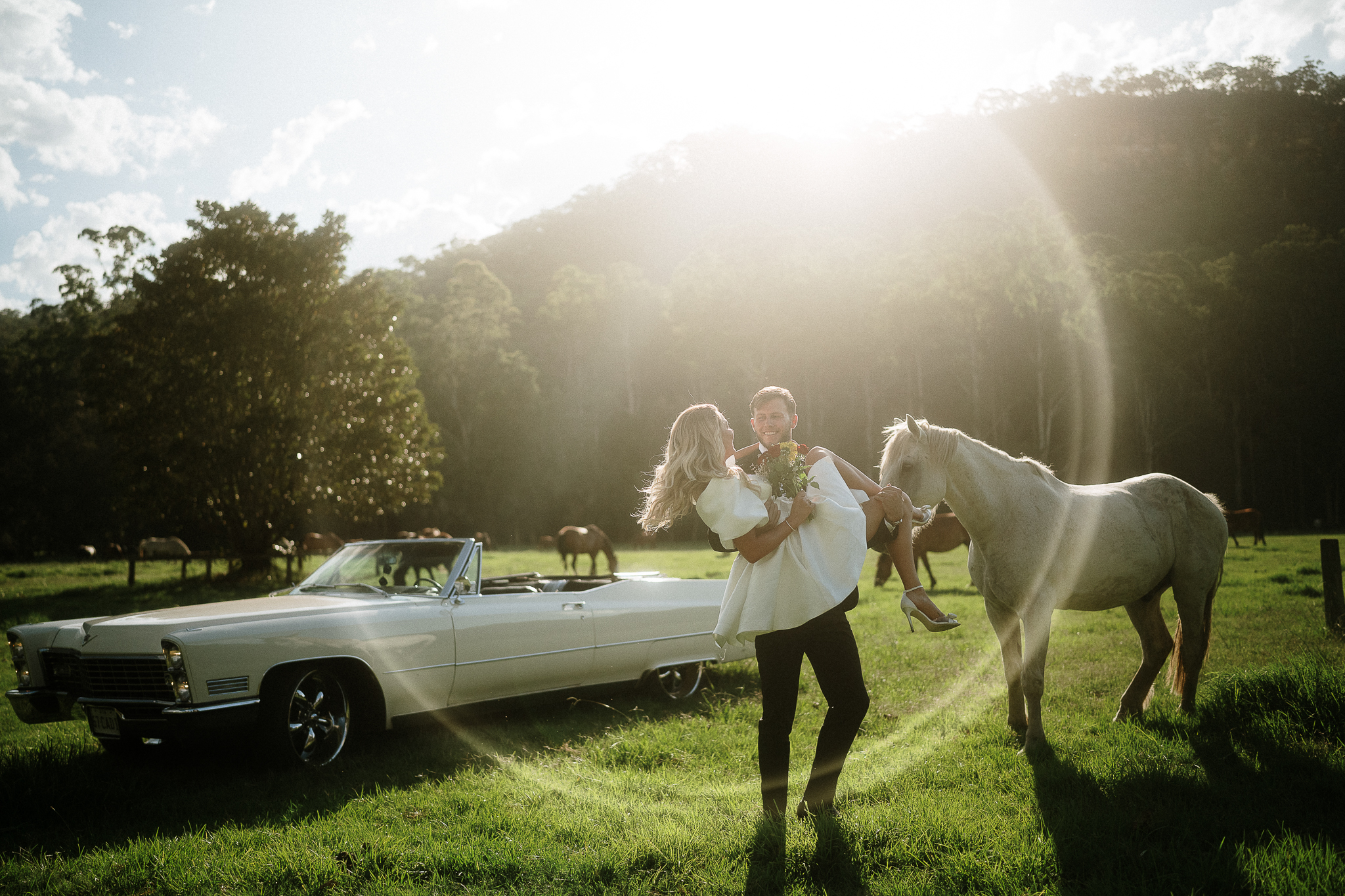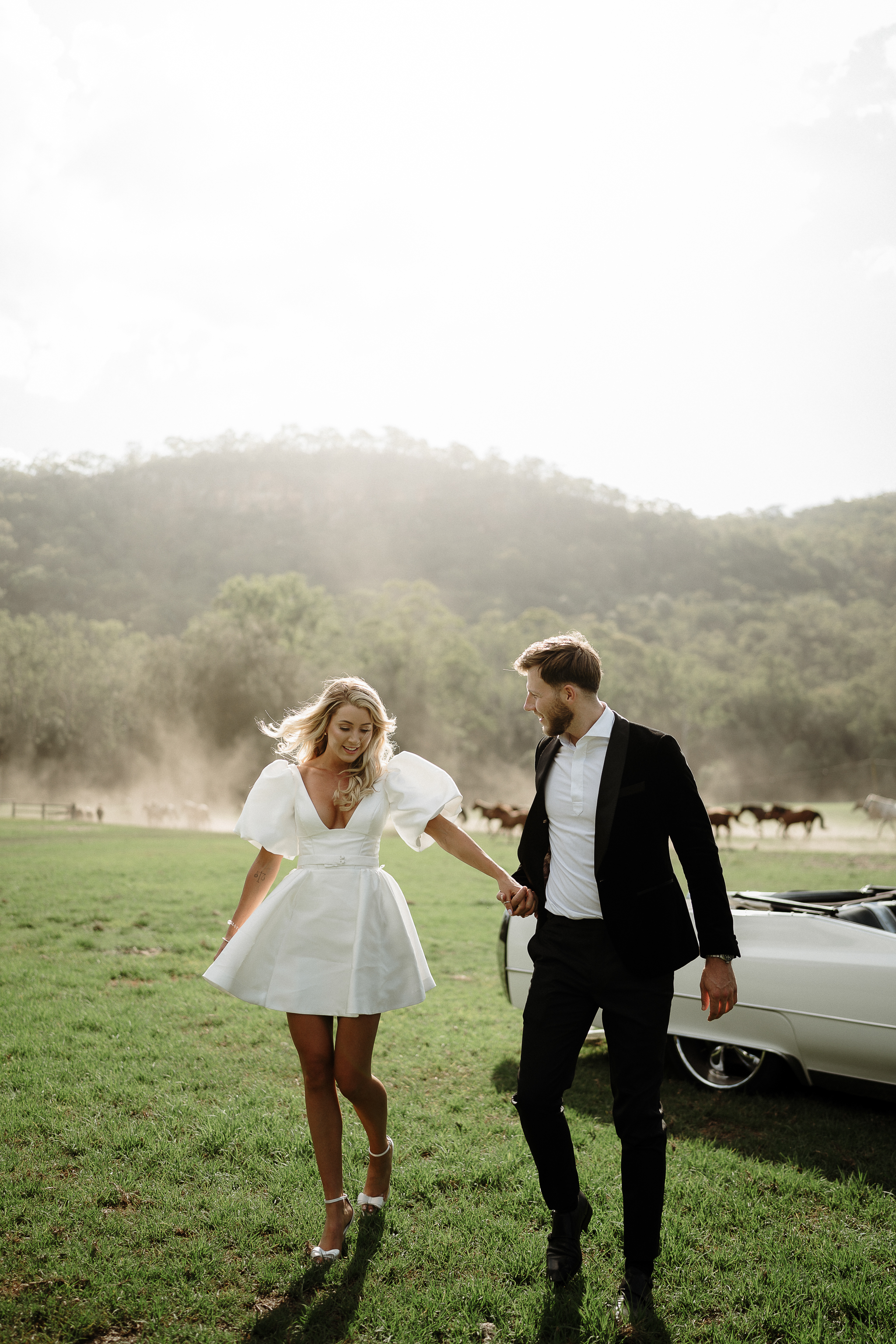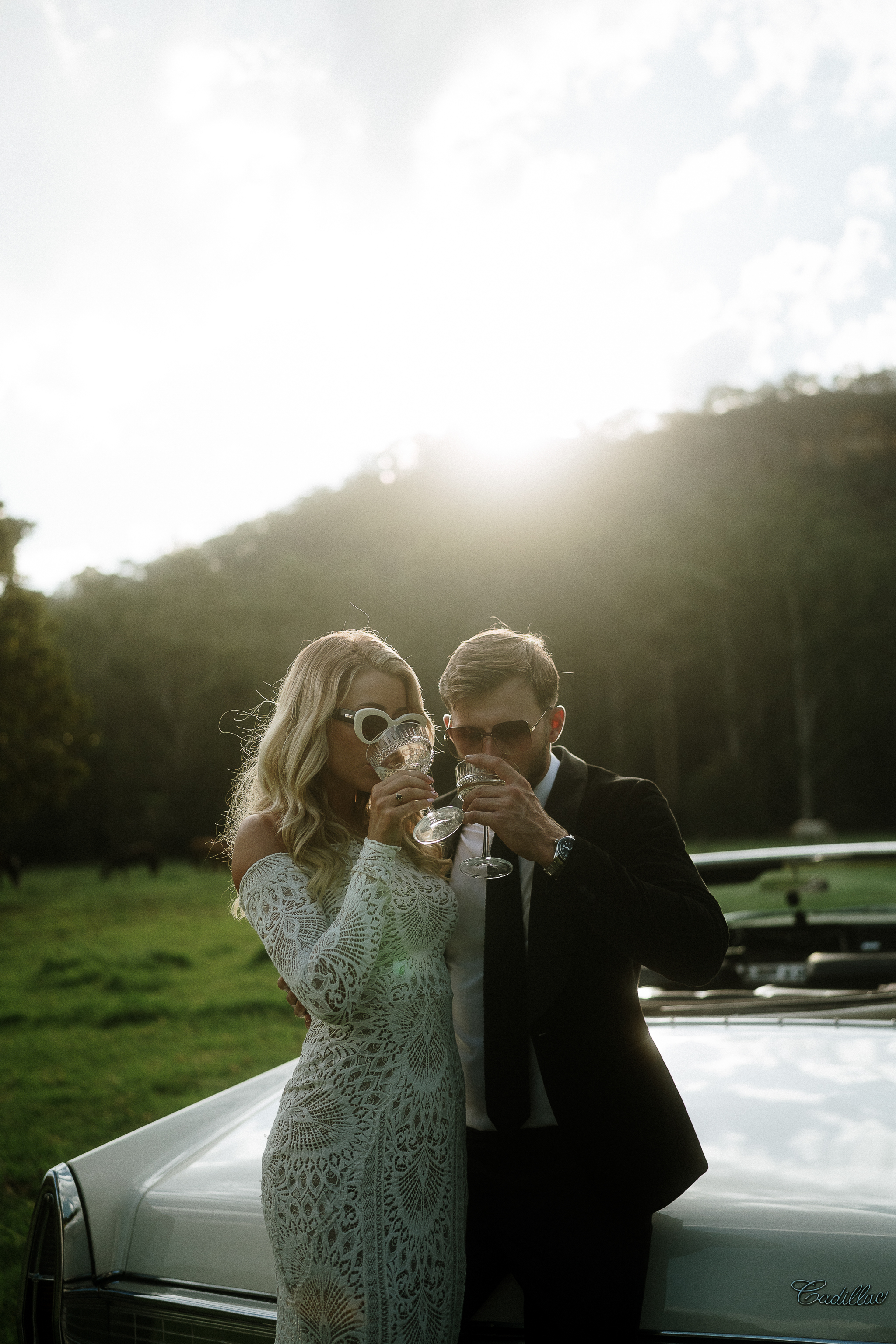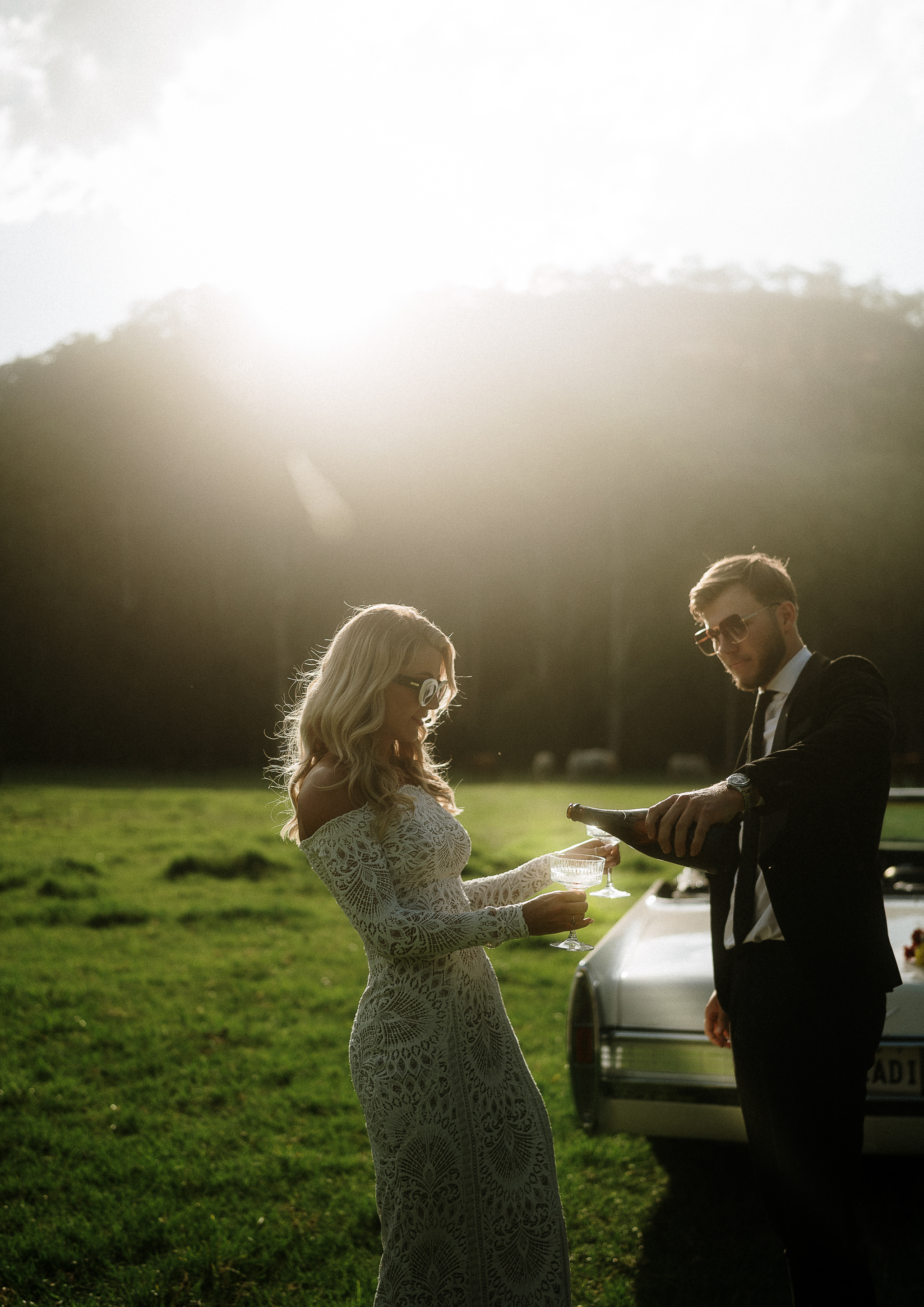 This beautiful photoshoot was done in the Glenworth valley weddings venue! If you are interested in shooting with horses and a beautiful landscape near Sydney, this is the place to be! All the things you see in this photoshoot, the car, dresses, suits, shoes, cake, champagne tower and the beautiful couple have all helped this shoot to achieve this beautiful look! I will post them all below as I highly recommend using these vendors! Car: @caddychicevents/ Bow dress: @kwhbridal/ Lace dresses: @grace_loves_lace/ Suits: @thdr_co/ Bridal shoes: @harloau/ Cake: @_sammiecakes