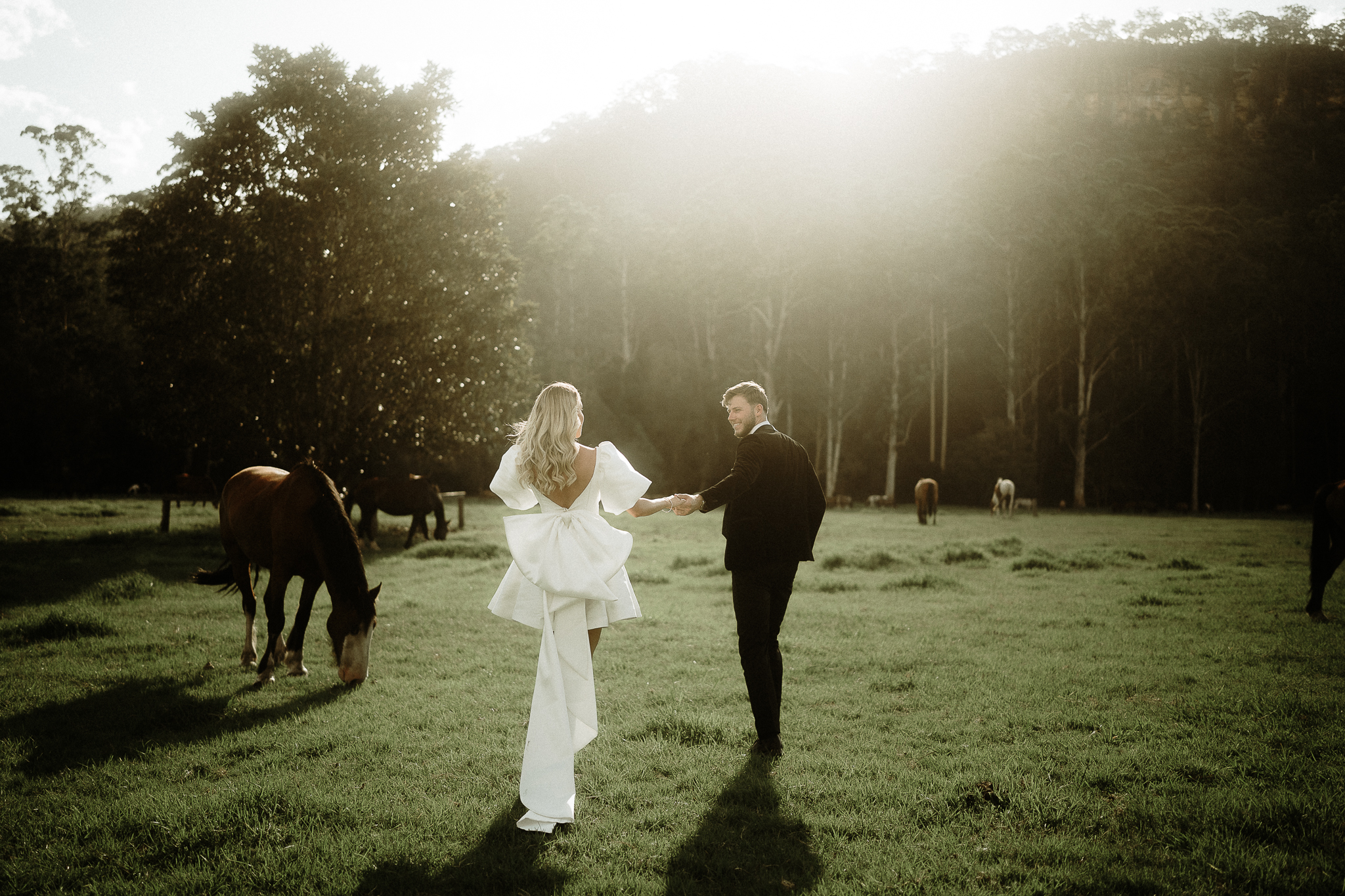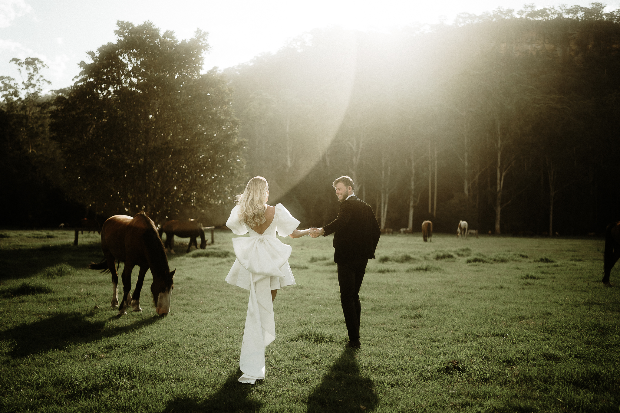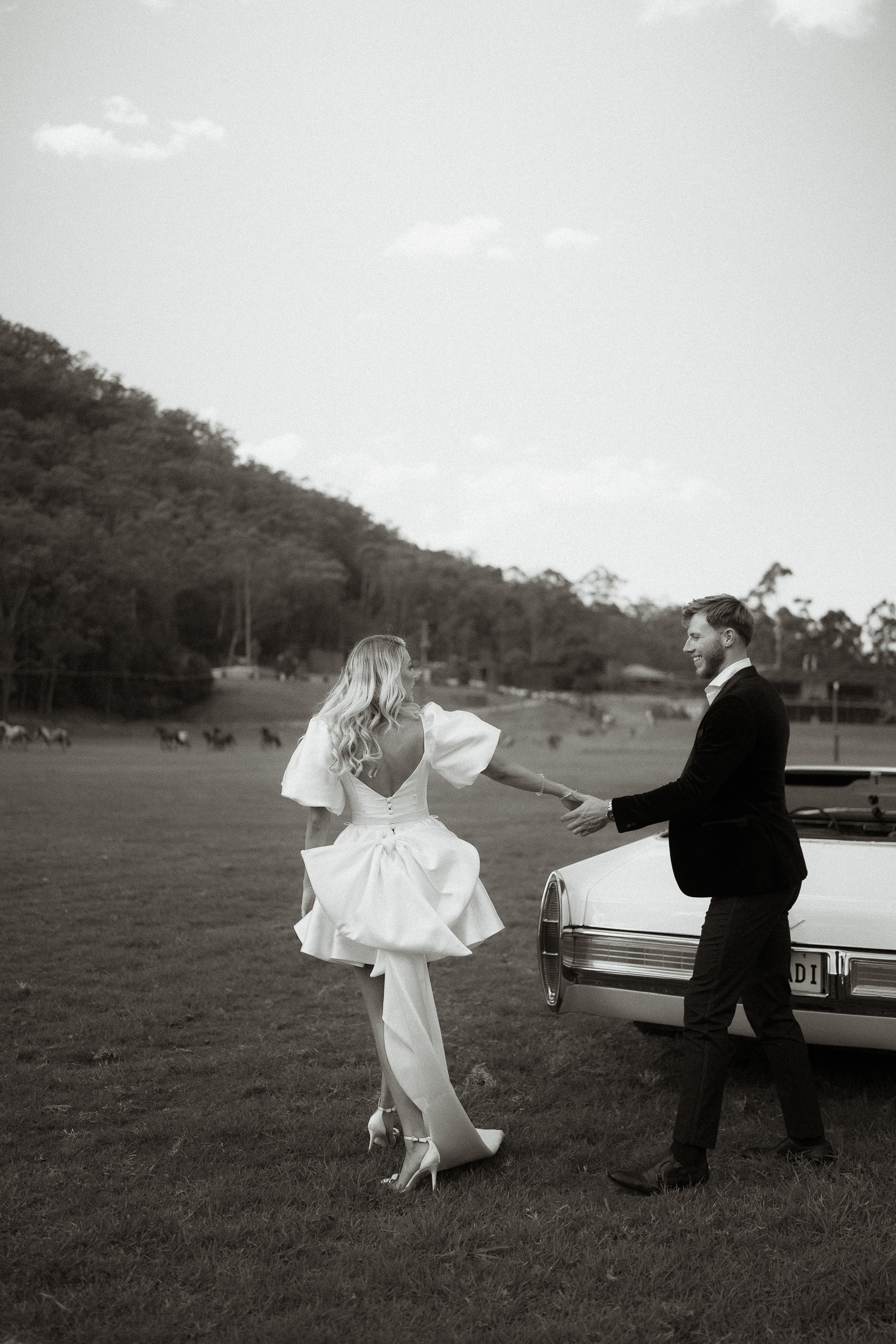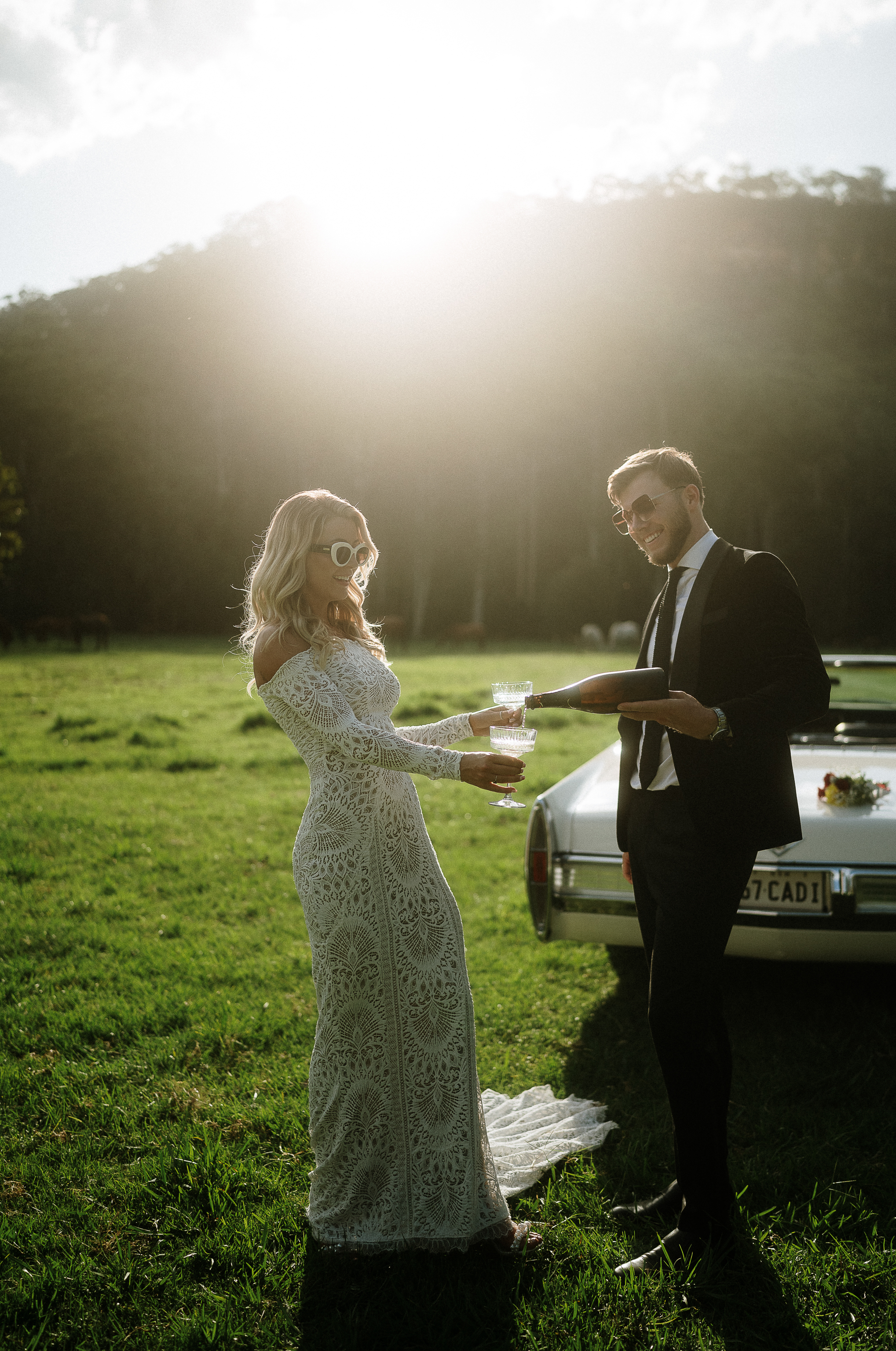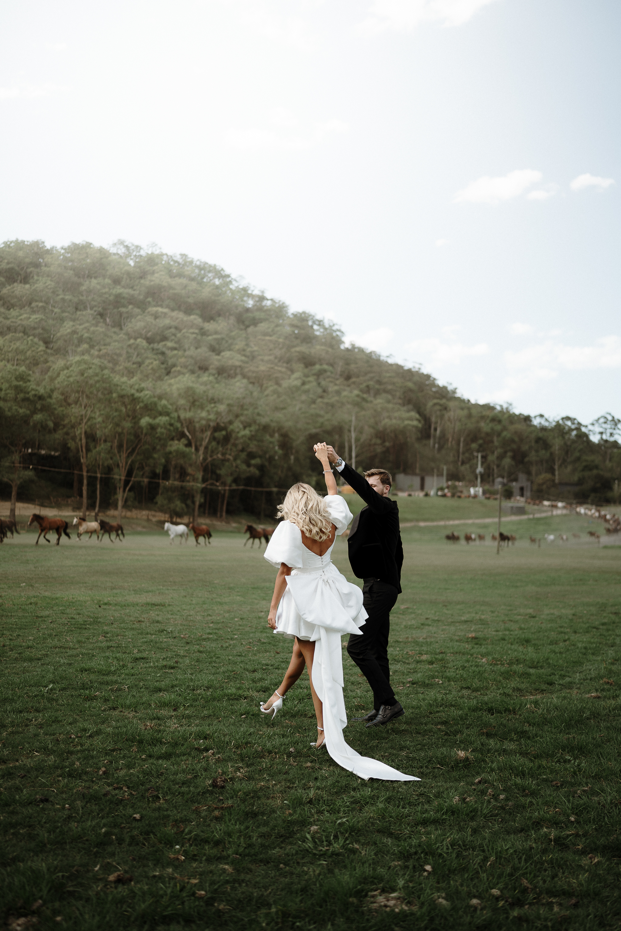 This beautiful photoshoot was done in the Glenworth valley weddings venue! If you are interested in shooting with horses and a beautiful landscape near Sydney, this is the place to be! All the things you see in this photoshoot, the car, dresses, suits, shoes, cake, champagne tower and the beautiful couple have all helped this shoot to achieve this beautiful look! I will post them all below as I highly recommend using these vendors! Car: @caddychicevents/ Bow dress: @kwhbridal/ Lace dresses: @grace_loves_lace/ Suits: @thdr_co/ Bridal shoes: @harloau/ Cake: @_sammiecakes